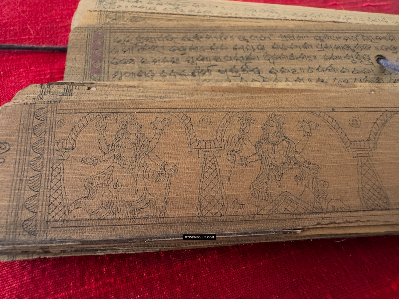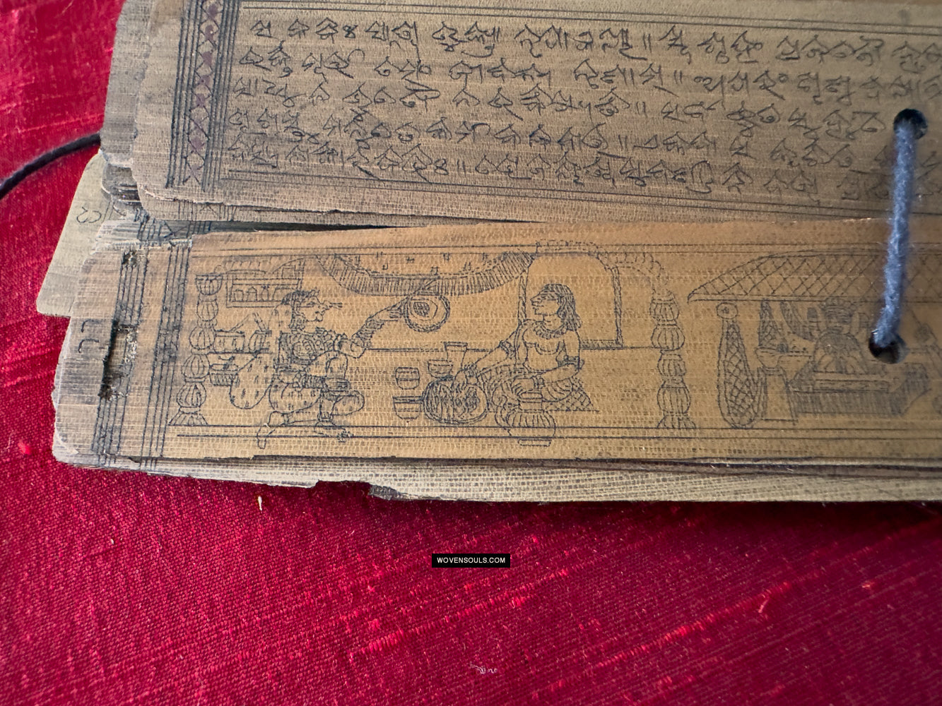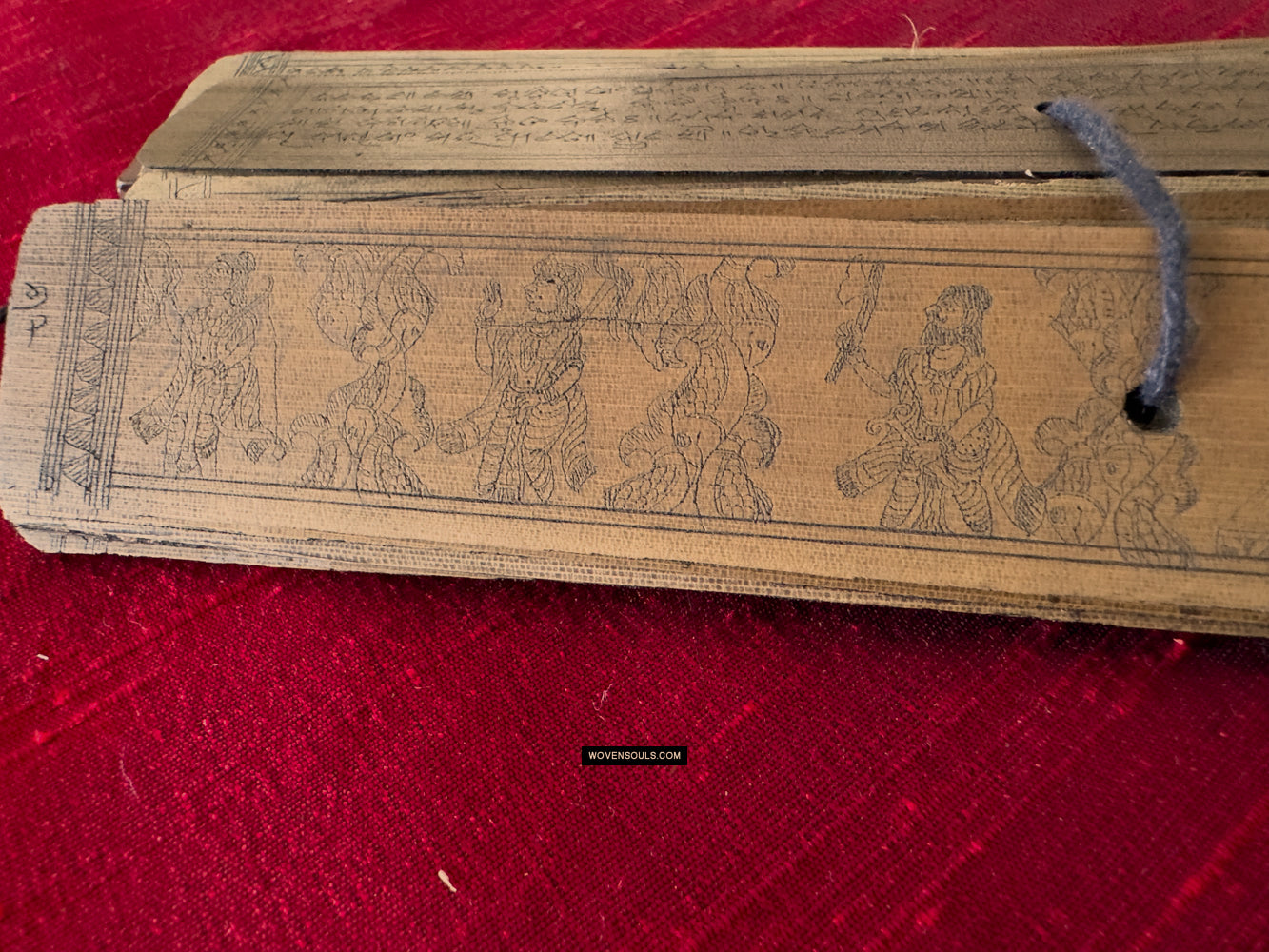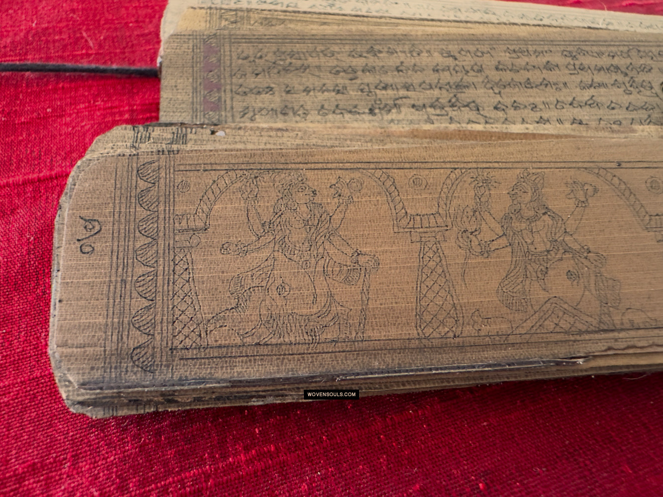 This palm leaf set from Odisha, India contains a text narration accompanied by skillful drawing of the epic poem Geet Gobind by Jayadev. The colors seen on several of the borders are an unusual embellishment.