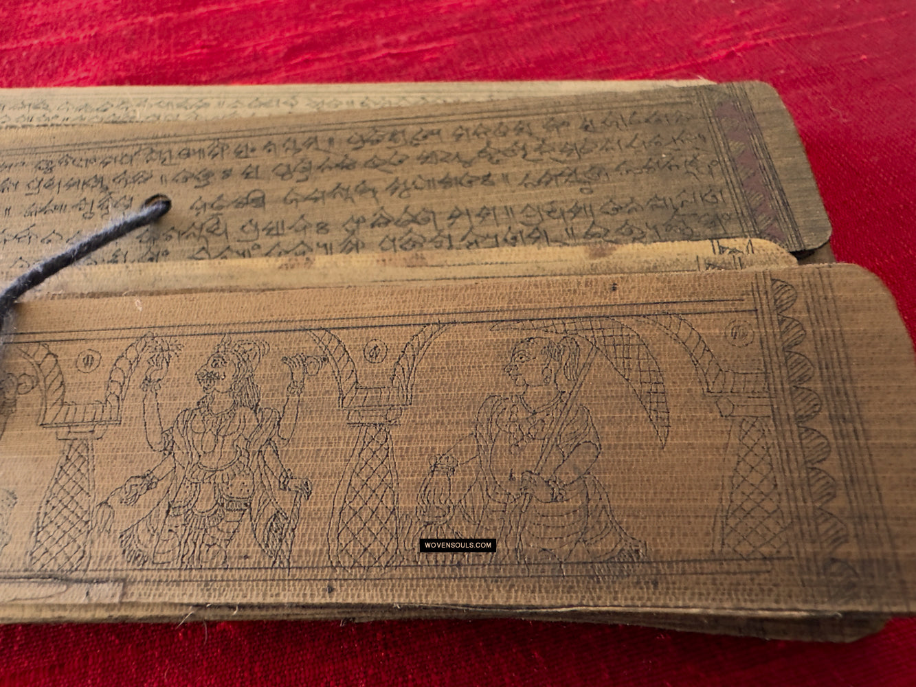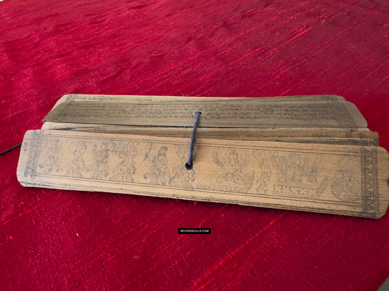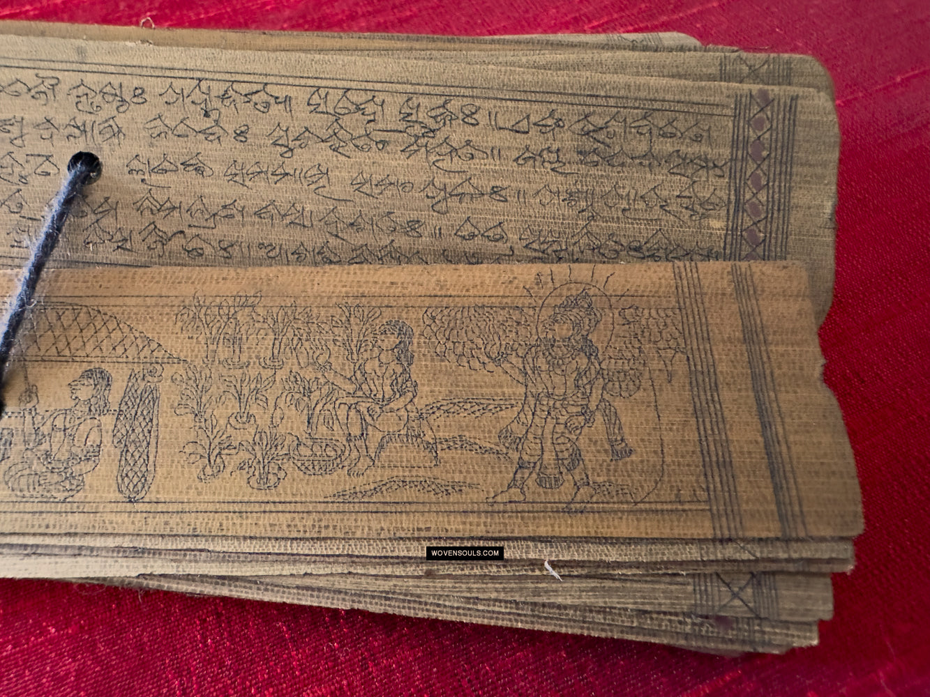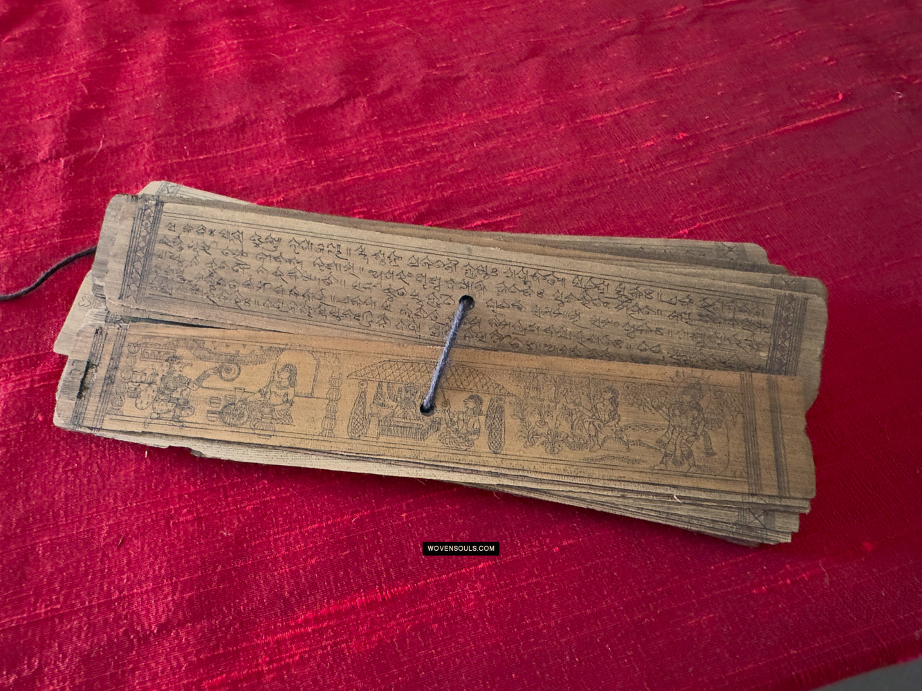 This palm leaf set from Odisha, India contains a text narration accompanied by skillful drawing of the epic poem Geet Gobind by Jayadev. The colors seen on several of the borders are an unusual embellishment.