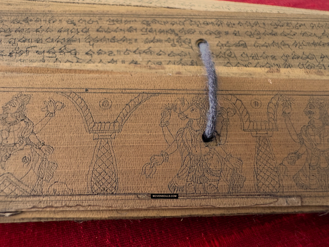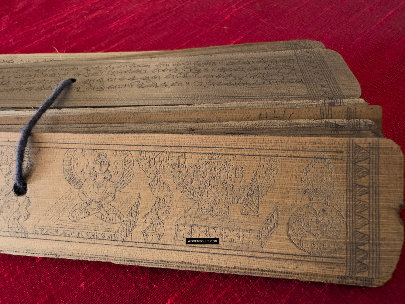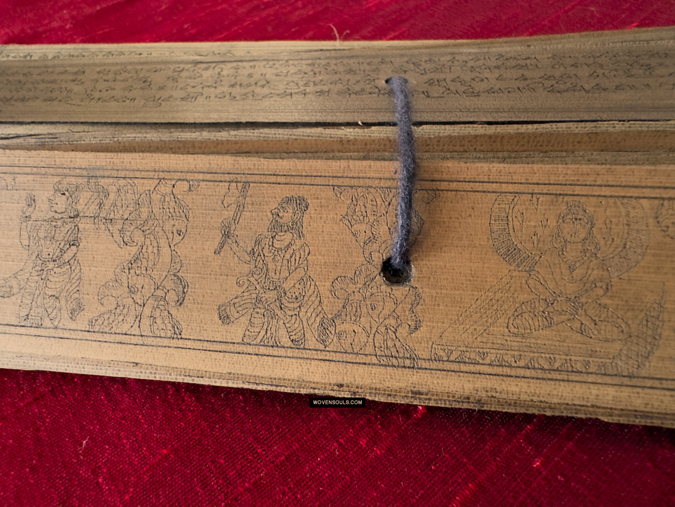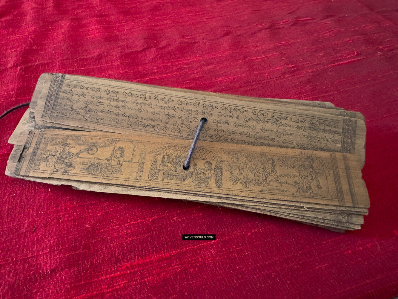 This palm leaf set from Odisha, India contains a text narration accompanied by skillful drawing of the epic poem Geet Gobind by Jayadev. The colors seen on several of the borders are an unusual embellishment.