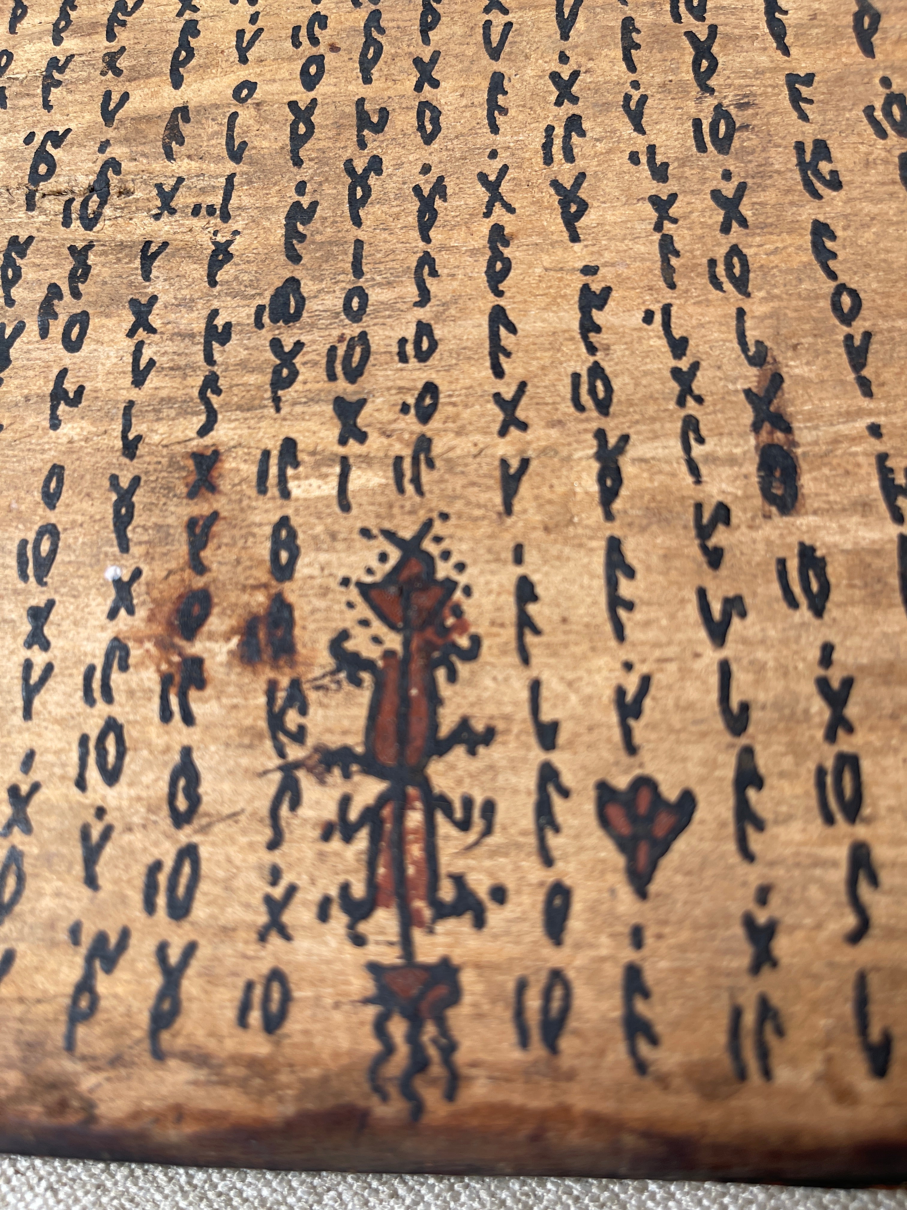 It is written in Batak script, only used by datu (priests) to write magical texts and calendars.