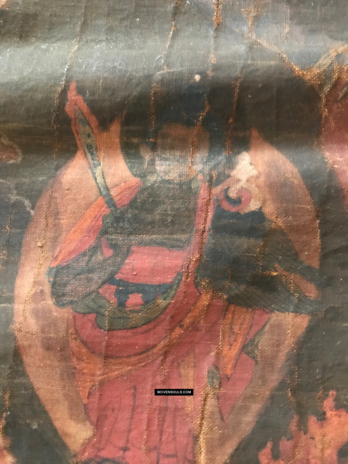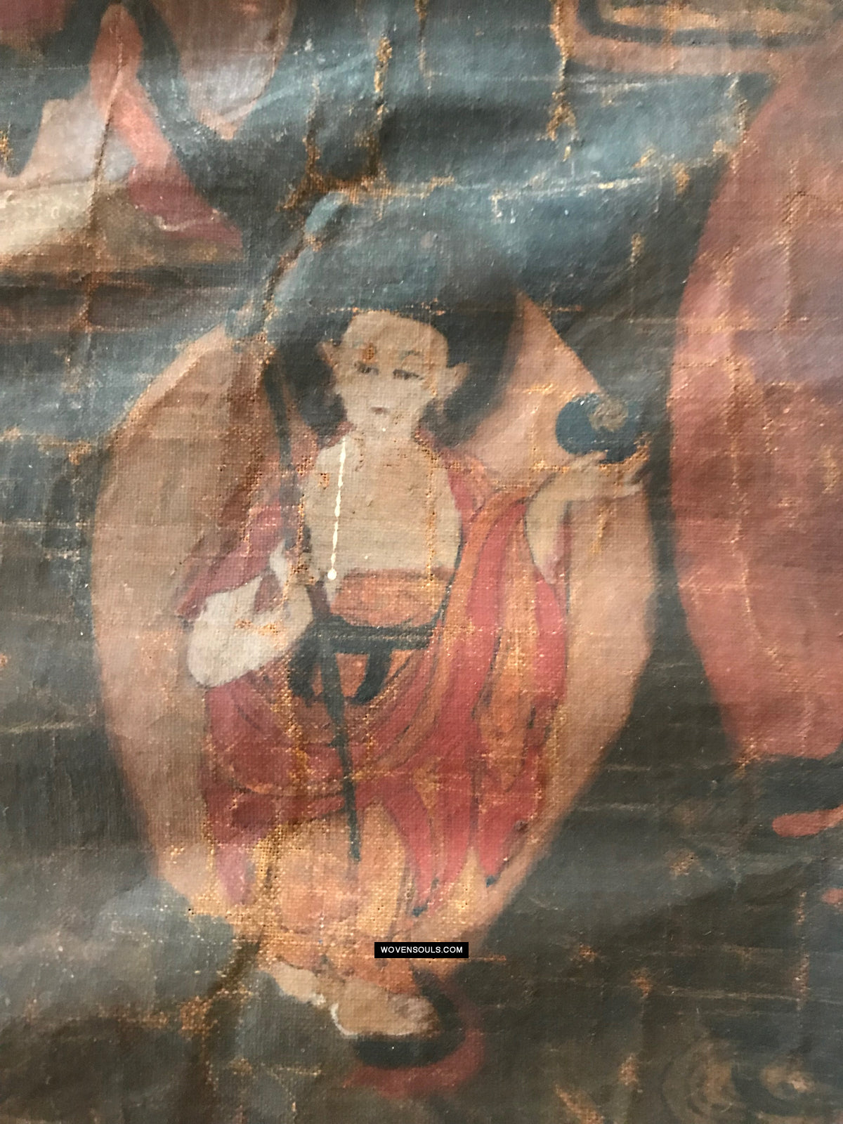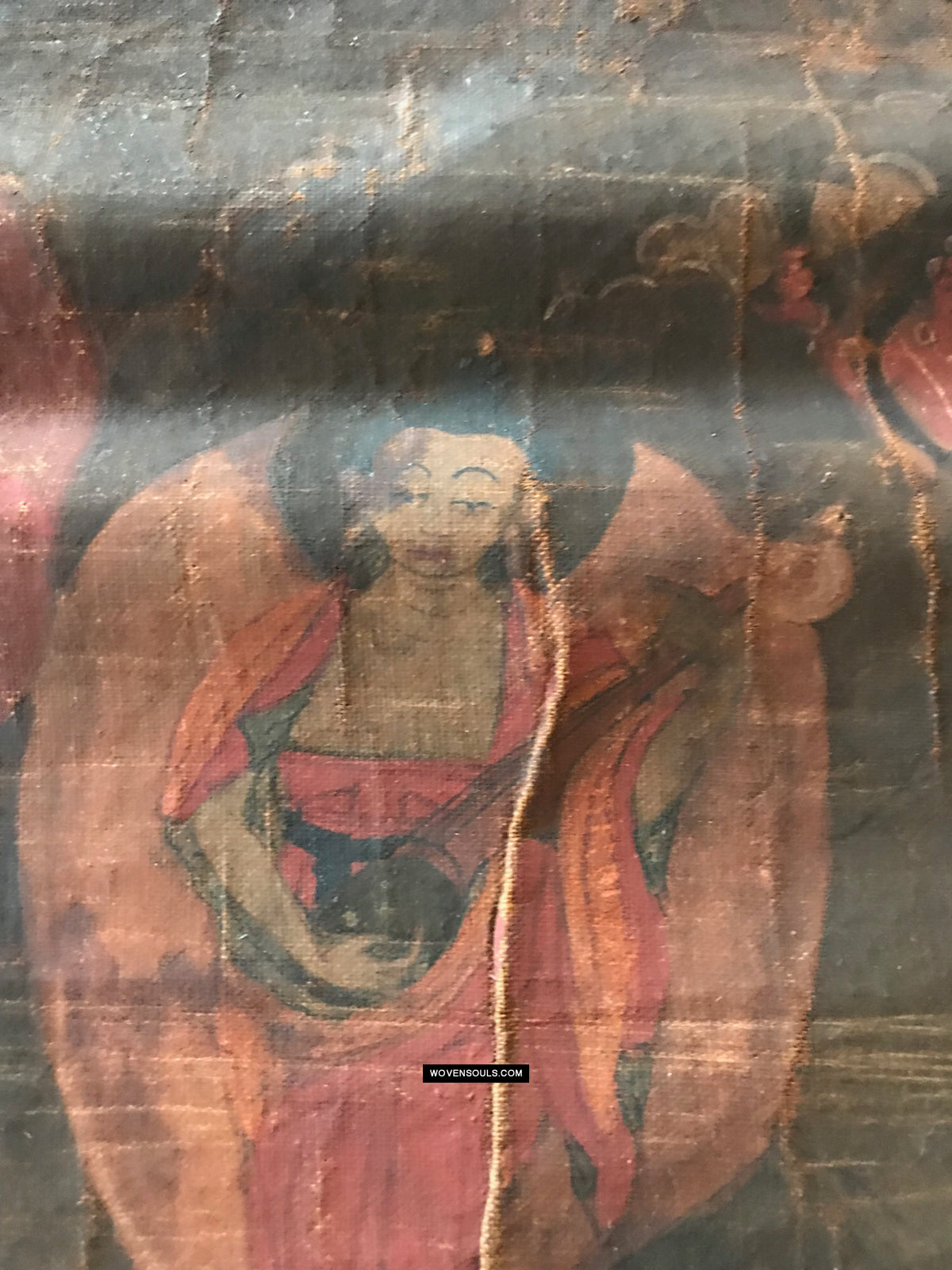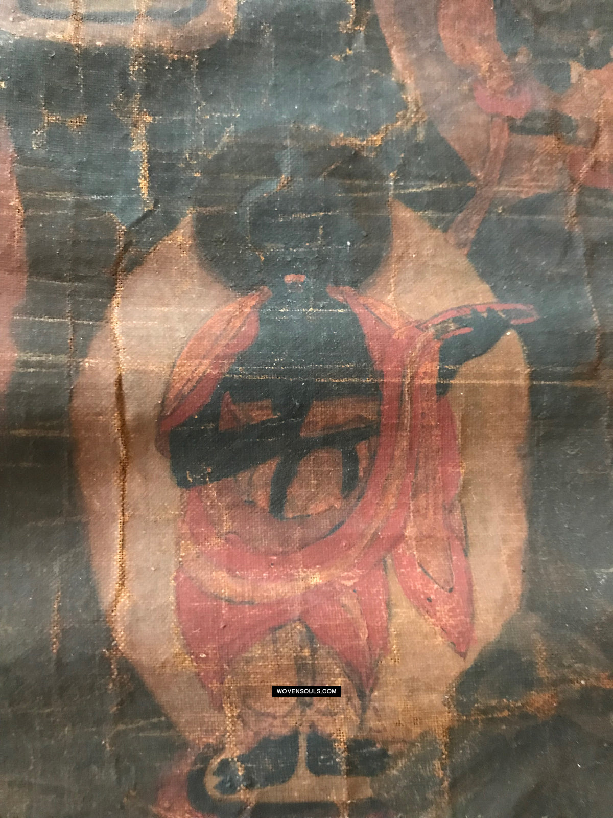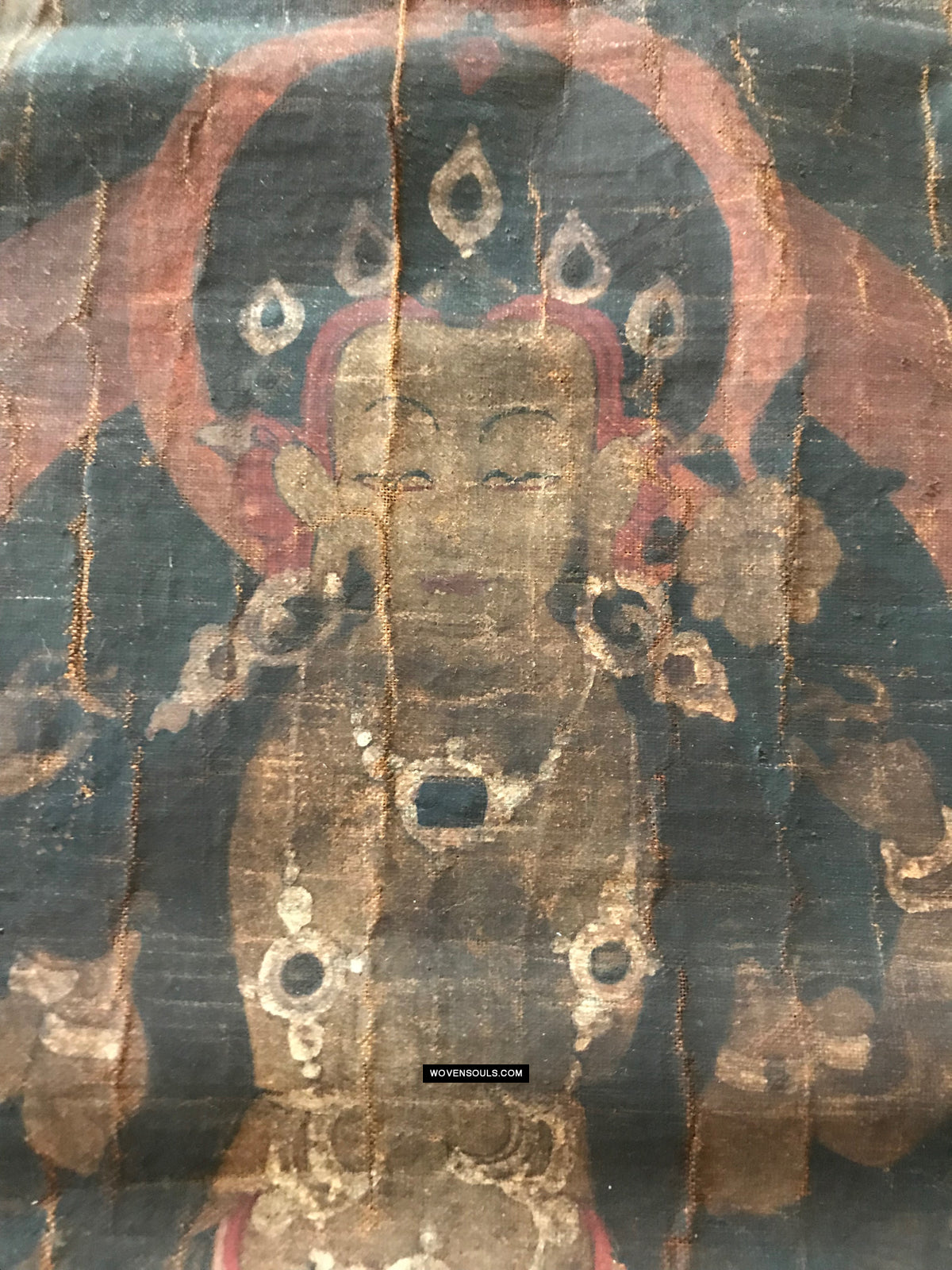 Overall even browning with age and the appearance matches that of thangkas seen in situ in the some of the oldest monasteries in the Himalayas.