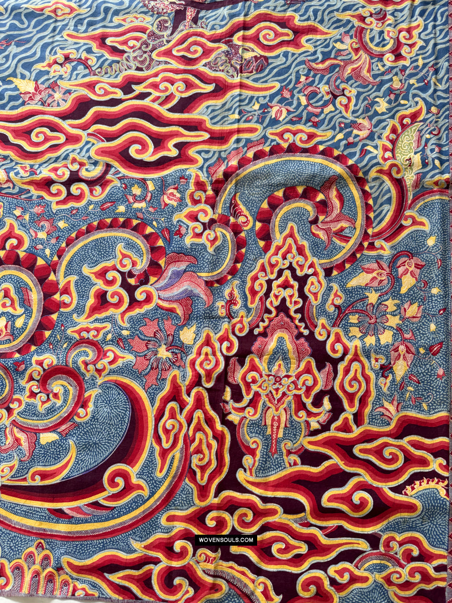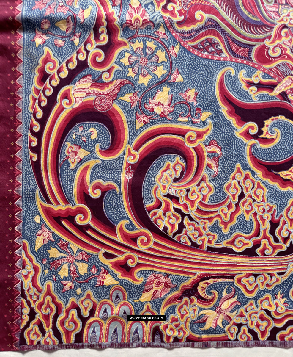 The depiction of the clouds (mega mendung) is typical of the batiks of Cirebon in Java, Indonesia. Also seen in the bottom right corner is the 'wadasan' motif - representing a broken coral rock - an ornamental architecttural feature seen only in Sunyaragi Cirebon in Indonesia.