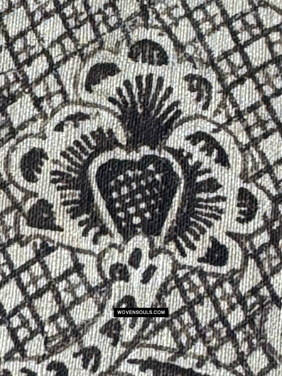 This fragment has been saved from a fire - therefore has burn marks present. Holes and stains. Edges not even. This fragment is one of several sections that have been saved from the same fire-struck cloth.