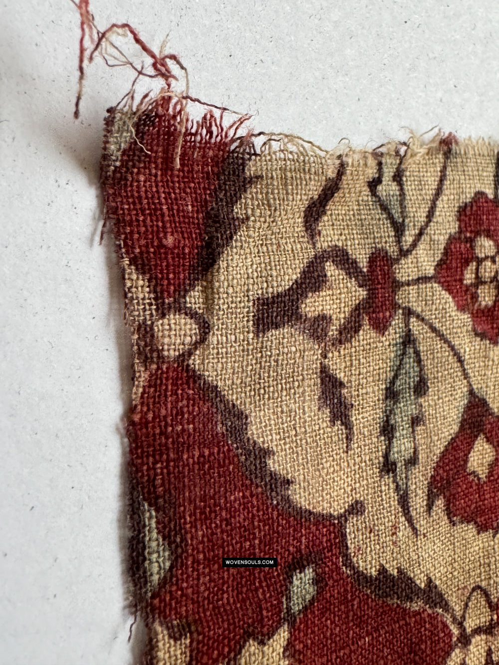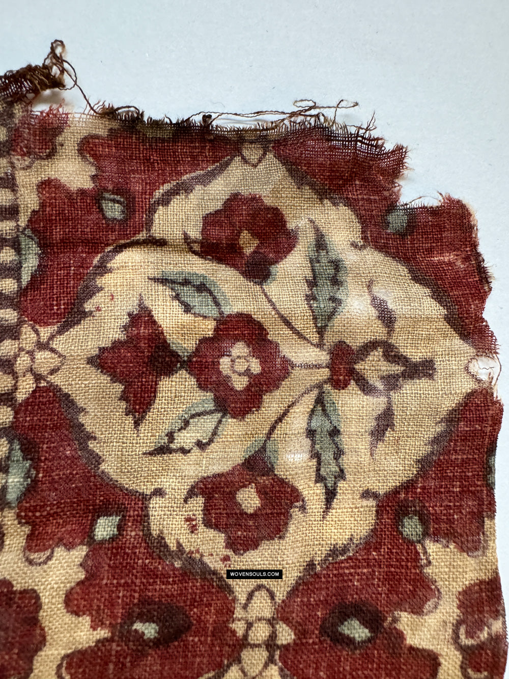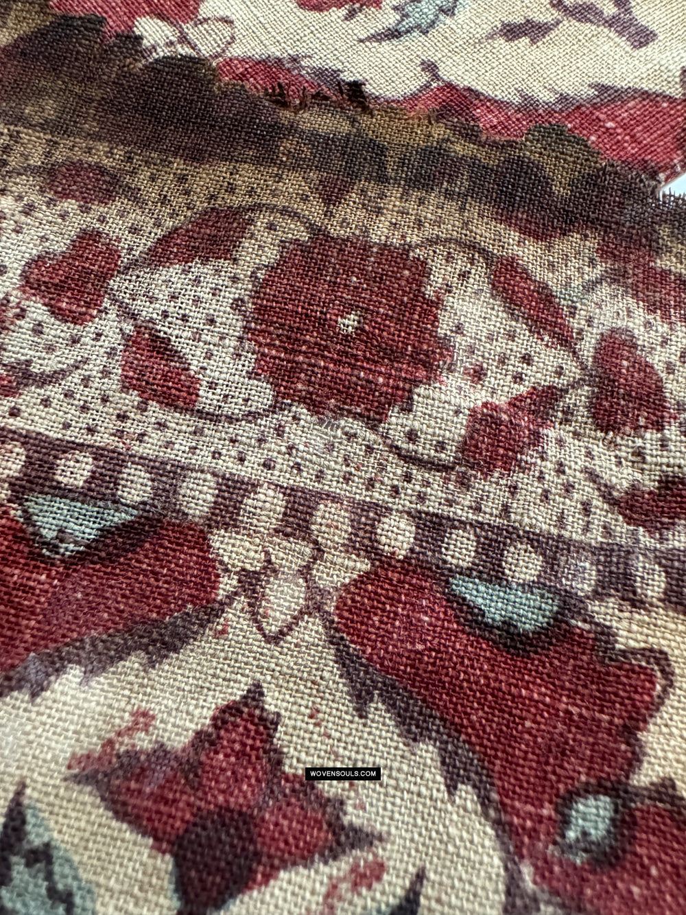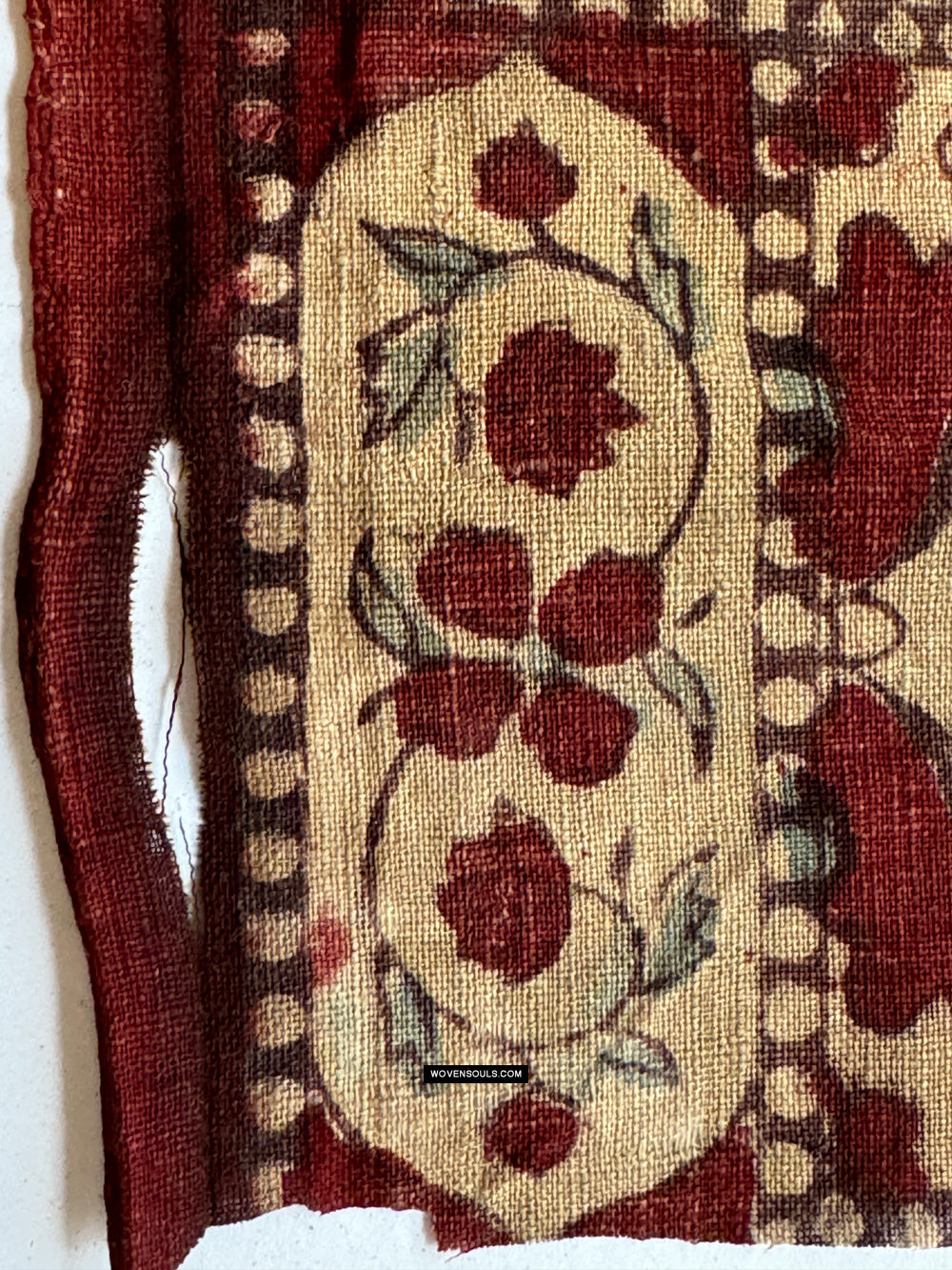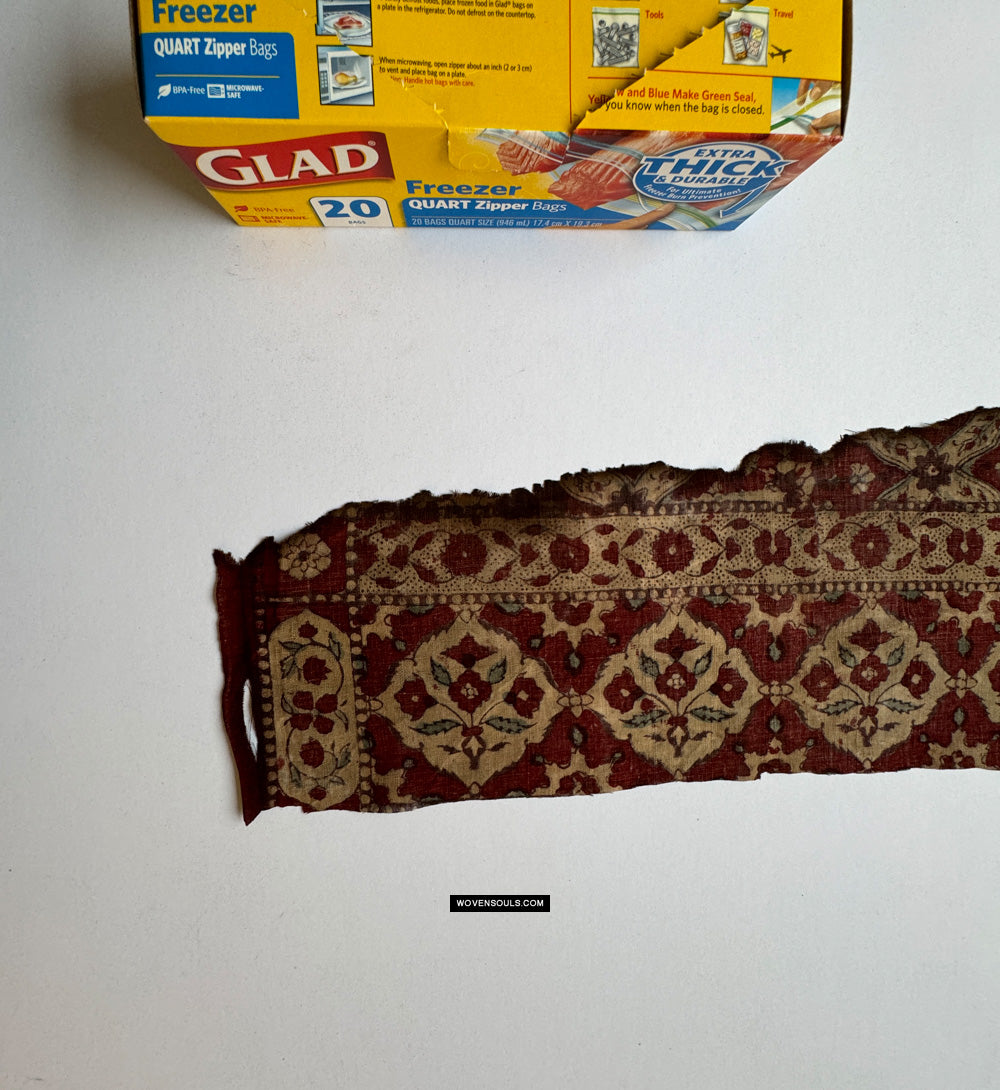This fragment has been saved from a fire - therefore has burn marks present. Holes and stains. Edges not even. This border fragment is one of the few sections that have been saved from the same fire-struck cloth.