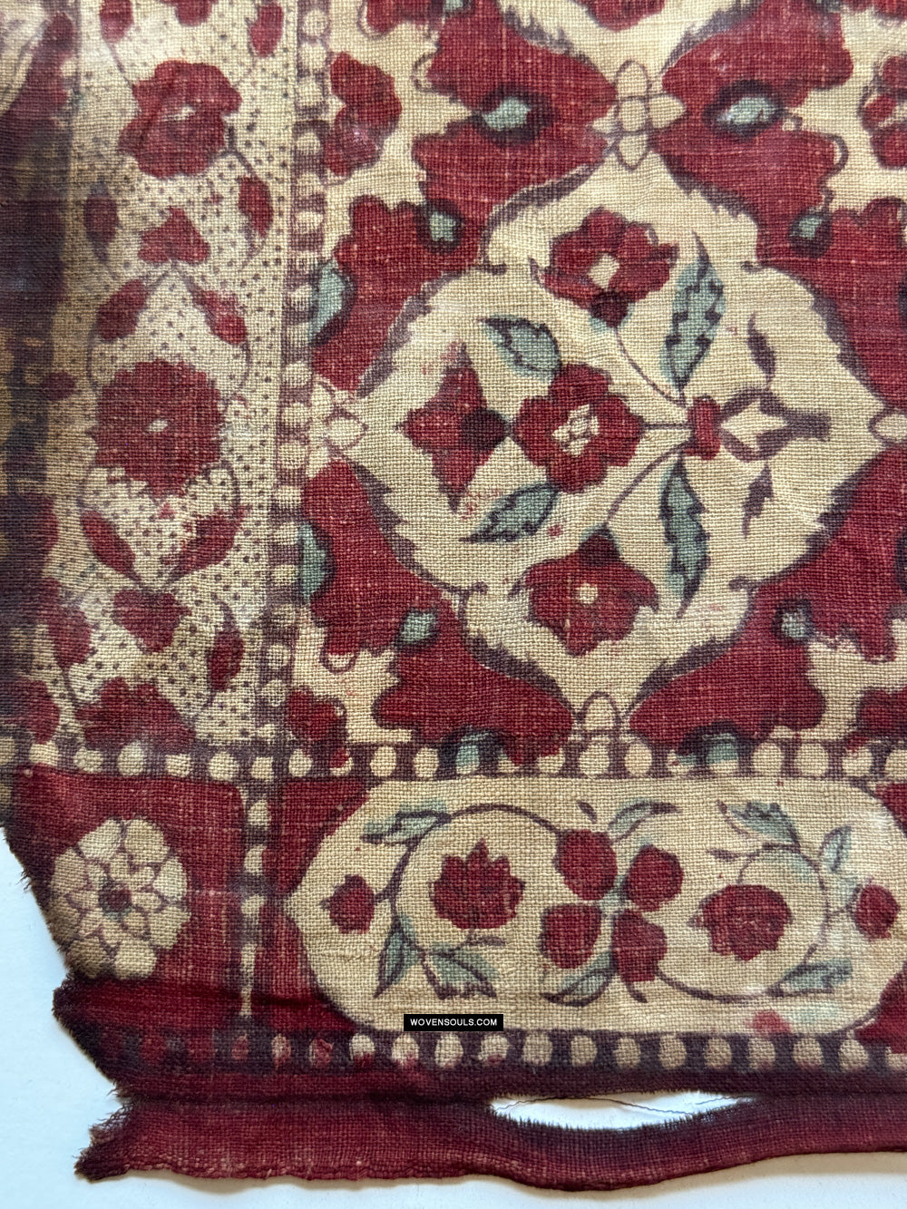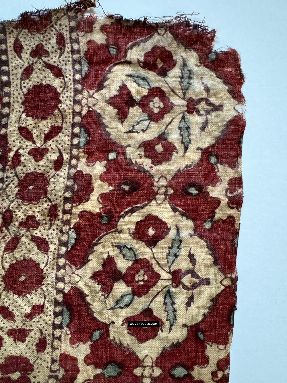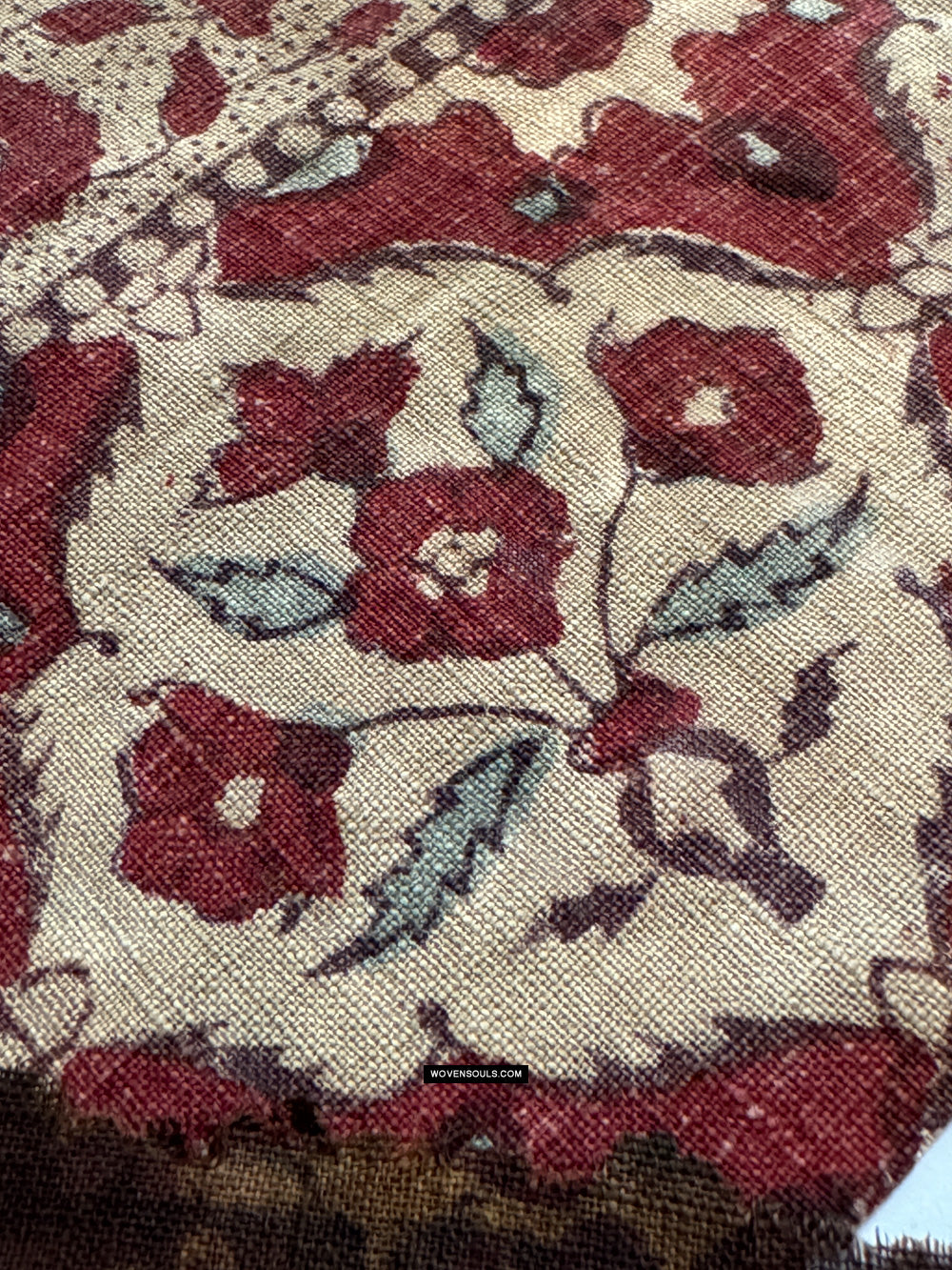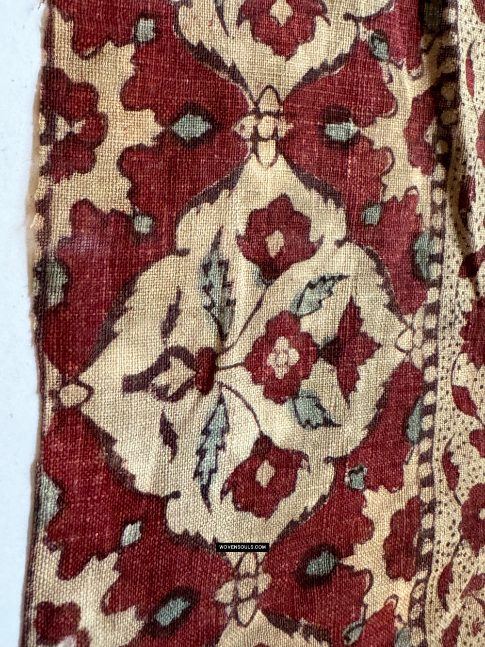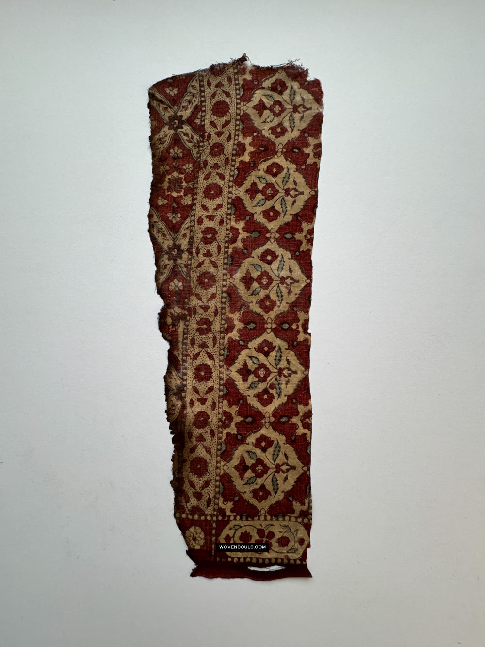 This fragment has been saved from a fire - therefore has burn marks present. Holes and stains. Edges not even. This border fragment is one of the few sections that have been saved from the same fire-struck cloth.