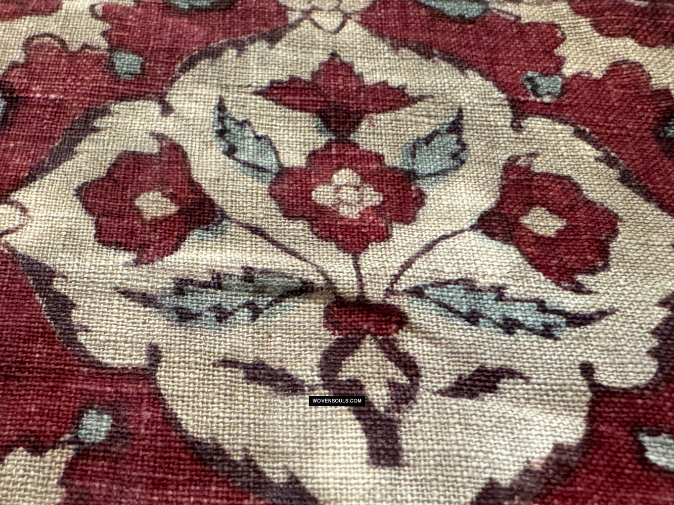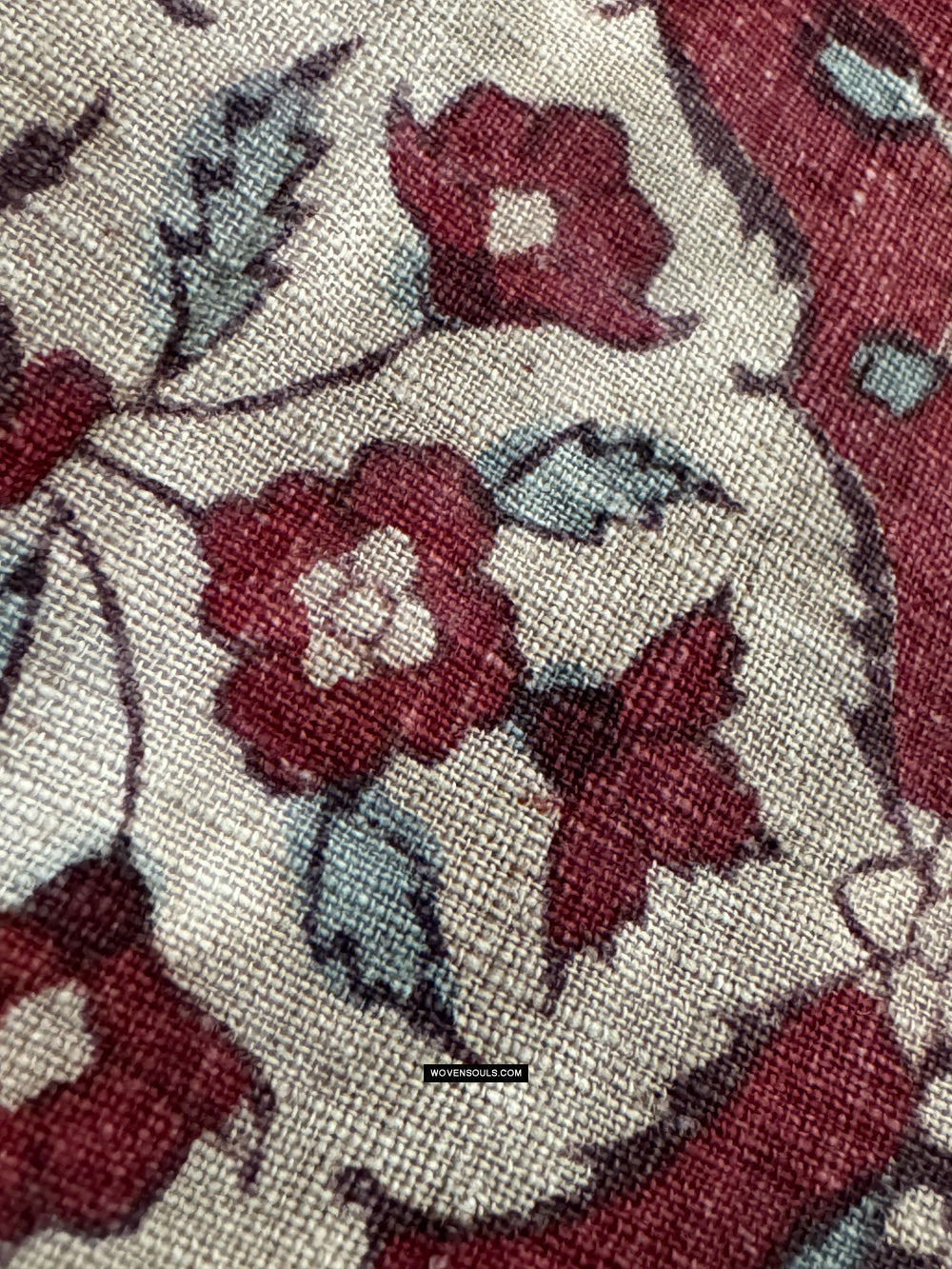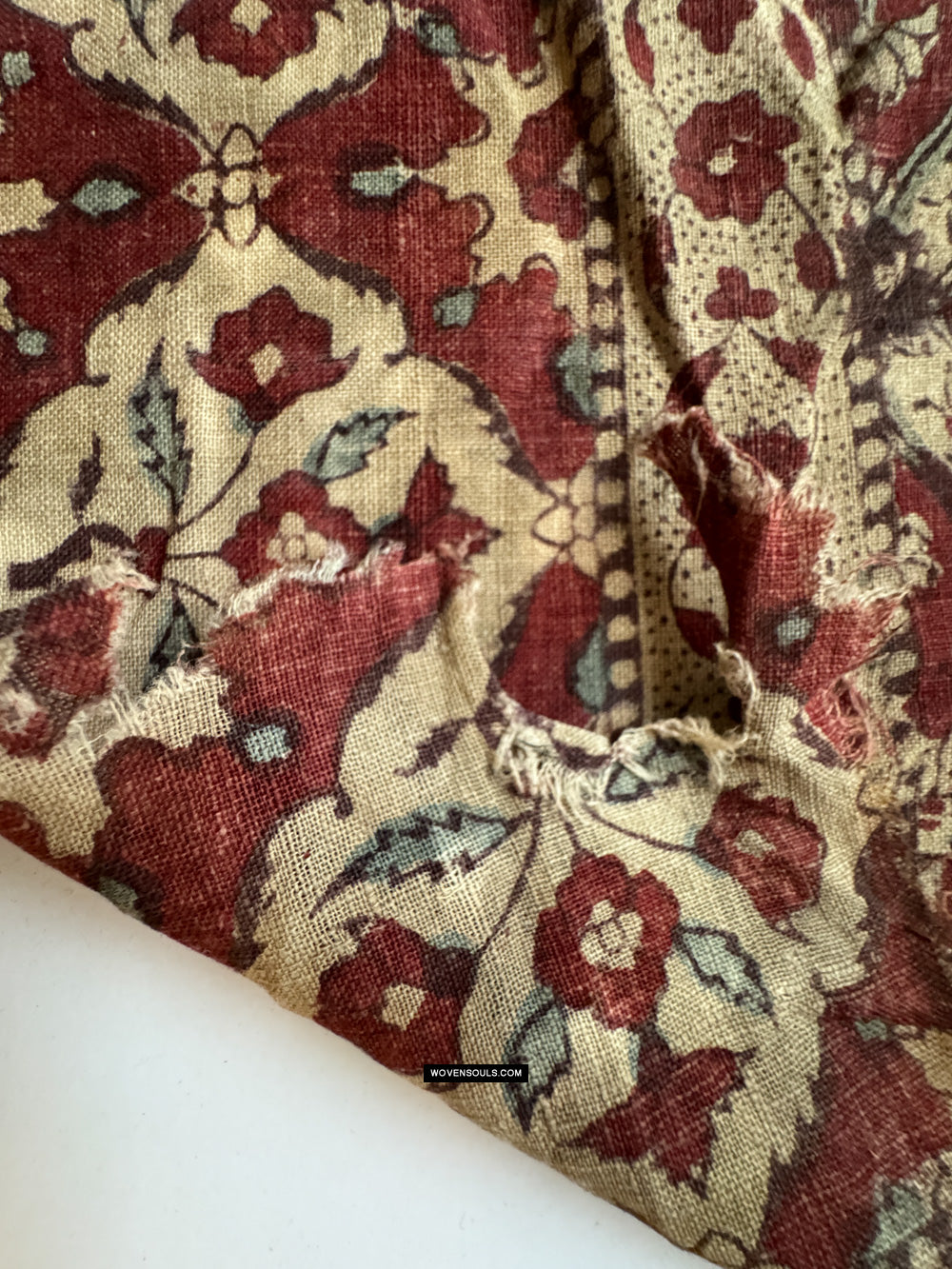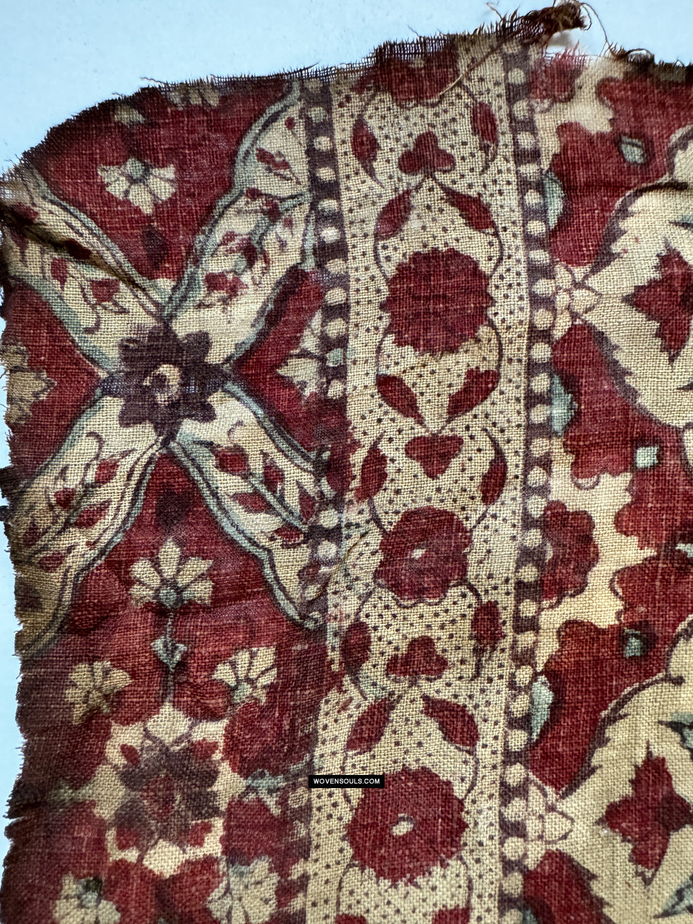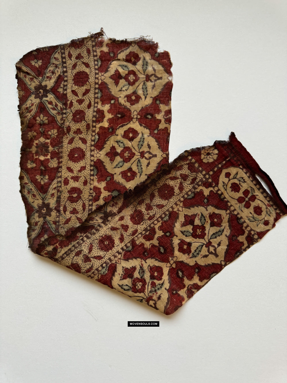 This fragment has been saved from a fire - therefore has burn marks present. Holes and stains. Edges not even. This border fragment is one of the few sections that have been saved from the same fire-struck cloth.