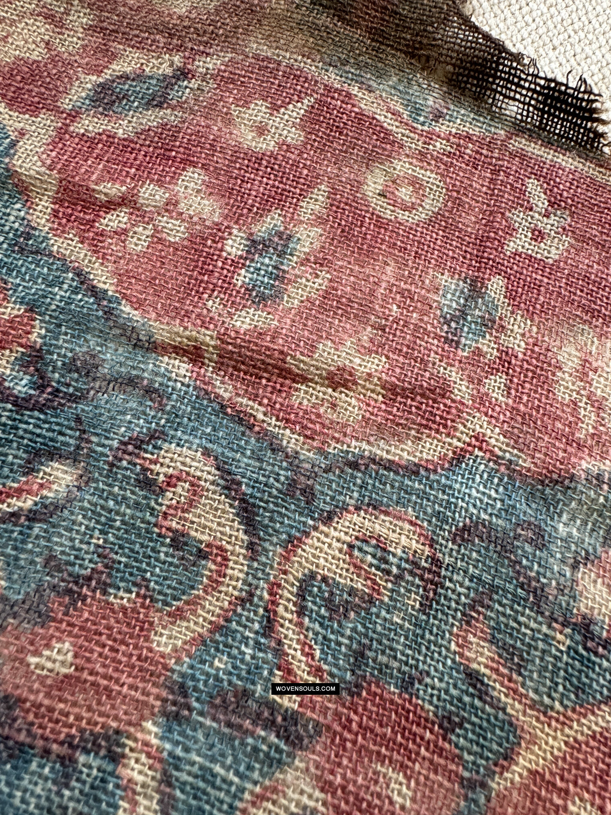 This fragment has been saved from a fire - therefore has burn marks present. Holes and stains. Edges not even. This fragment is one of several sections that have been saved from the same fire-struck cloth.