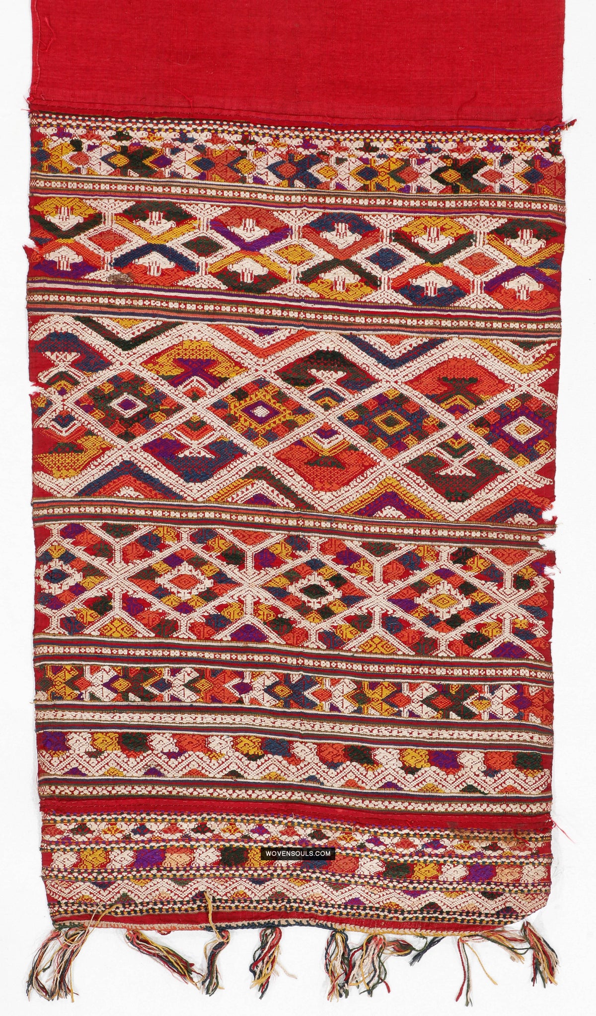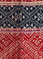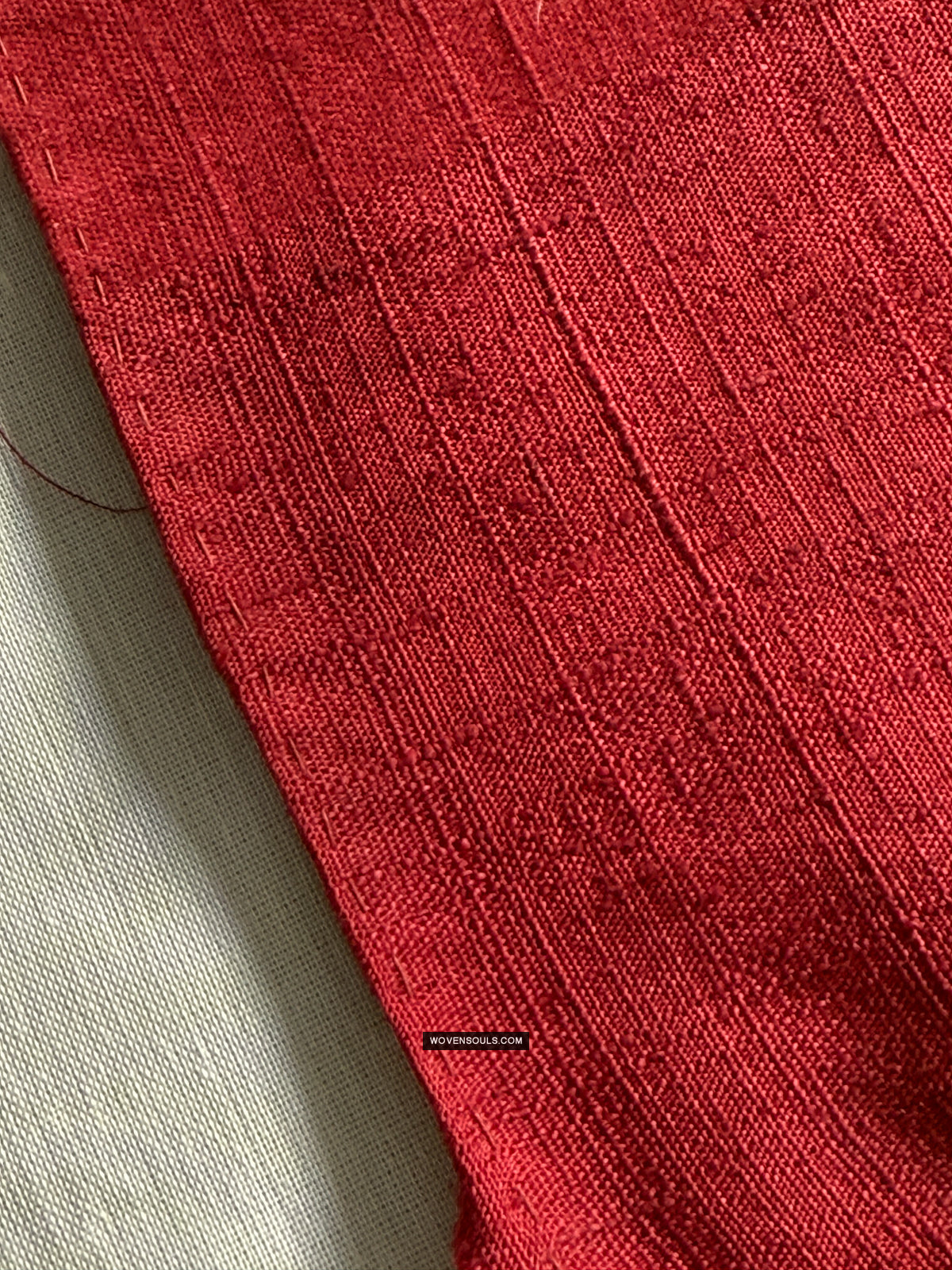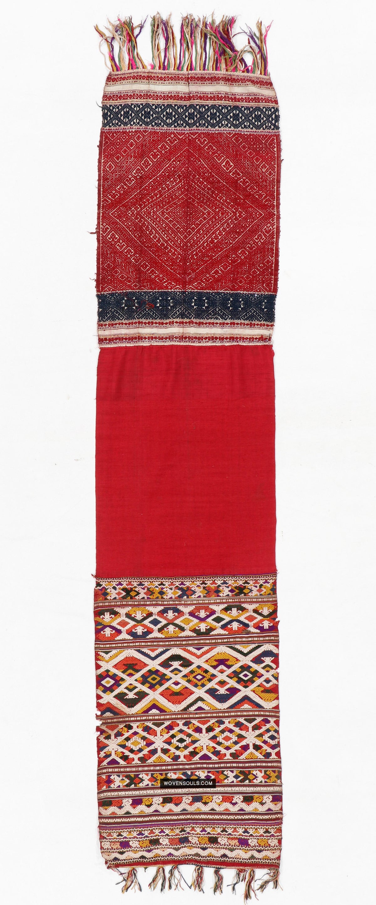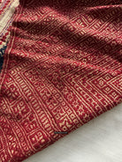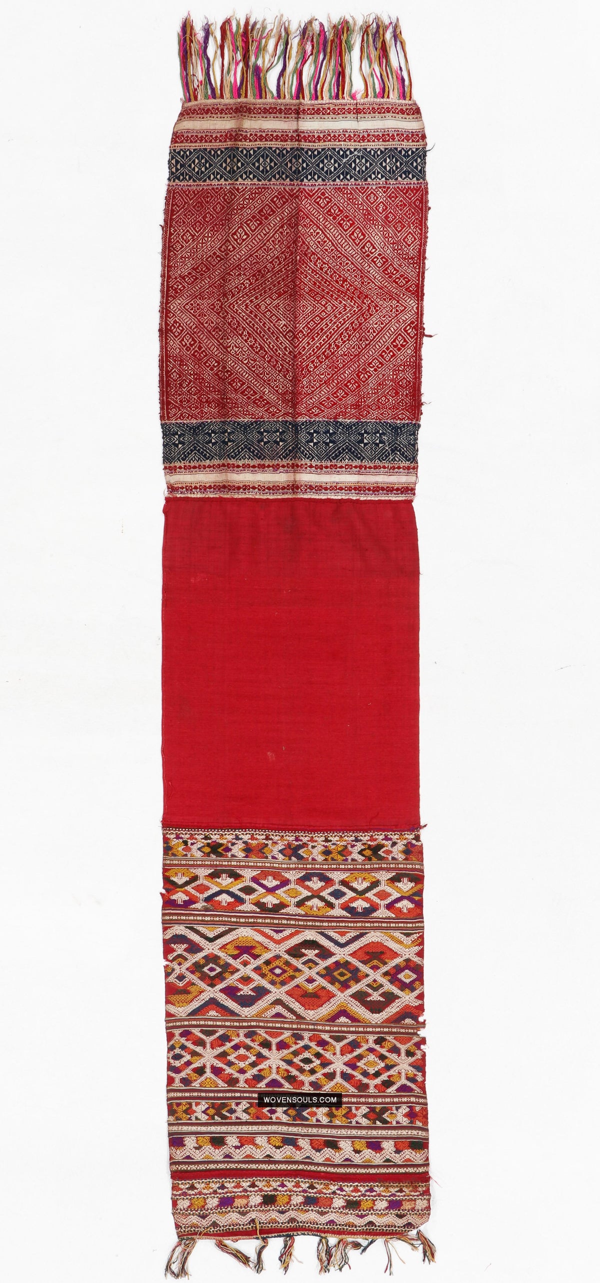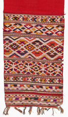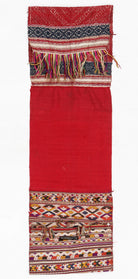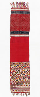 Two contrasting end panels with supplementary thread weaving, stitched to the central red silk base.