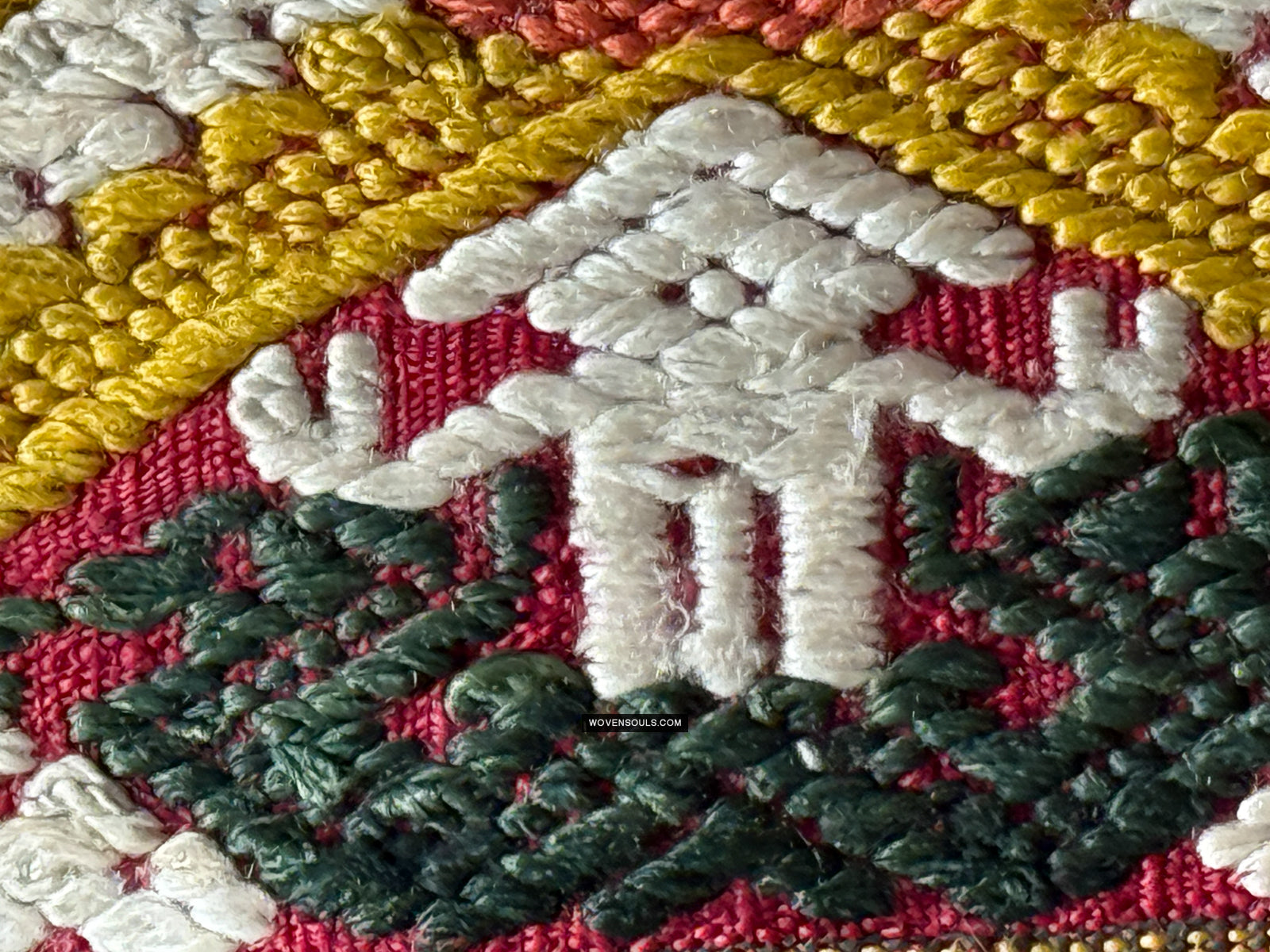 Mythological motifs beautifully interwoven to create a dense pattern at the two ends of the textile.