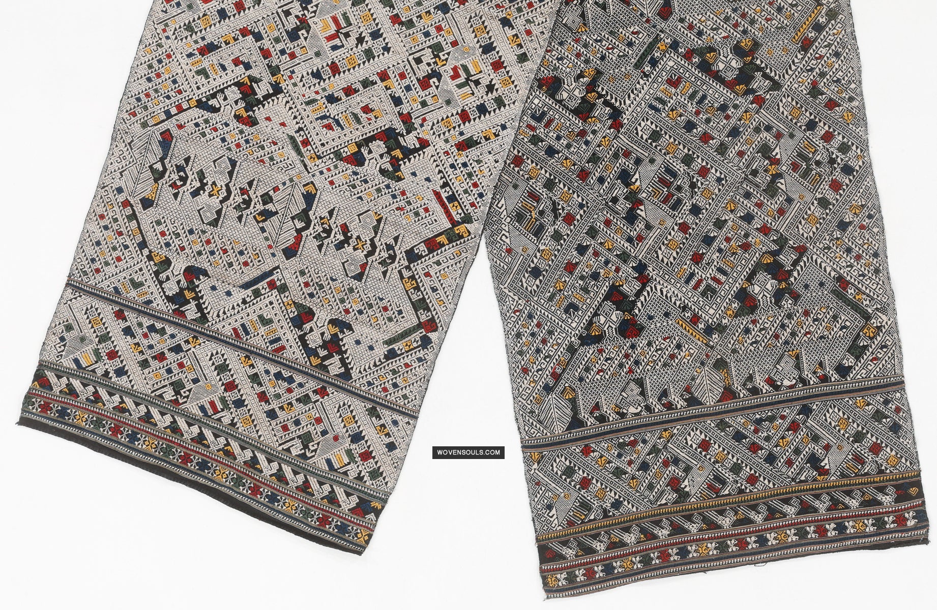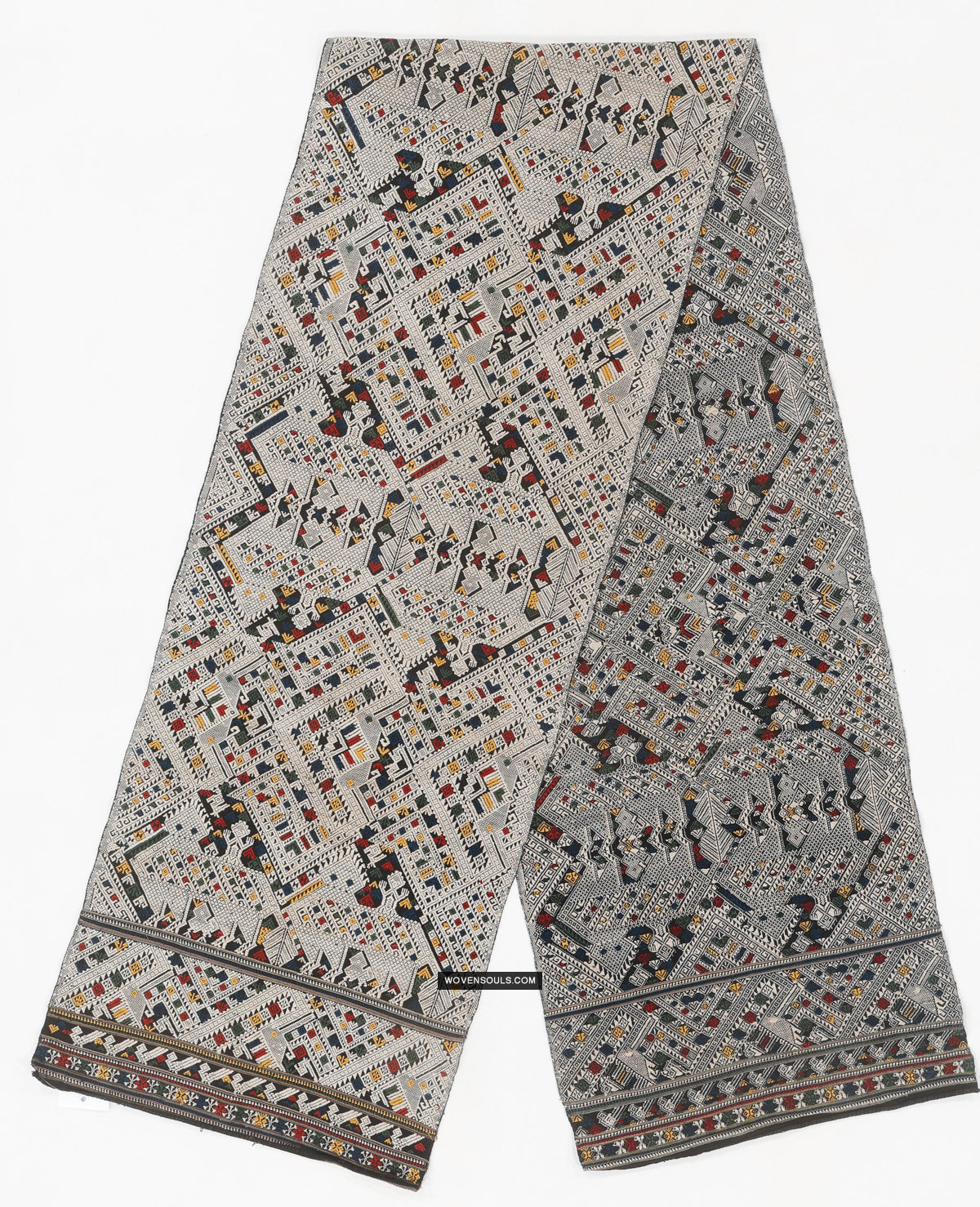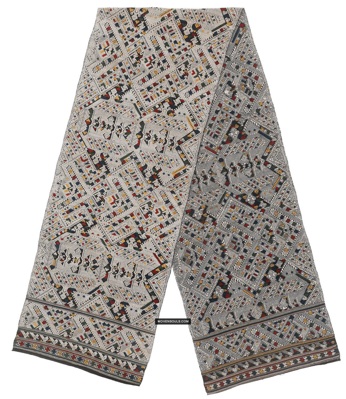 Mythological motifs beautifully interwoven with geometric motifs to create a dense pattern all over the textile.