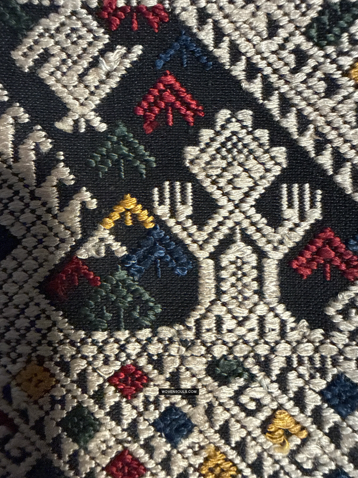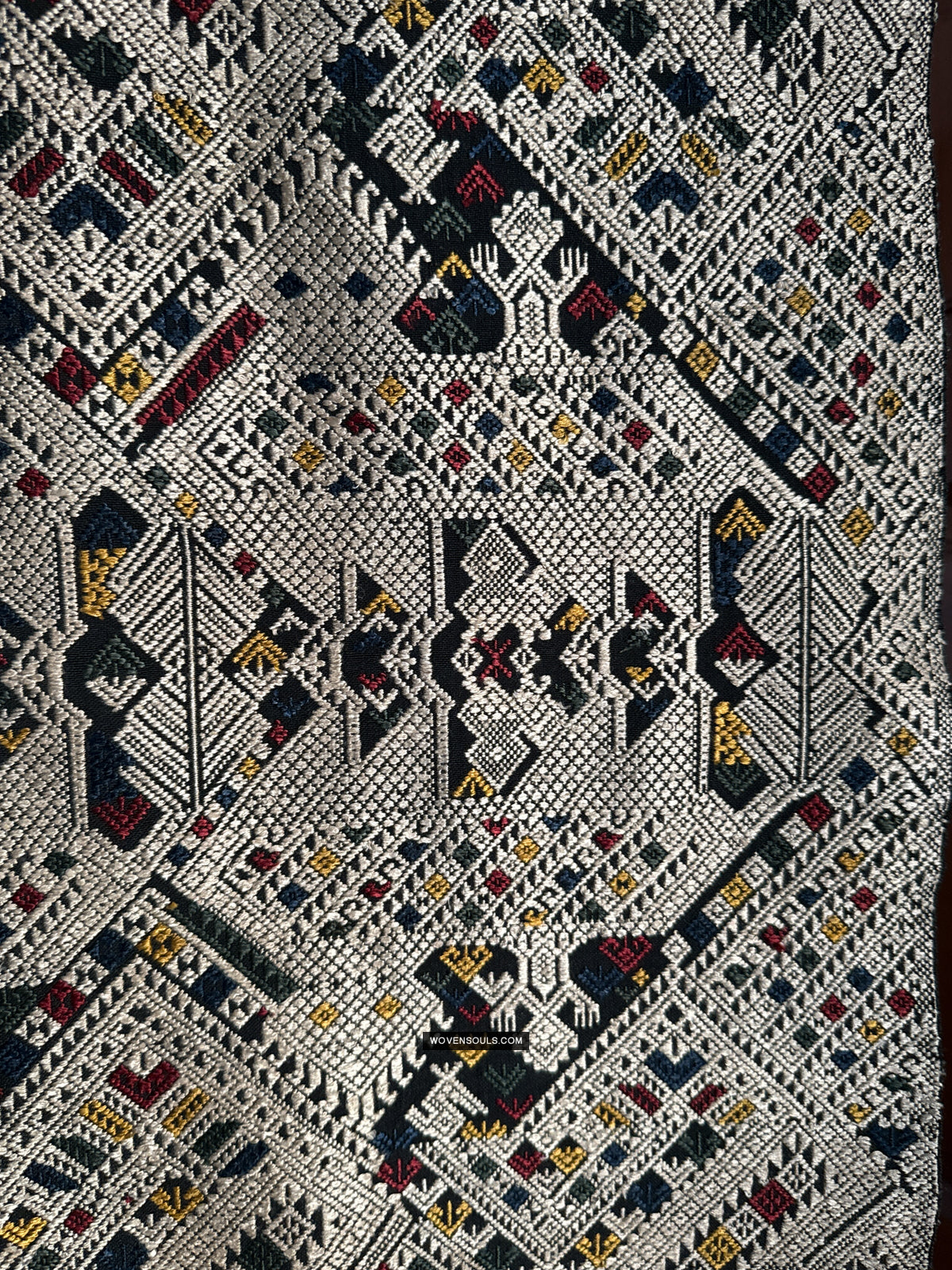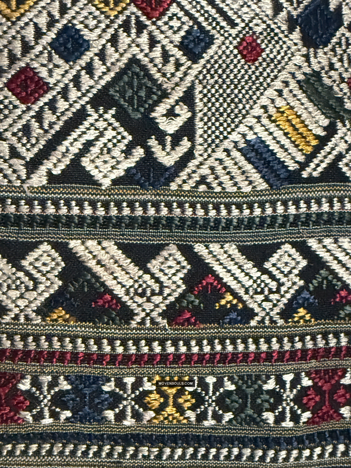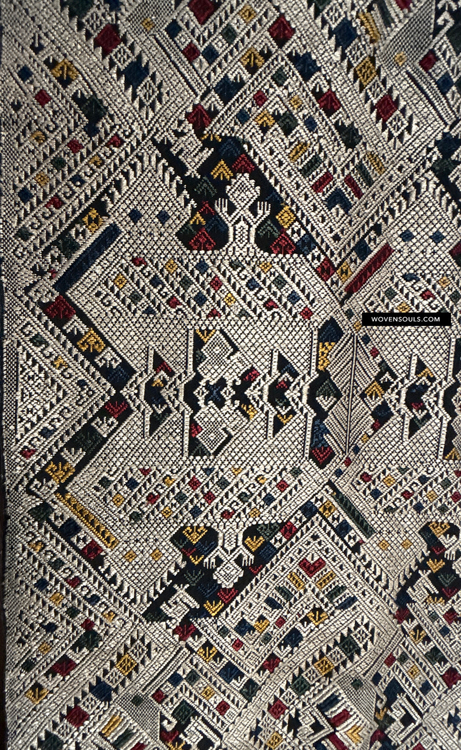 The number of colors of supplementary silk thread used in the weaving composition directly impacts the complexity of the mechanics of weaving it - the more colors used the longer it takes to weave it. In this gorgeous textile 4 colors have been used all over the piece!