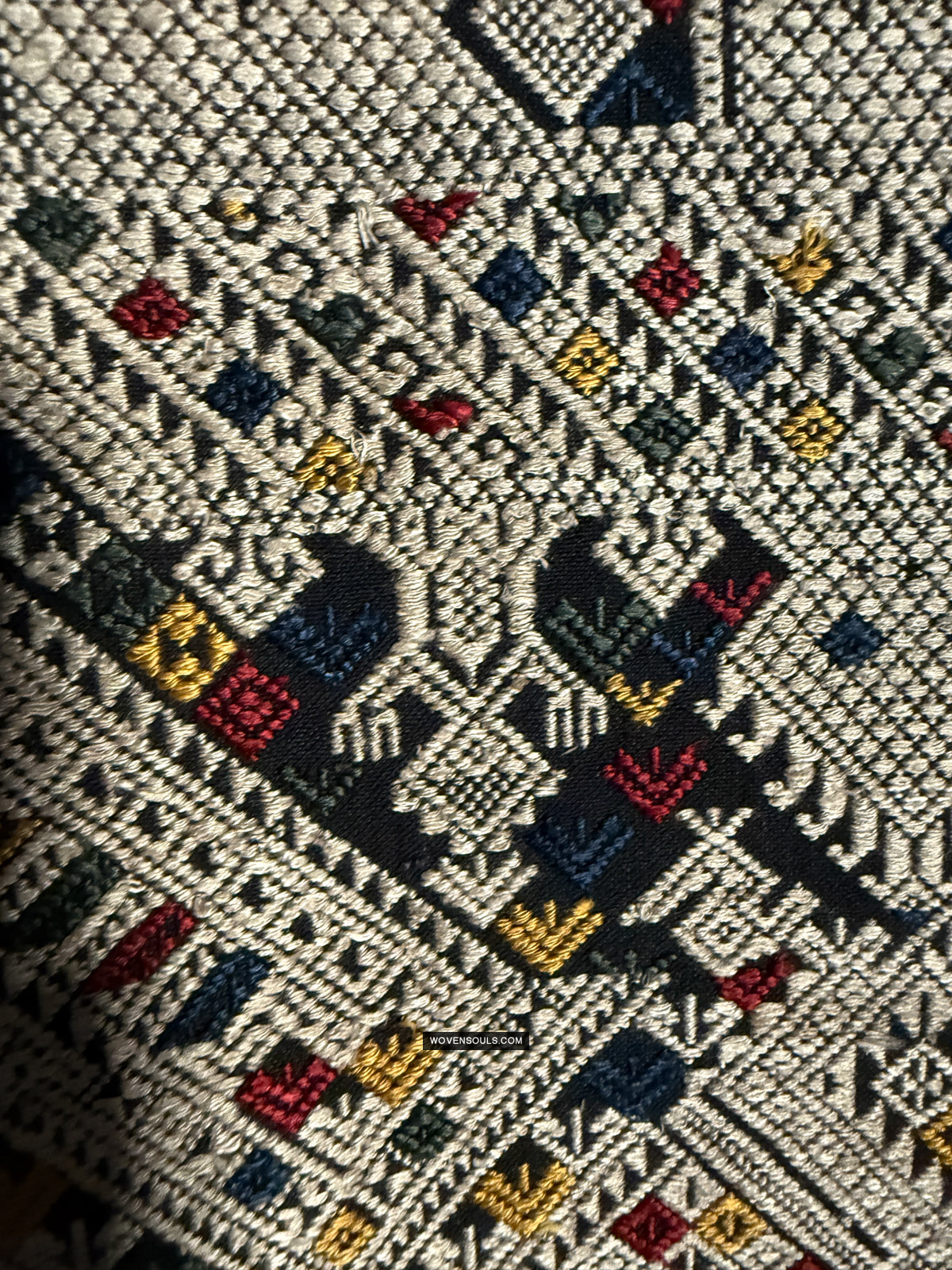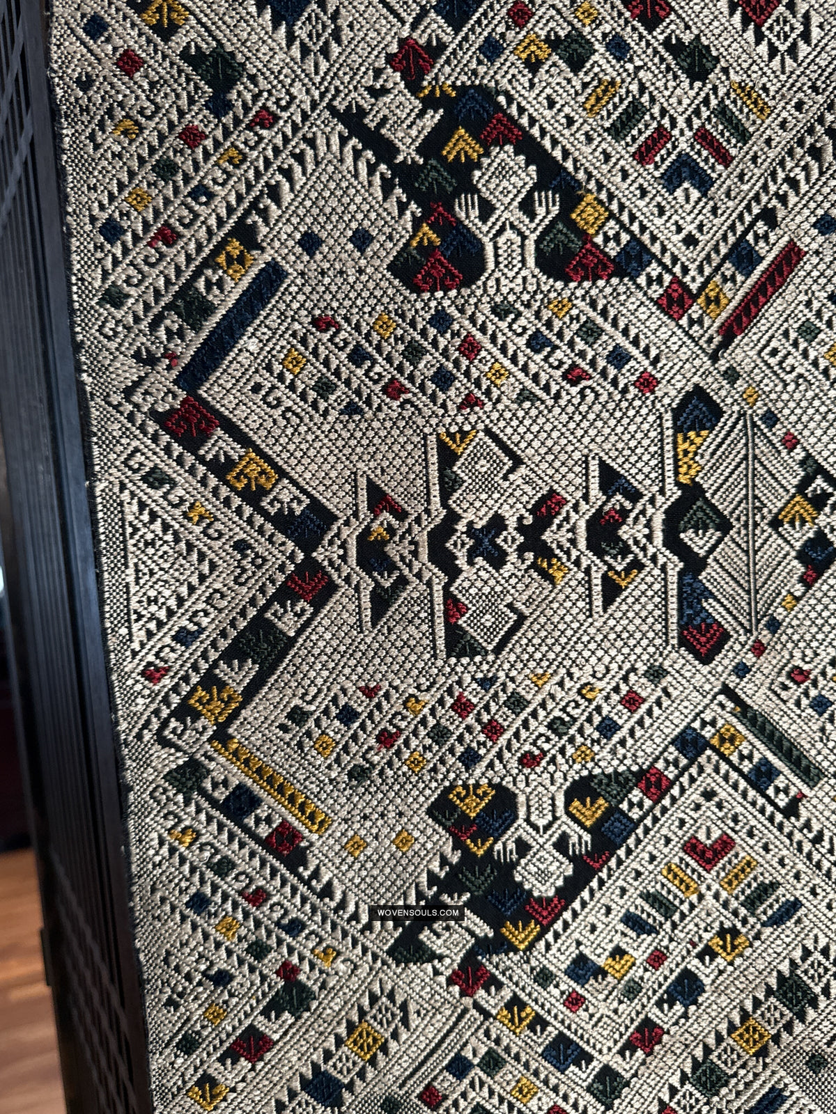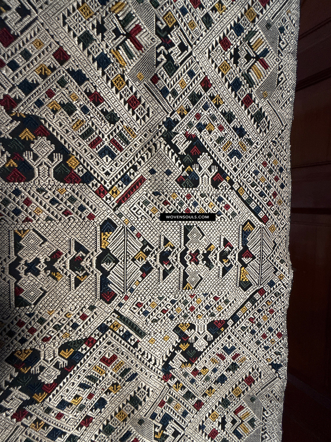 The number of colors of supplementary silk thread used in the weaving composition directly impacts the complexity of the mechanics of weaving it - the more colors used the longer it takes to weave it. In this gorgeous textile 4 colors have been used all over the piece!