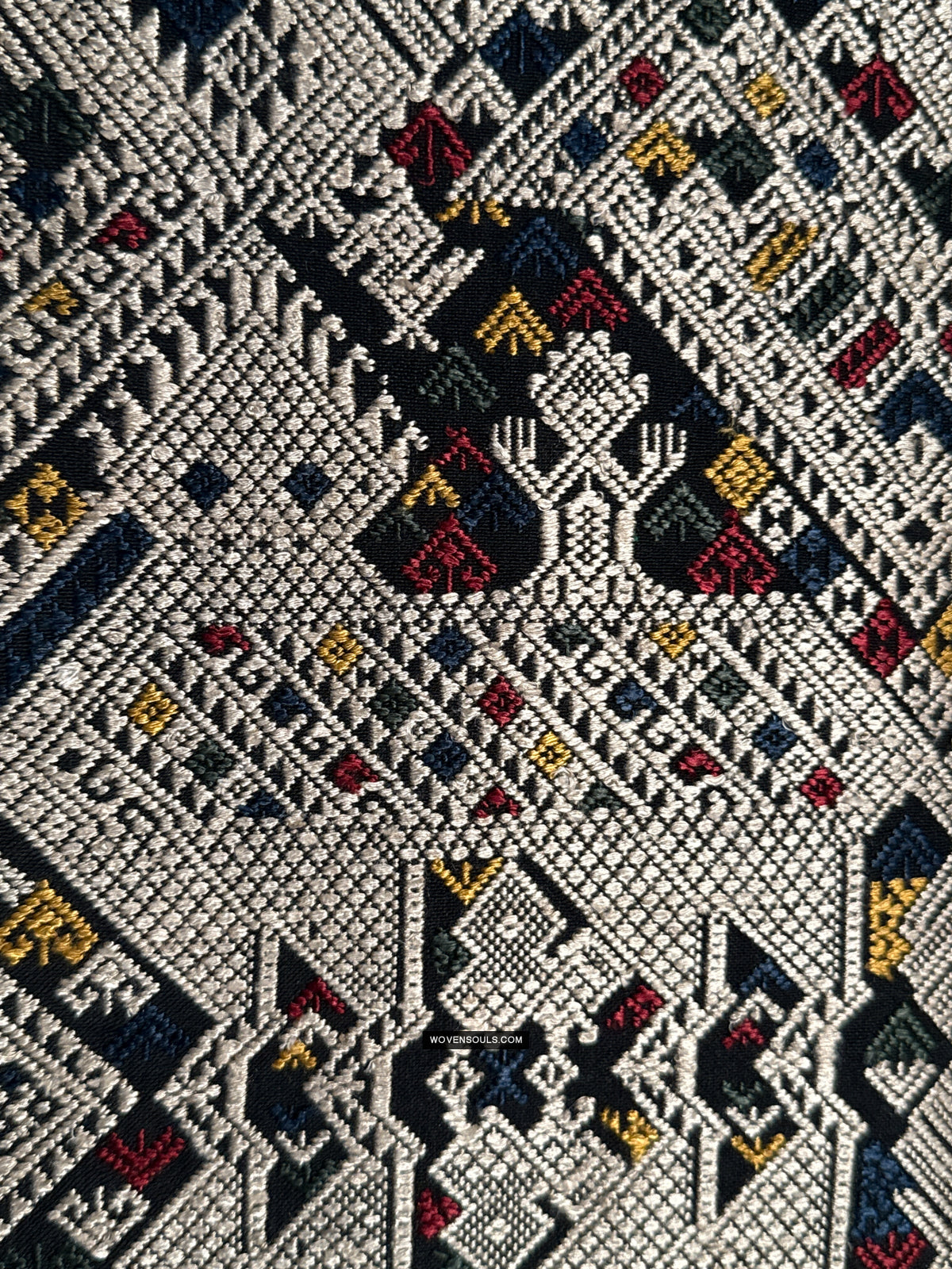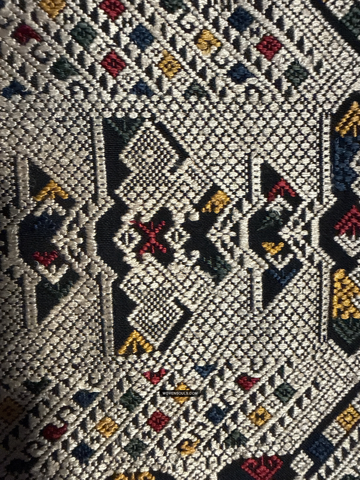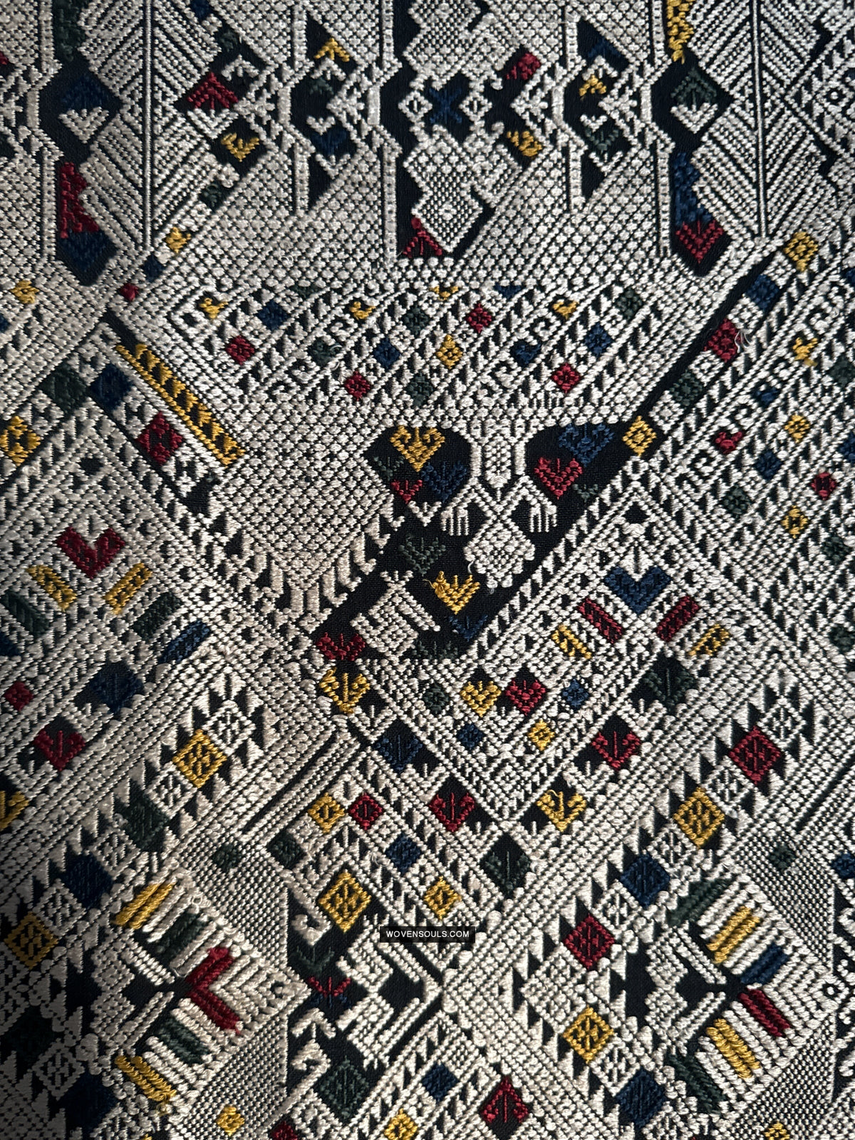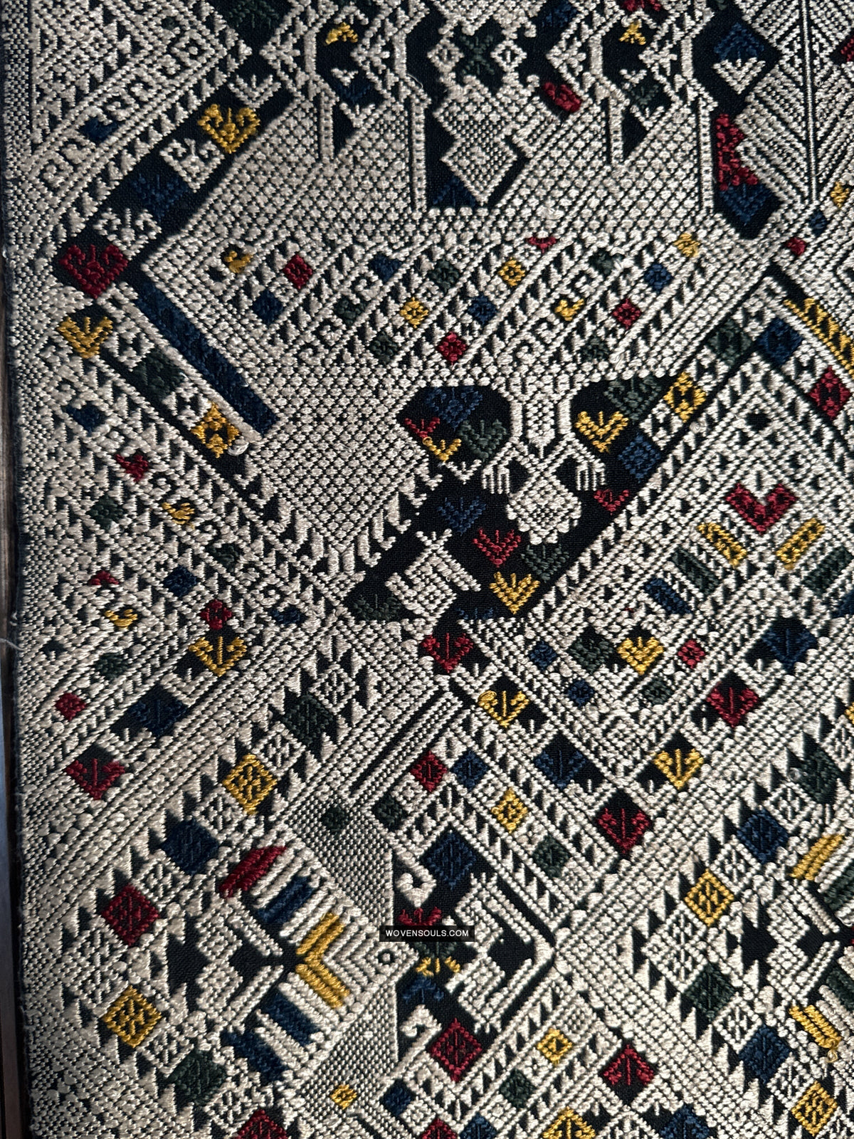 The number of colors of supplementary silk thread used in the weaving composition directly impacts the complexity of the mechanics of weaving it - the more colors used the longer it takes to weave it. In this gorgeous textile 4 colors have been used all over the piece!