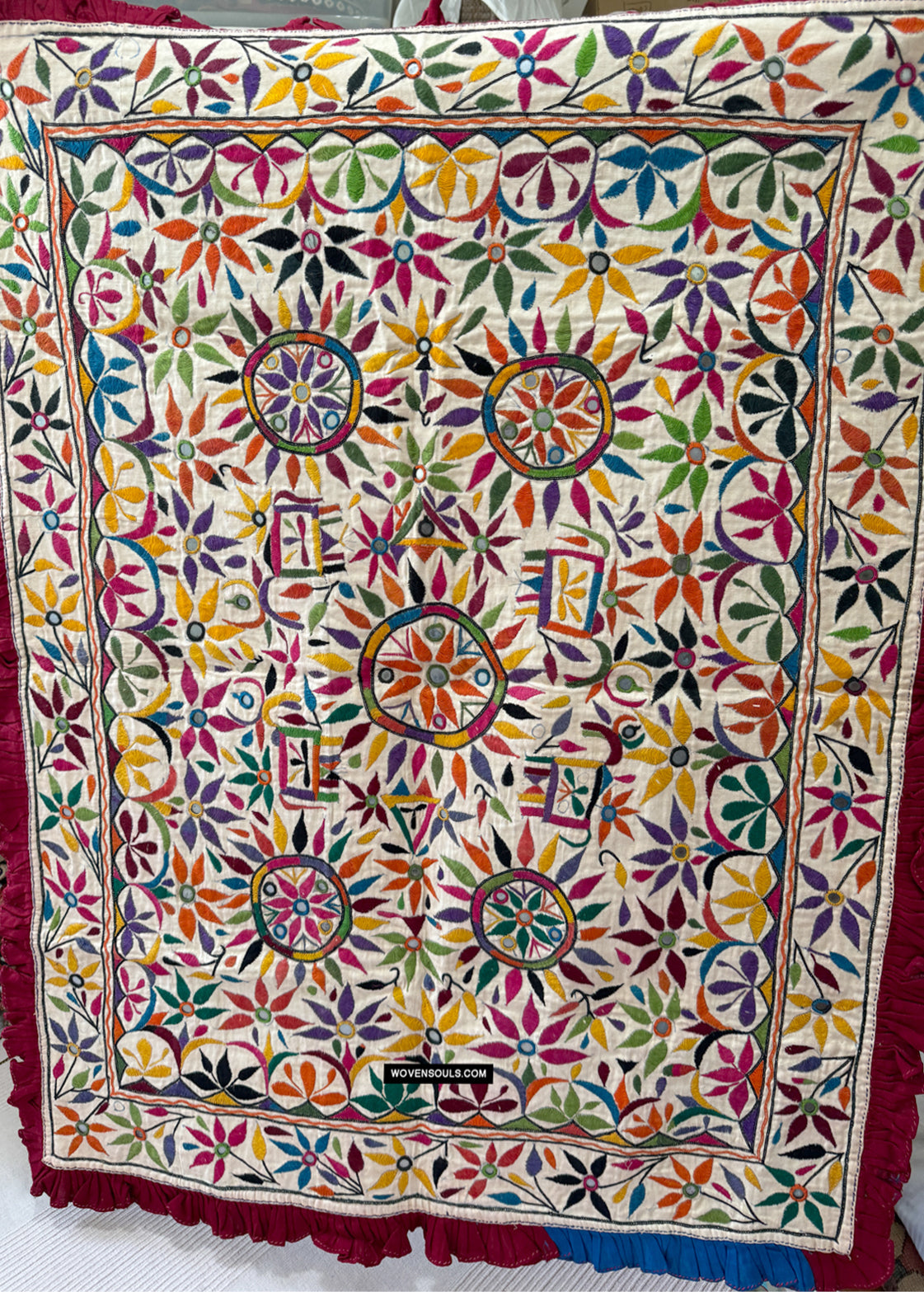 This item has spent a lifetime being used for the purpose of its creation with the original artist/user. Signs of this life lived heartily may be present on the piece in the form of stains, thread loss, loose threads, holes, tears, color run and other imperfections. Therefore the condition must be assumed to be “not” perfect. More photos of such imperfections will be provided on request.