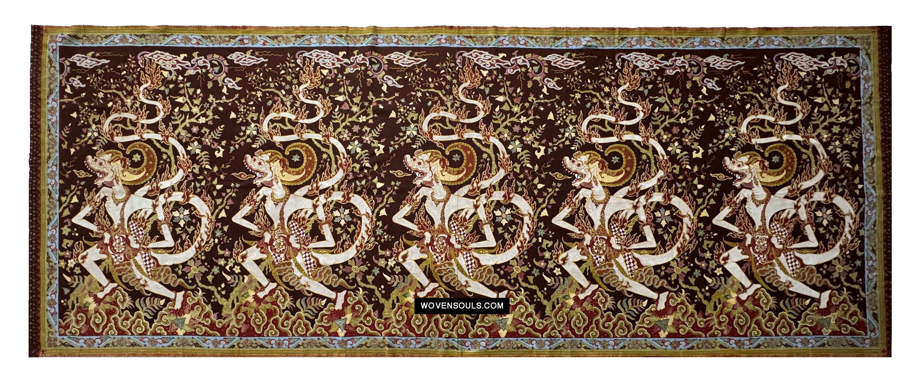 Lorsque la femme de Lord Ram, Sita est capturée par Lord Ravana et emmenée à Lanka, Hanuman assiste en allant à Lanka, en la trouvant et en mettant le feu à Lanka. Dans cette œuvre d'art batik, Hanuman est montré en train de mettre le feu à Lanka en utilisant sa queue comme torche.