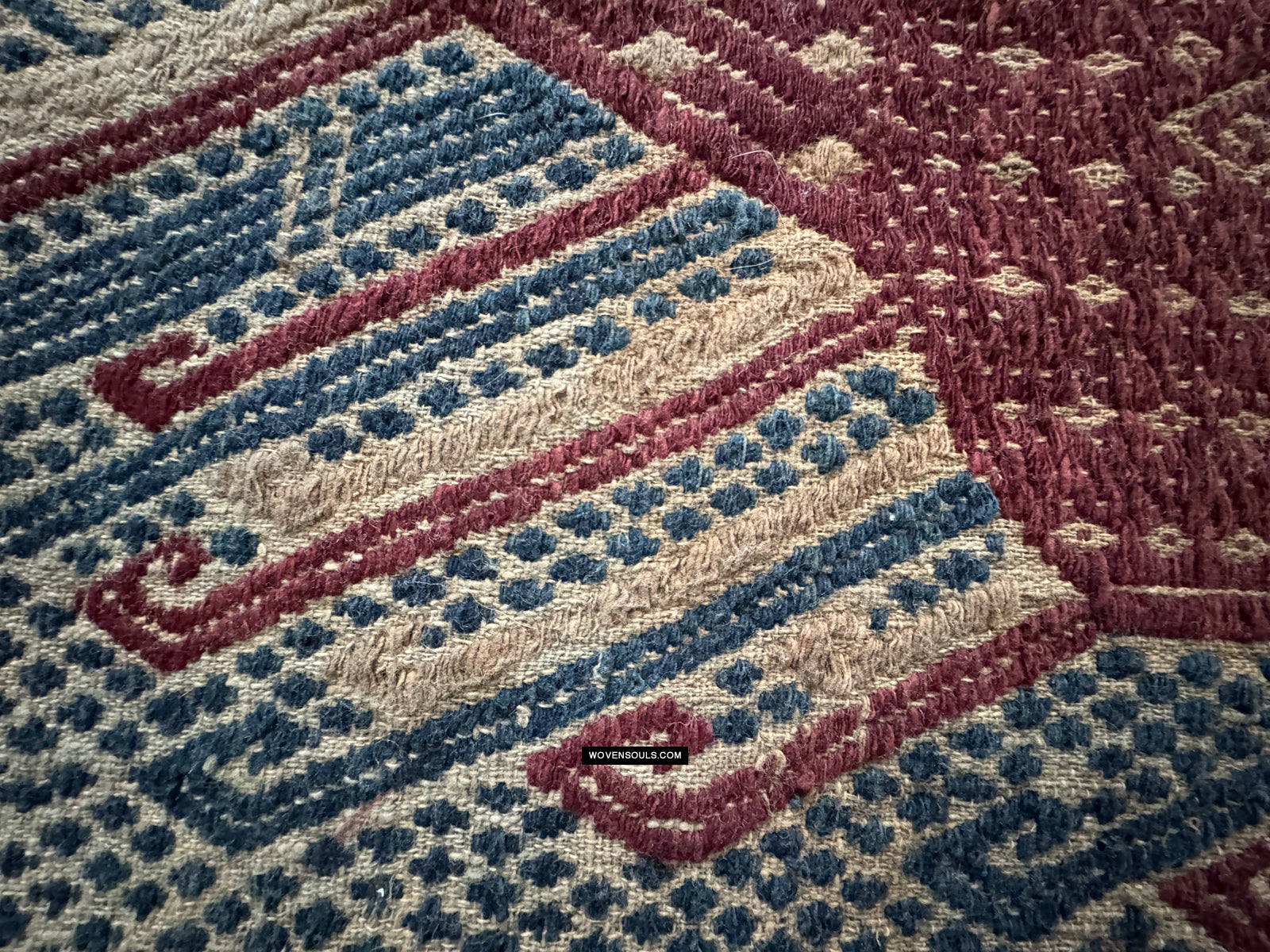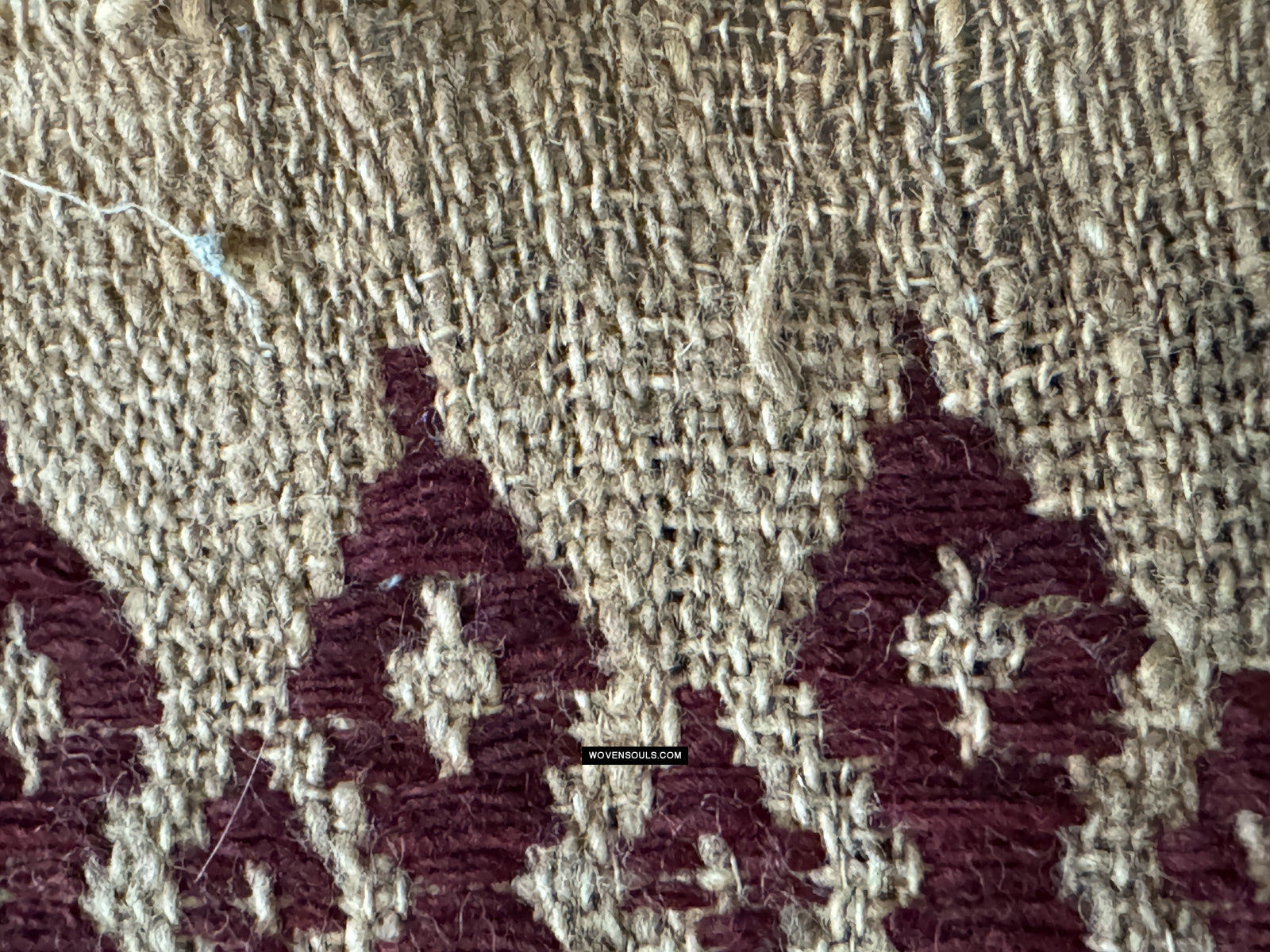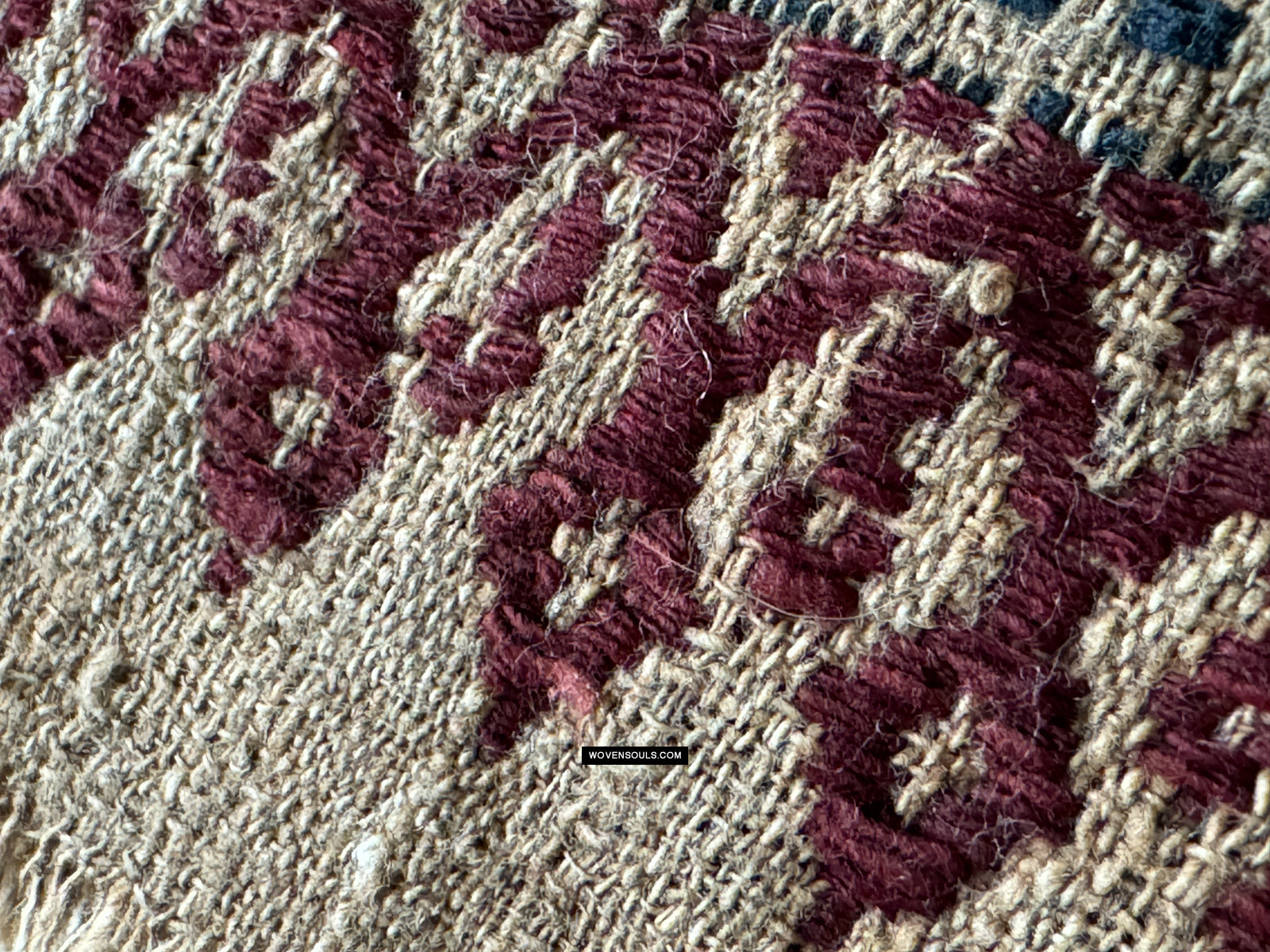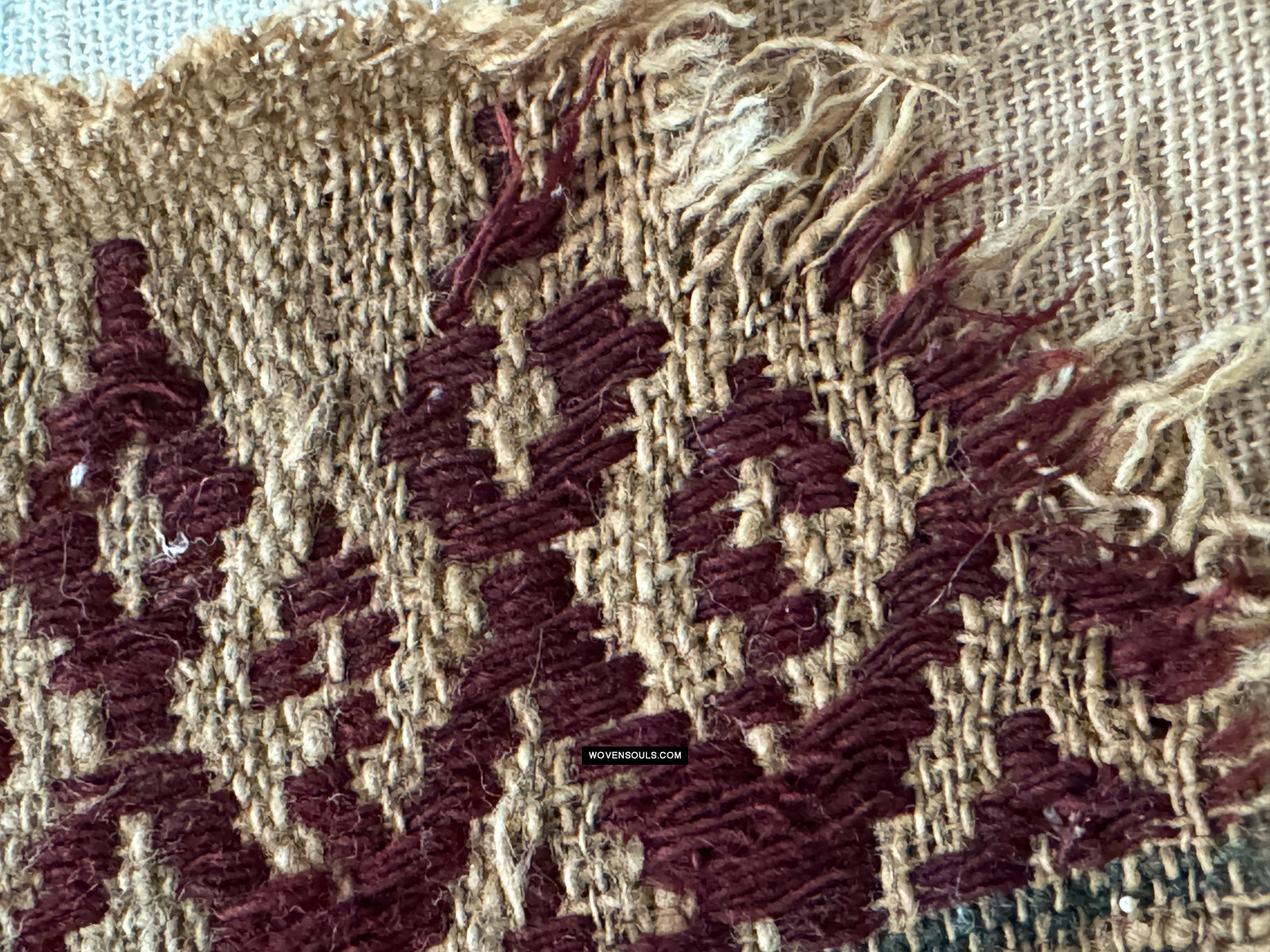 Notez les plans rapprochés des bords - qui est là que le fil se révèle. L'inégalité de la taille du fil et du tissage suggèrent des origines rustiques.