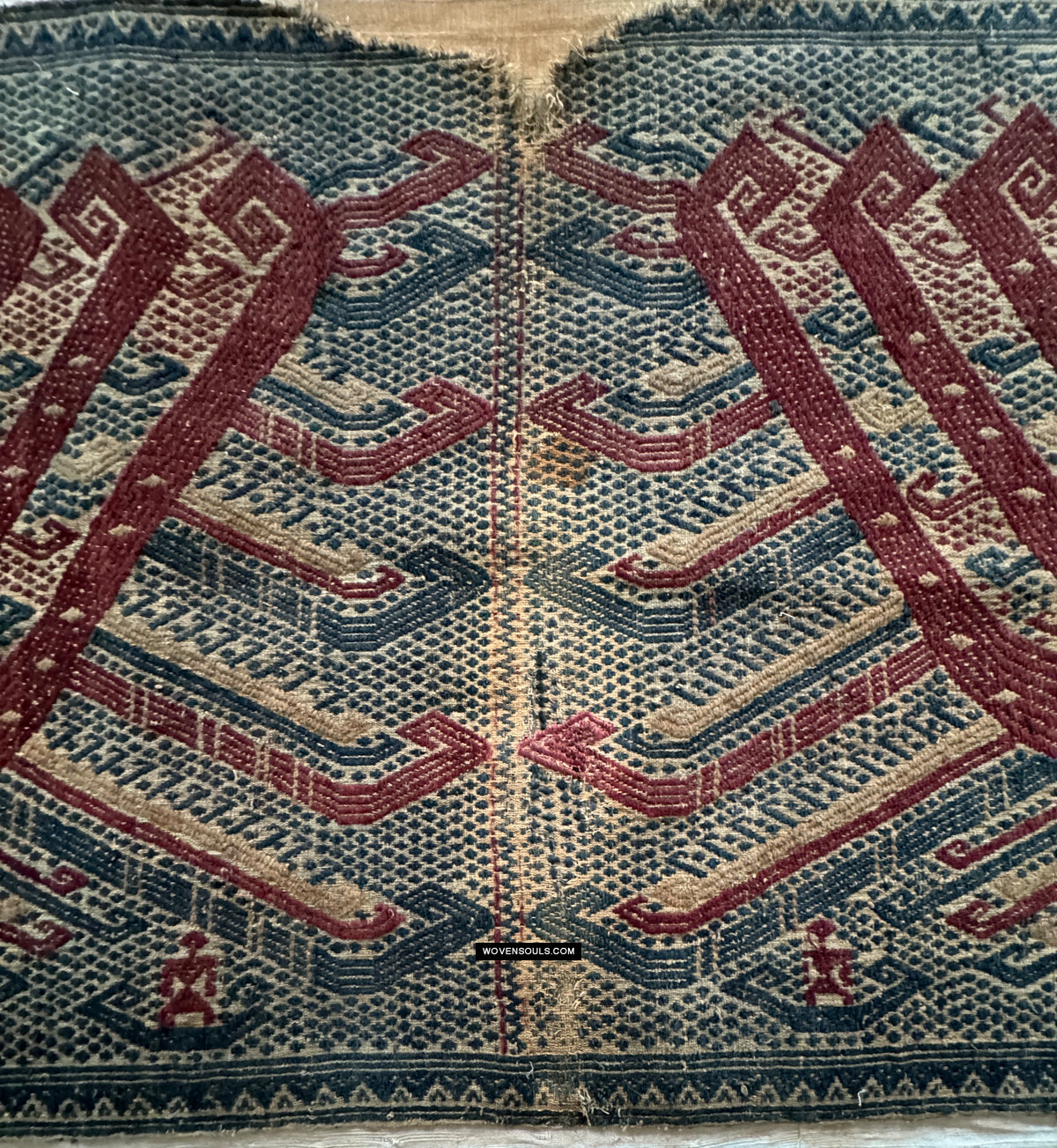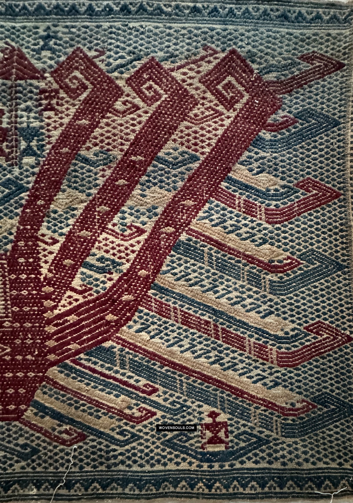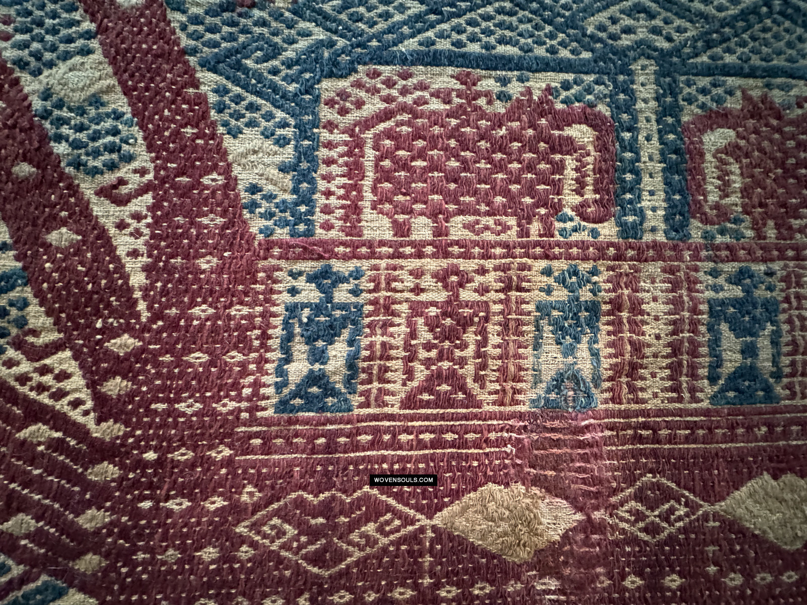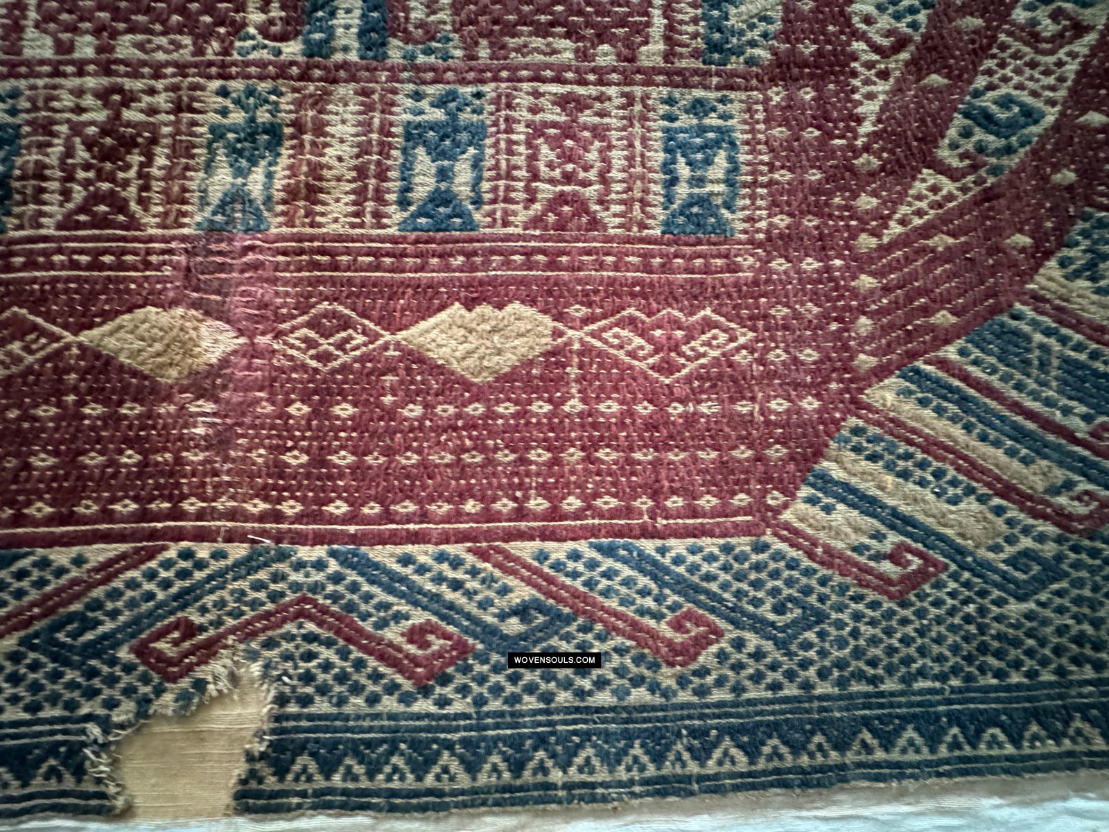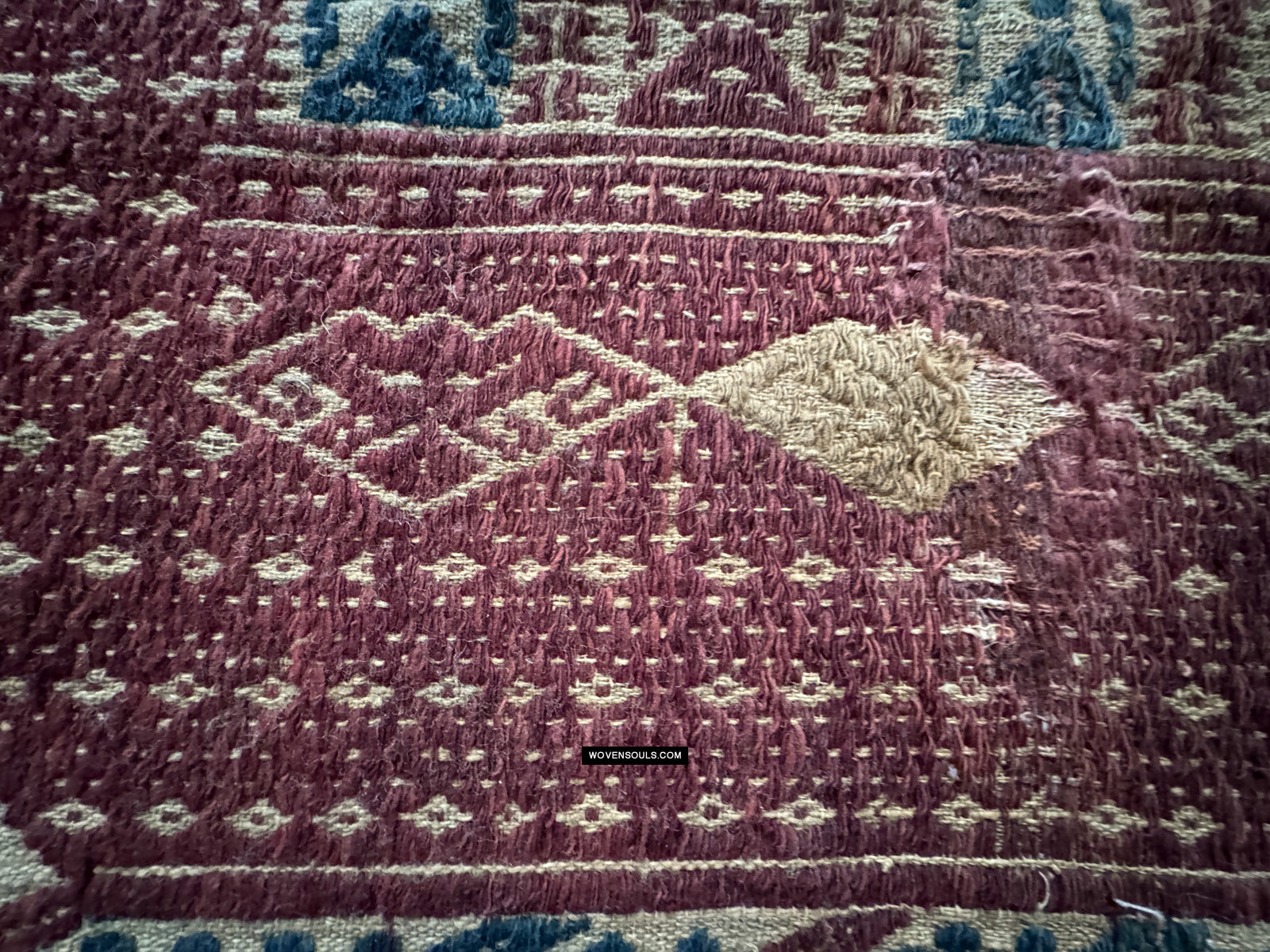 Notez les plans rapprochés des bords - qui est là que le fil se révèle. L'inégalité de la taille du fil et du tissage suggèrent des origines rustiques.