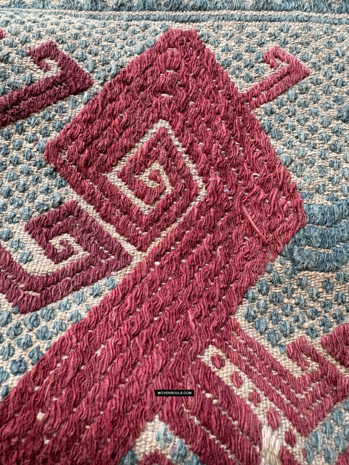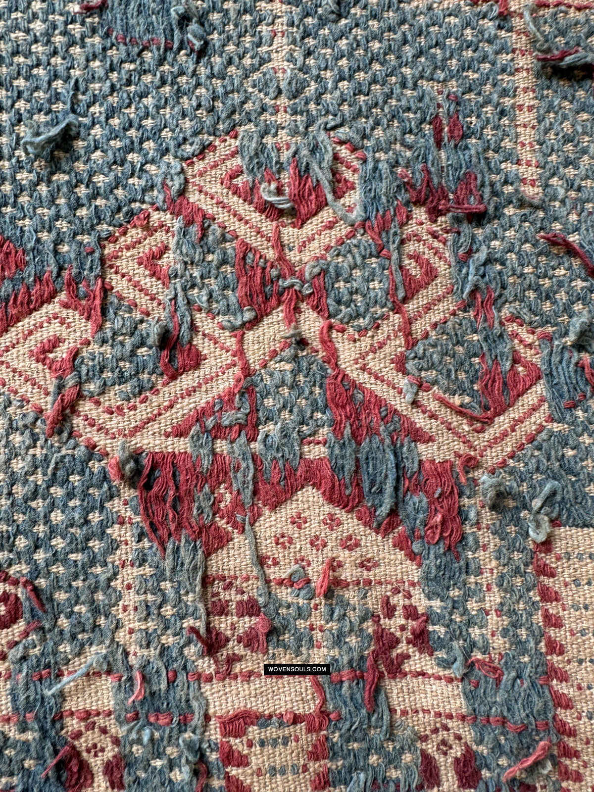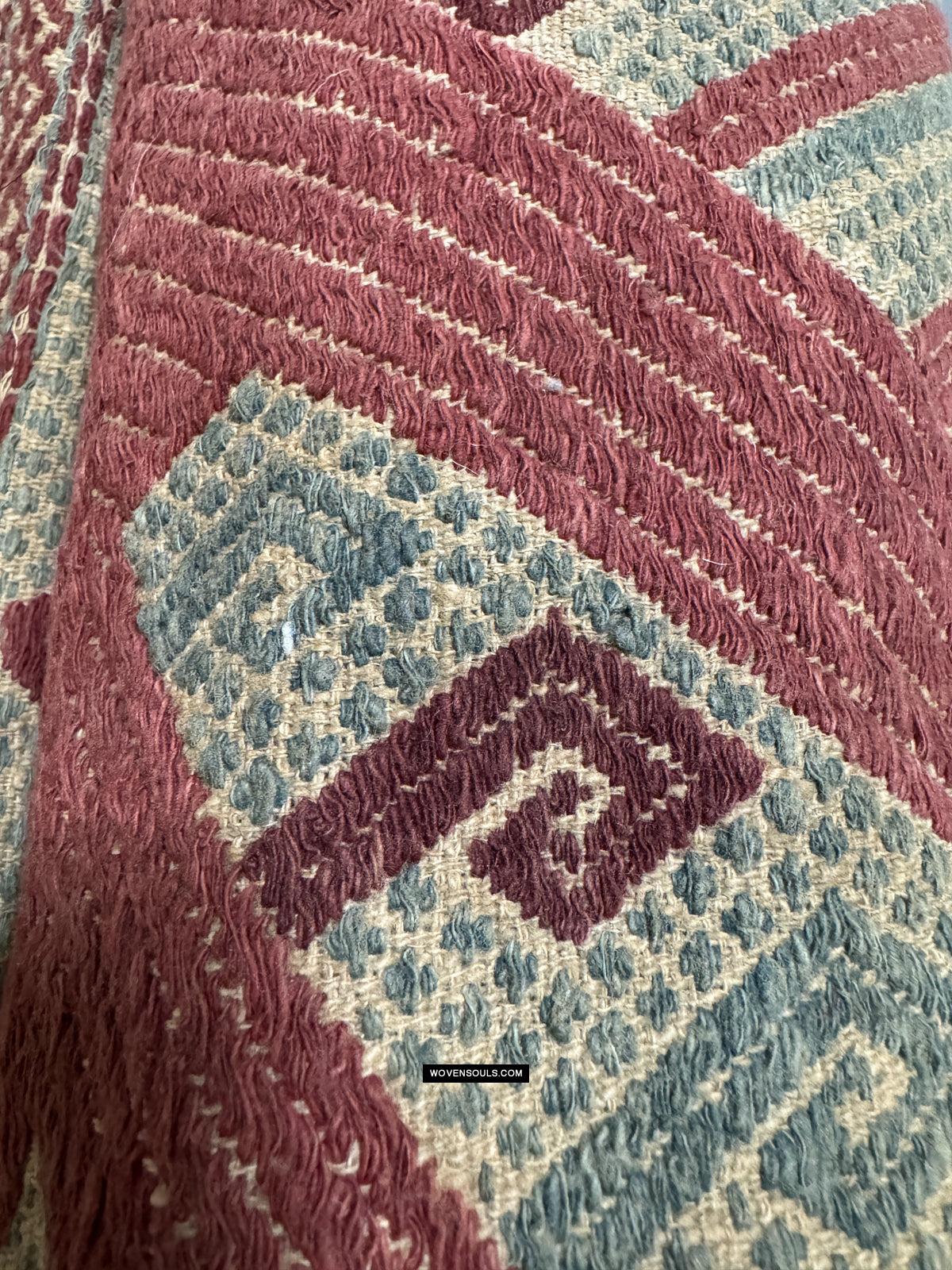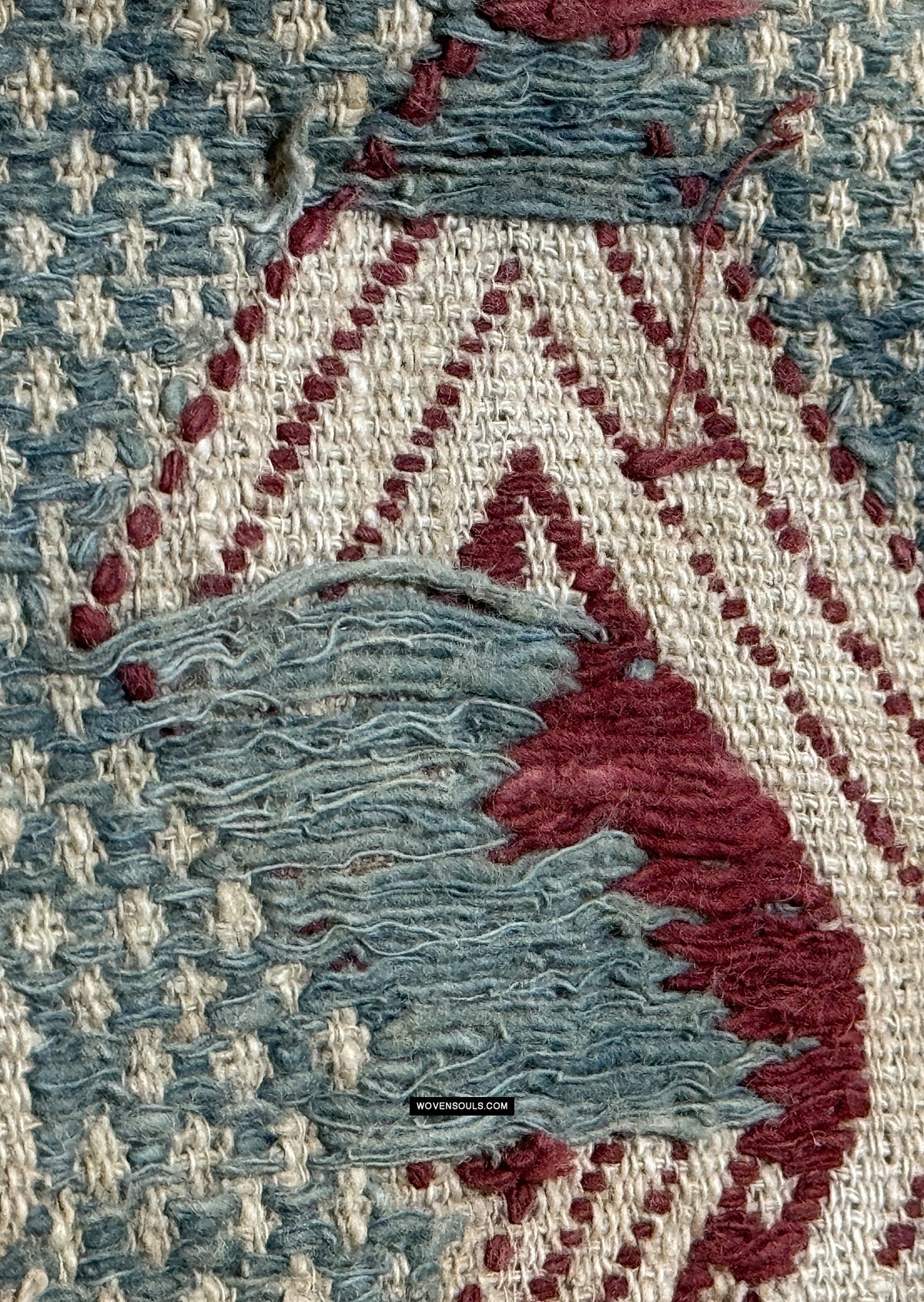 Notez les plans rapprochés du dos - où le fil se révèle. L'inégalité de la taille du fil et du tissage suggèrent des origines rustiques et vieillies.