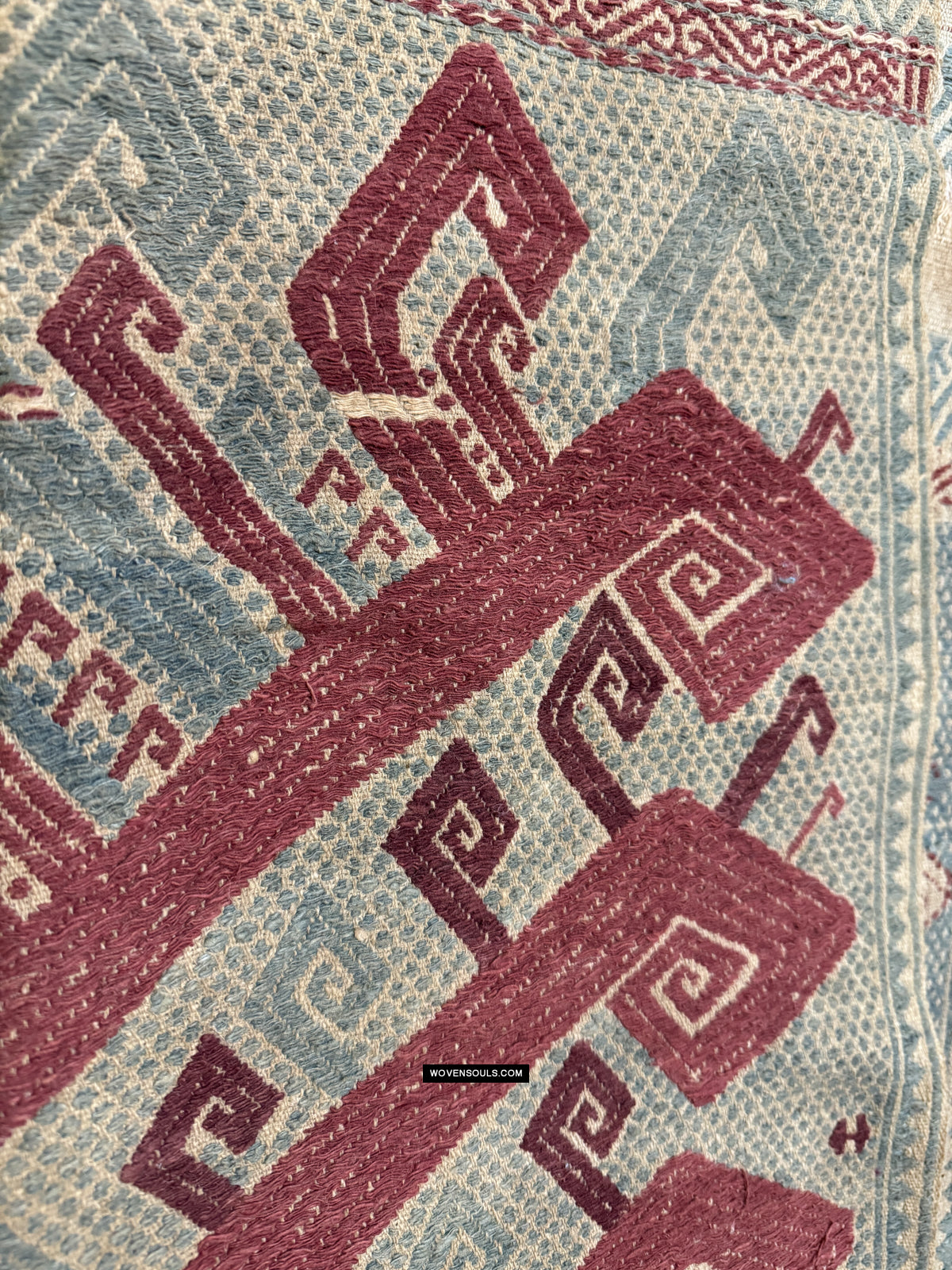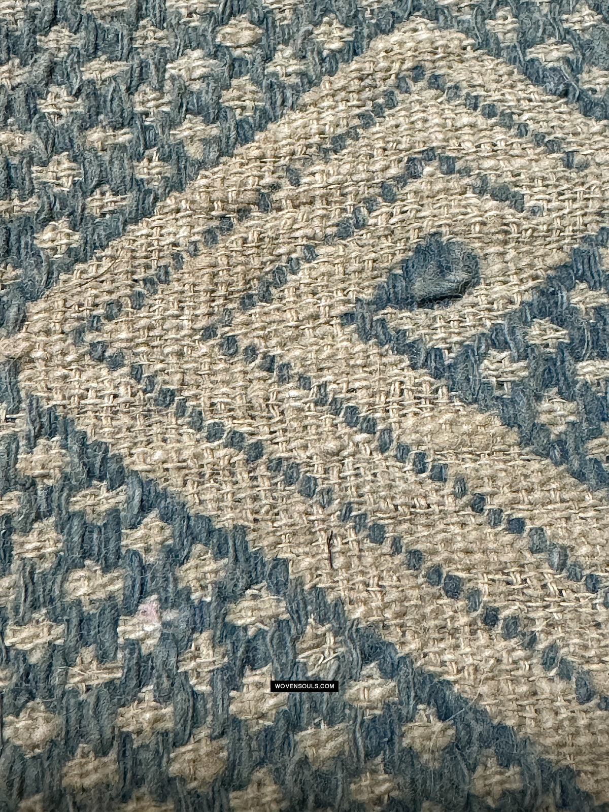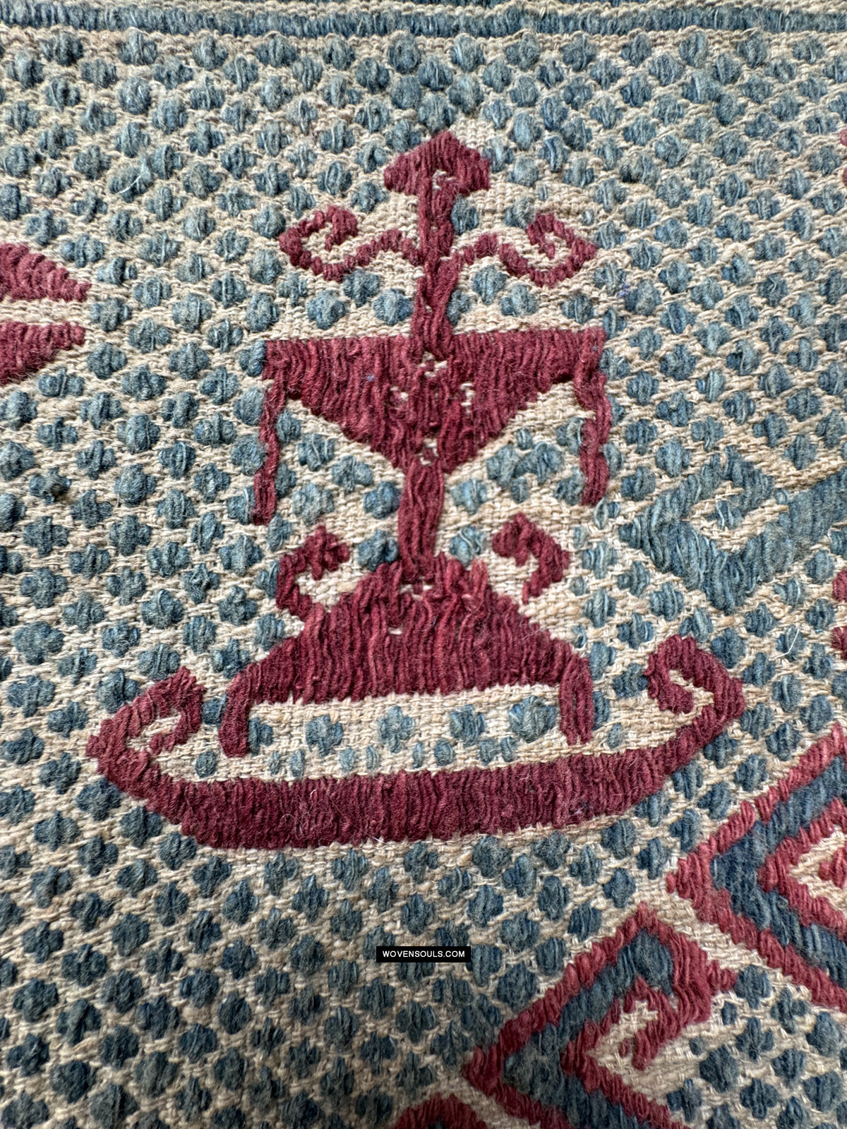 Notez les plans rapprochés du dos - où le fil se révèle. L'inégalité de la taille du fil et du tissage suggèrent des origines rustiques et vieillies.