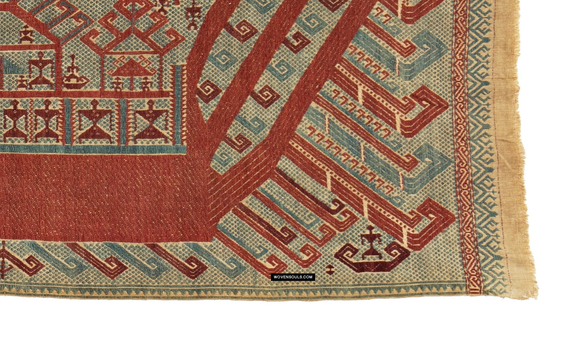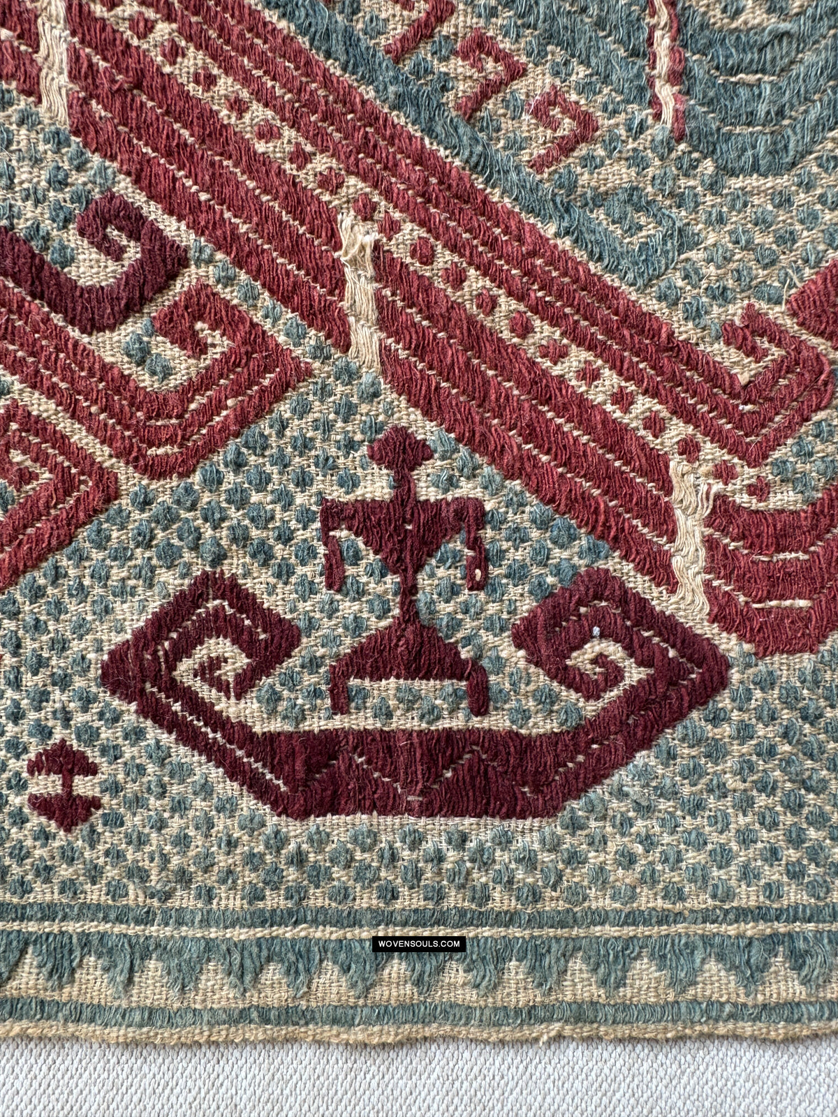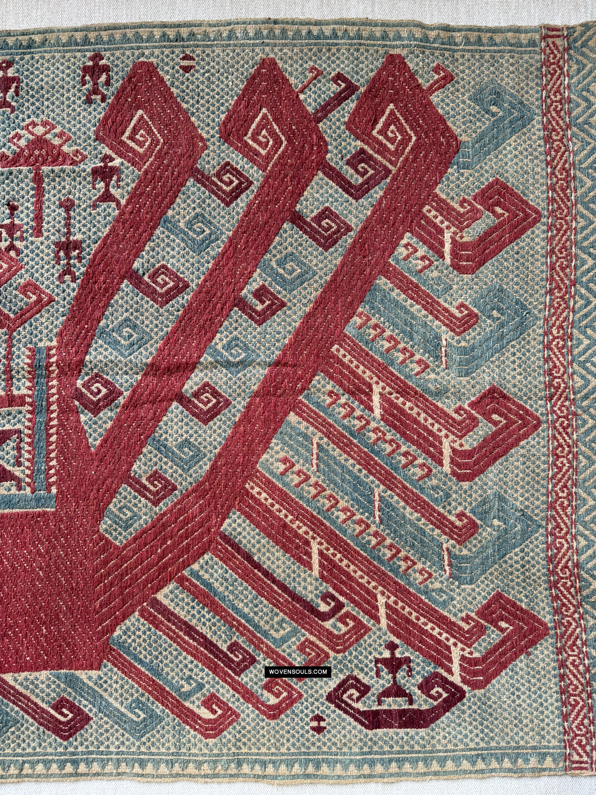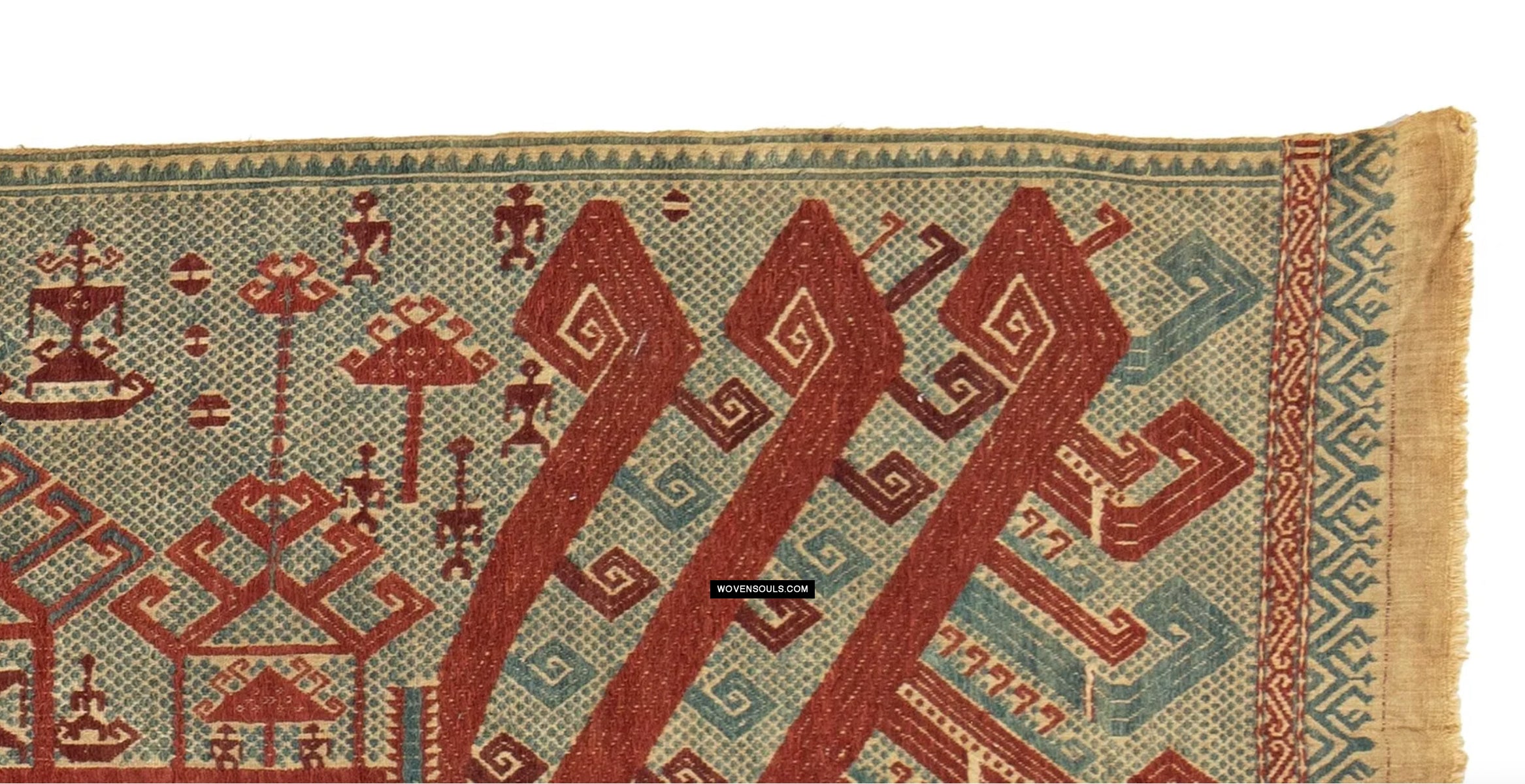Notez les plans rapprochés du dos - où le fil se révèle. L'inégalité de la taille du fil et du tissage suggèrent des origines rustiques et vieillies.