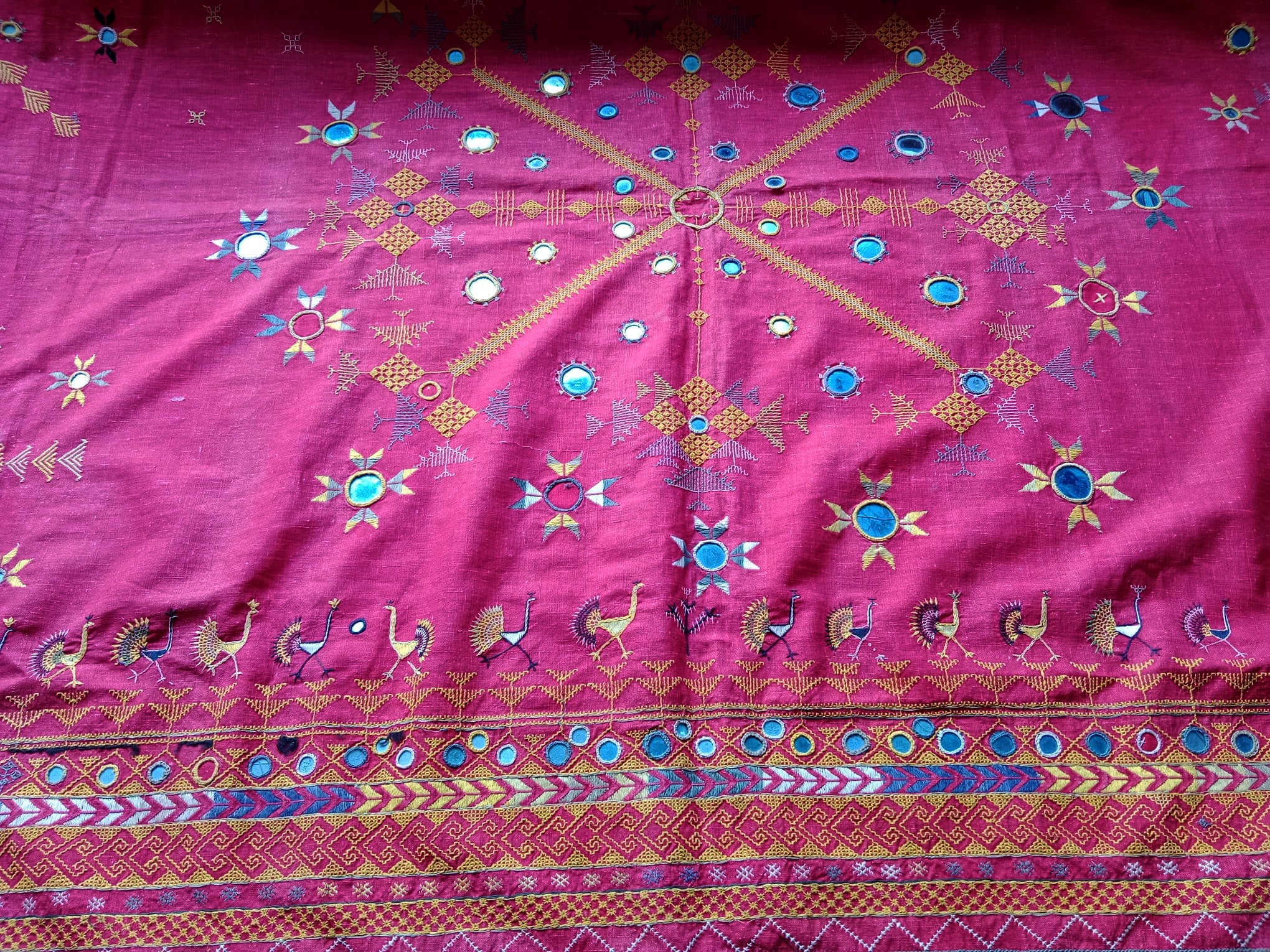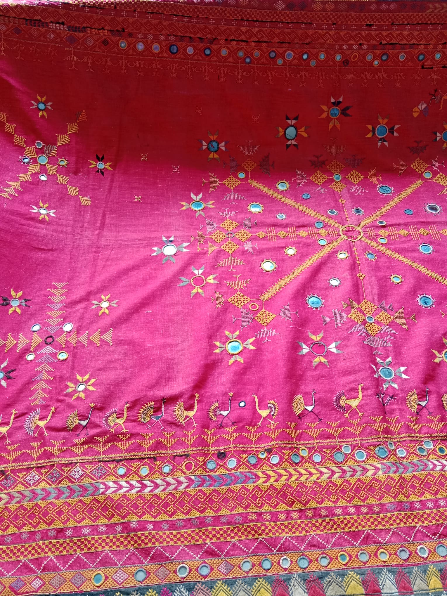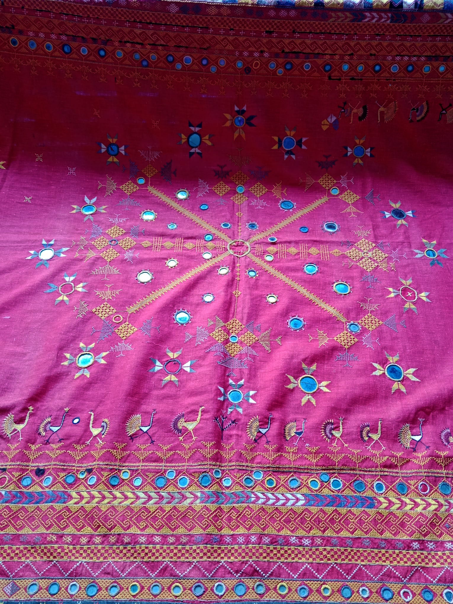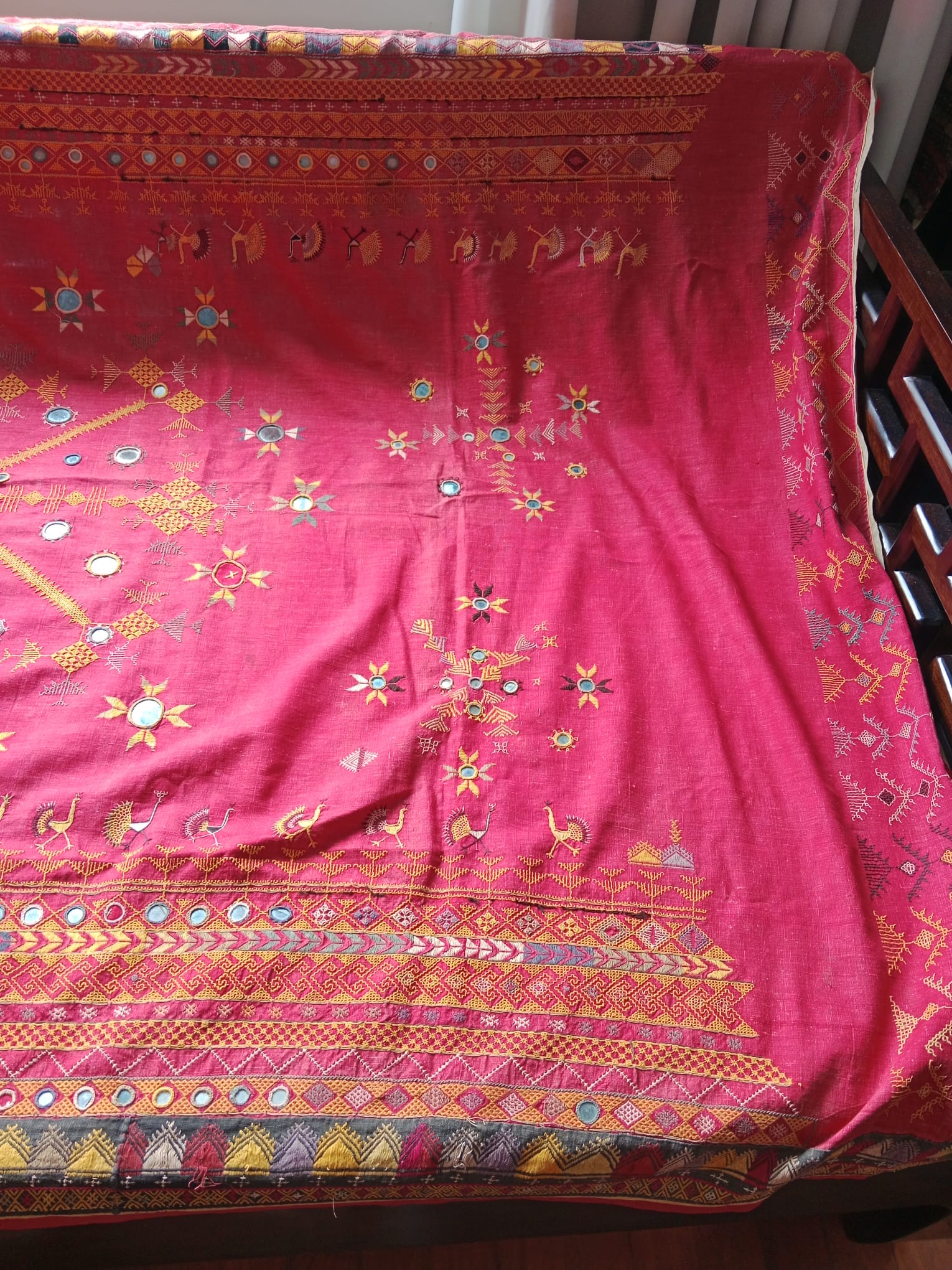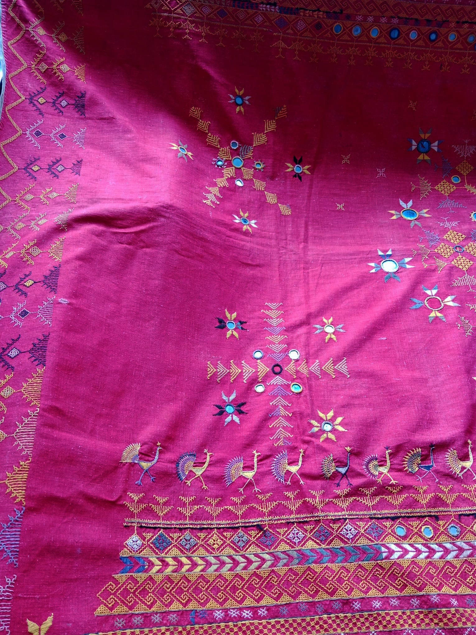 Un exemple étonnant de créativité! Dans cette catégorie de textiles, nous voyons généralement le même ensemble de motifs géométriques angulaires répétés à travers des morceaux de textiles individuels. Nous voyons rarement un élément individualiste inhabituel. Ceci est ma première exposition à un paon dans un châle du Rajasthan. Ce qui me fait me demander, c'est le fait que l'exécution n'est pas aléatoire et elle n'est pas rendue dans le «nous le découvrirons en cours de route». L'artiste savait exactement ce qu'elle faisait dans chaque point, avec ses instructions et sa taille pré-planifiées avant même de commencer. Elle a créé tout le troupeau avec la précision d'un maître bien pratiqué. D'où les paons et peut-être que l'artiste est originaire? A-t-elle appartenu à une autre tribu et a-t-elle apporté avec elle ces mèmes migratoires? Un textile fascinant!