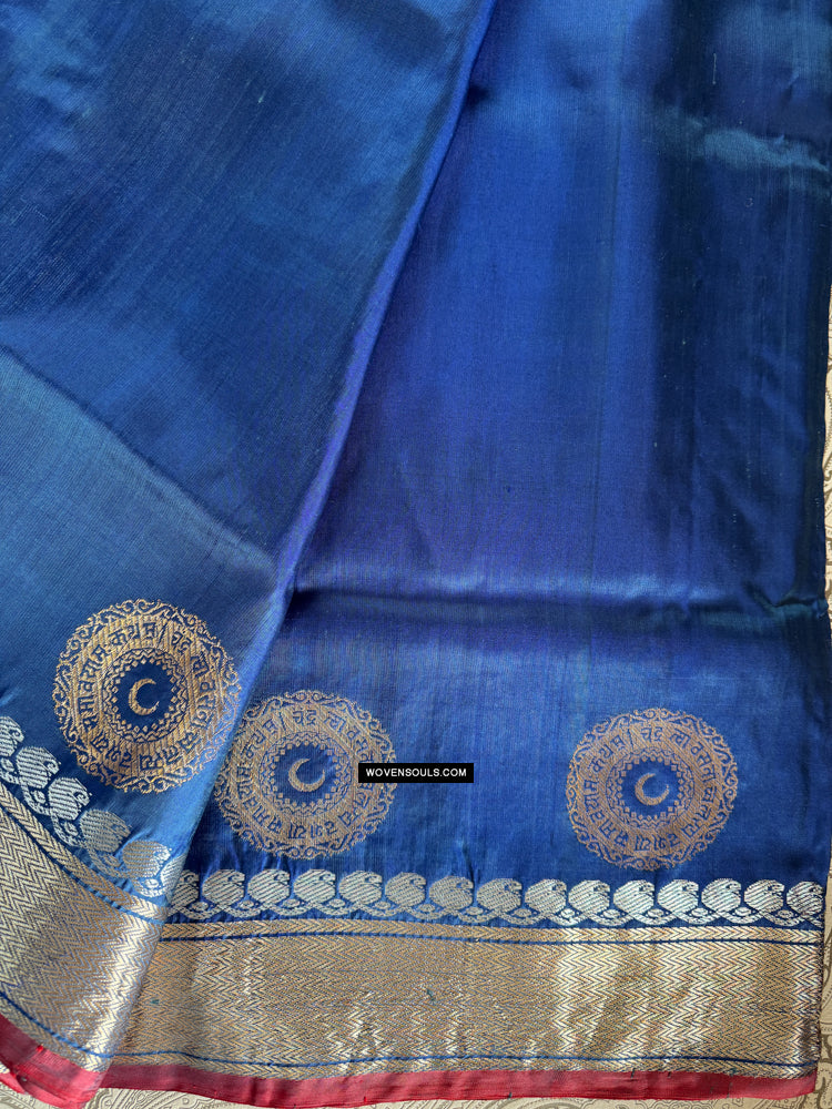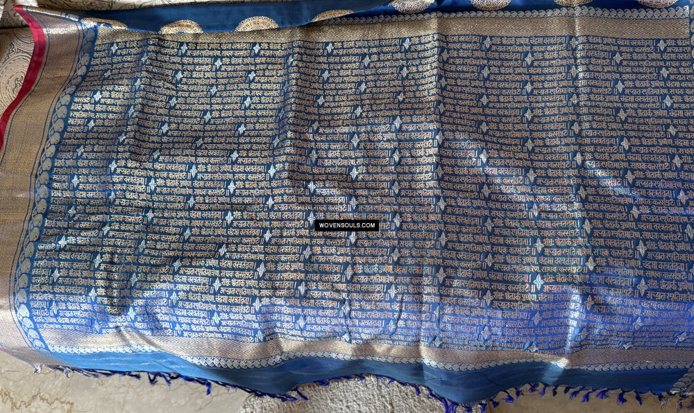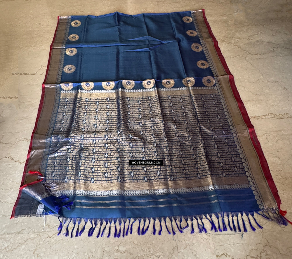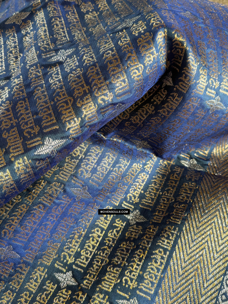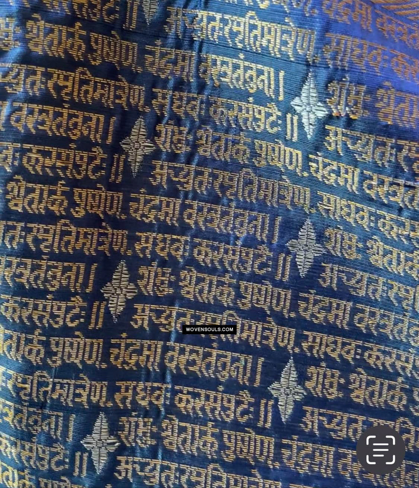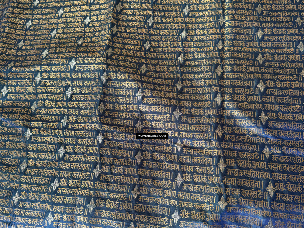Sari de soie récemment fabriqué du Maharashtra avec des shlokas inscrits au zari sur la lune tissée.