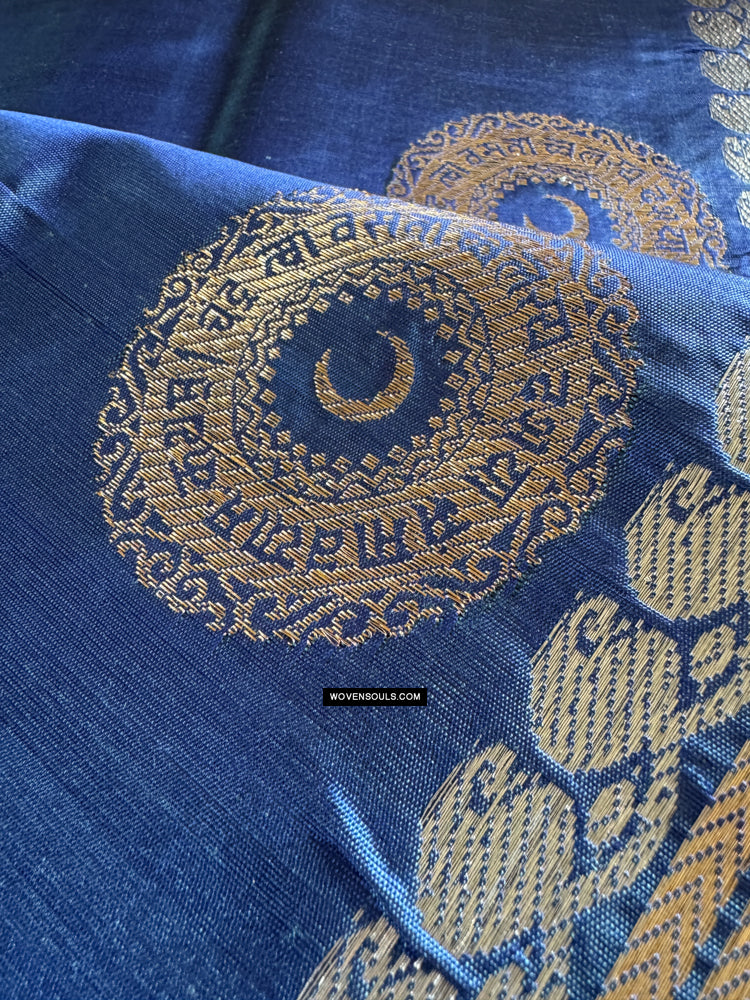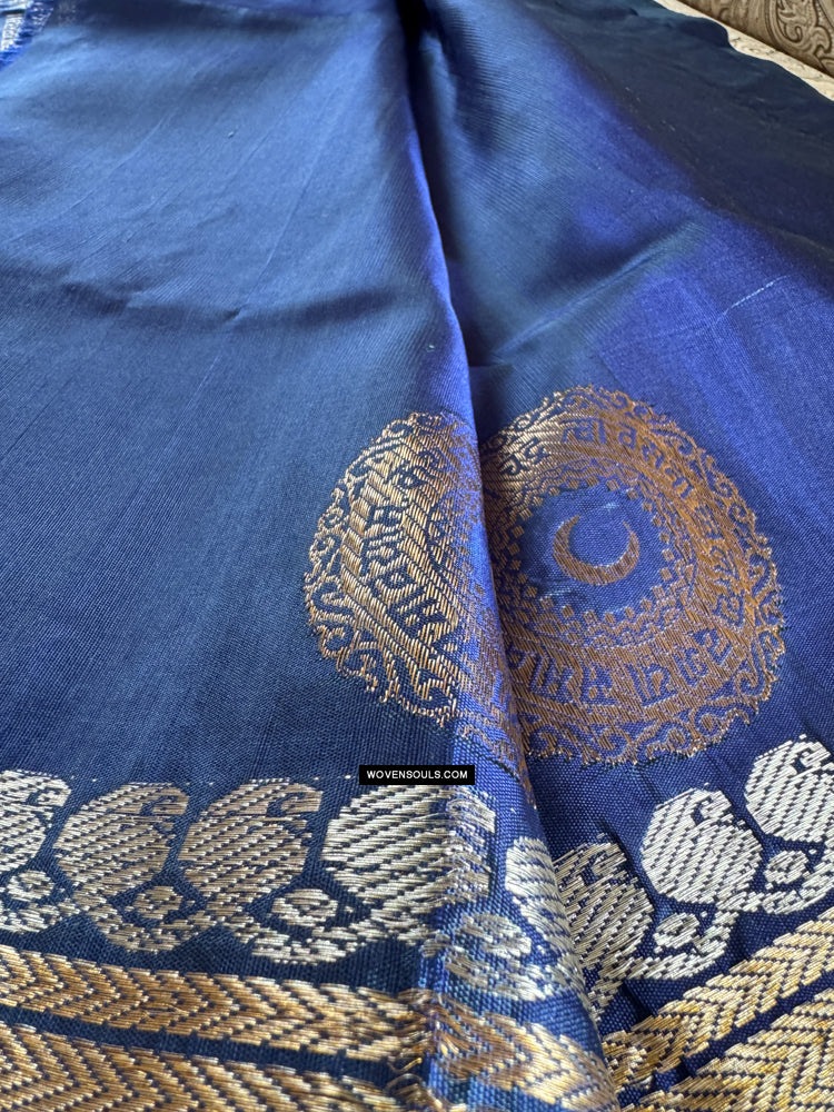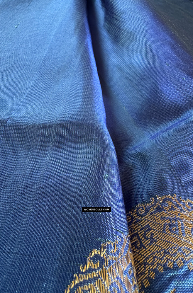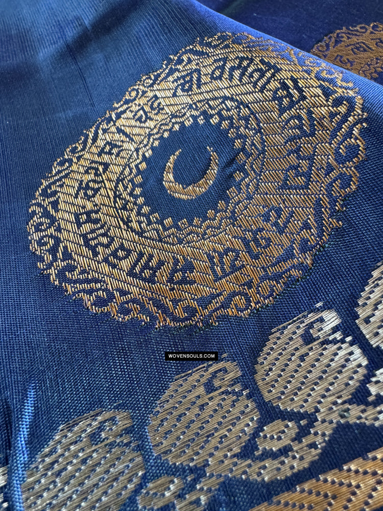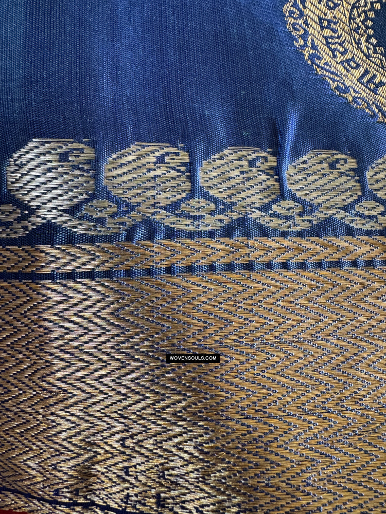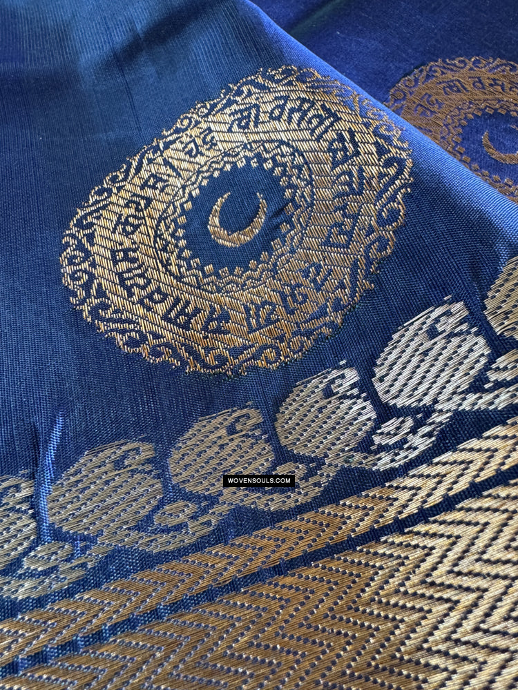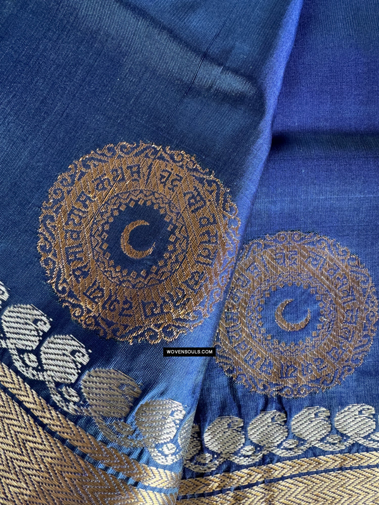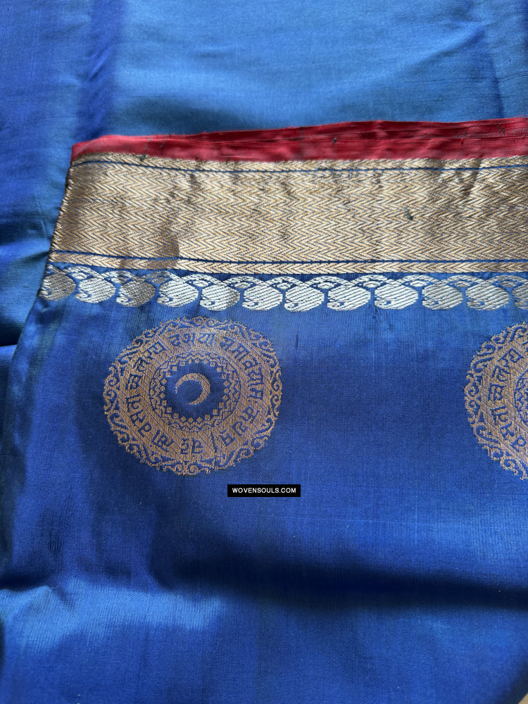 Notez les deux bleus toniques dans la soie de base. Notez qu'il y a un zari doré et argenté. Notez la lisière rouge qui ajoute du caractère.