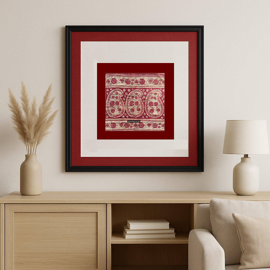 Les photos du cadre (les deux premiers) sont à des fins illustratives uniquement et non proportionnelles à la taille réelle. Certaines parties du textile ont été recouvertes de PasssePartout dans les images encadrées pour mettre en évidence les meilleures parties du textile. Cadre rouge / blanc non inclus.