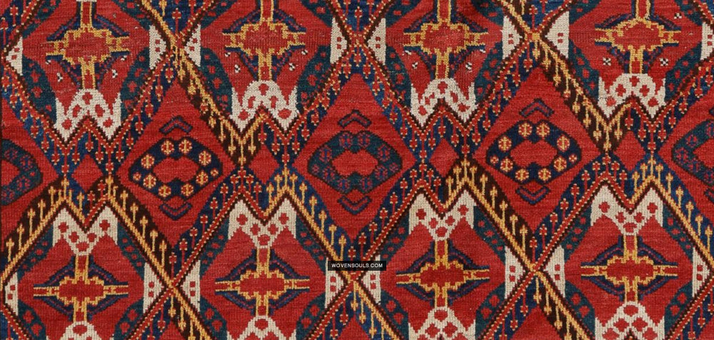 Un bel exemple de motif ikat dans le tissage de piles qui n'est vu que sur un petit groupe de tissages de dot de nomades Ersari au Turkménistan.