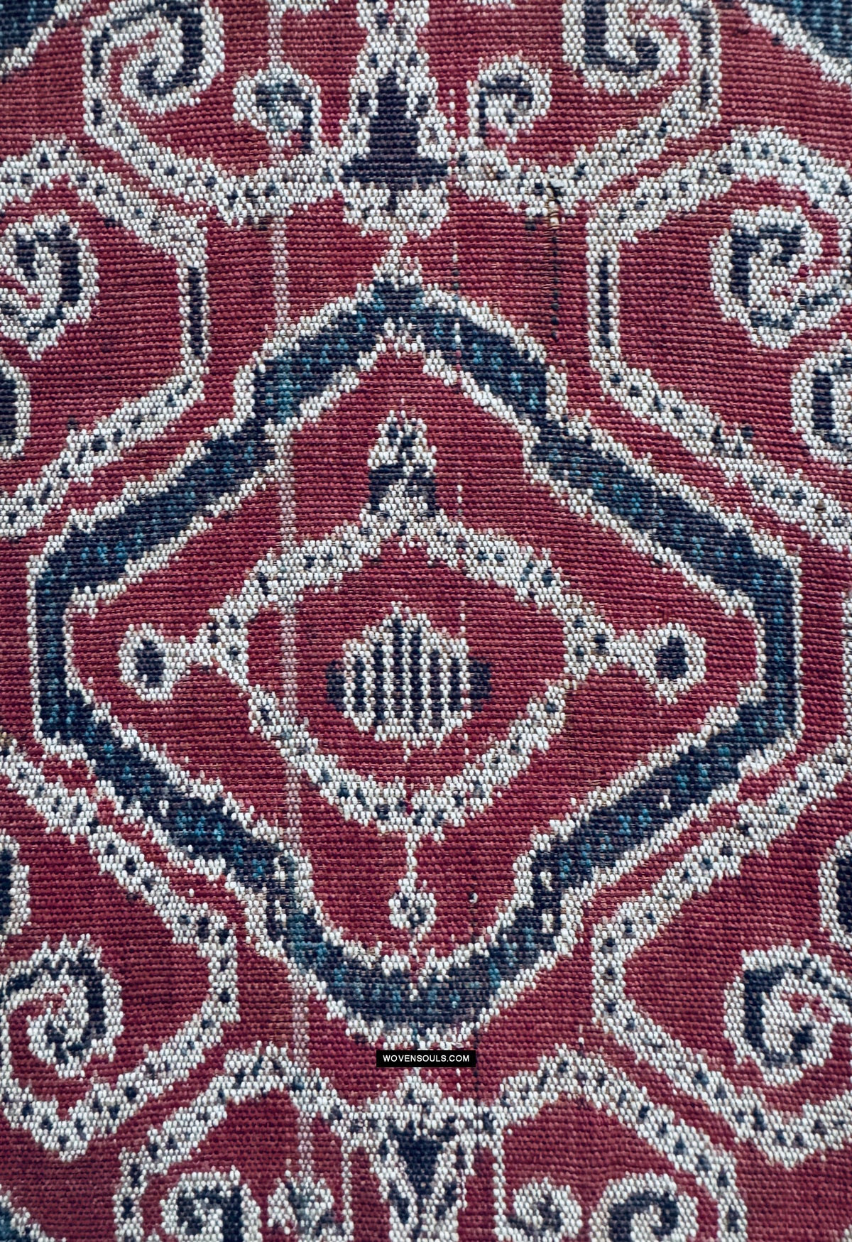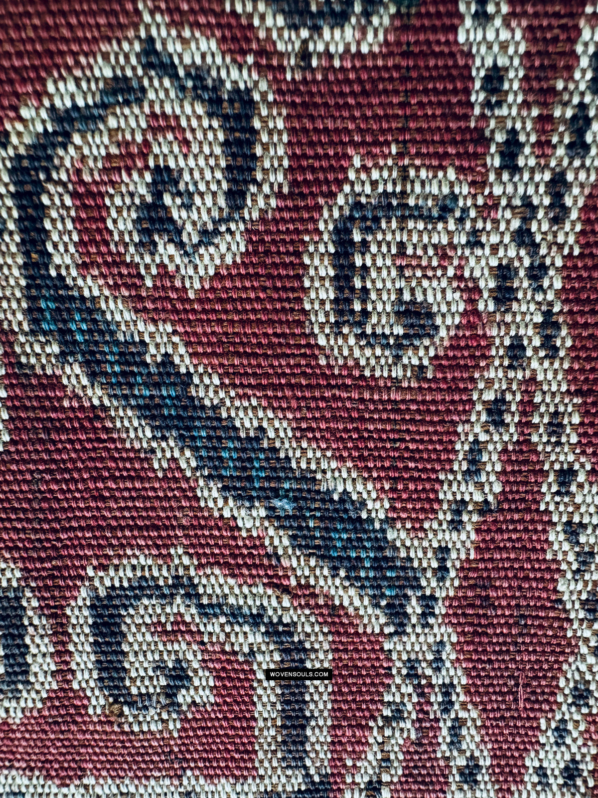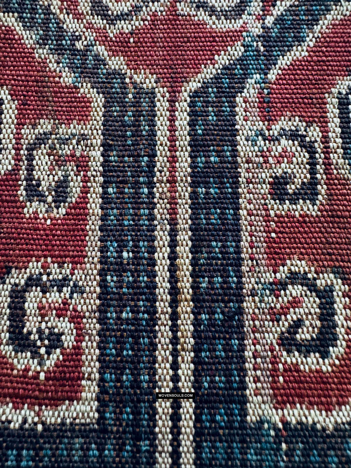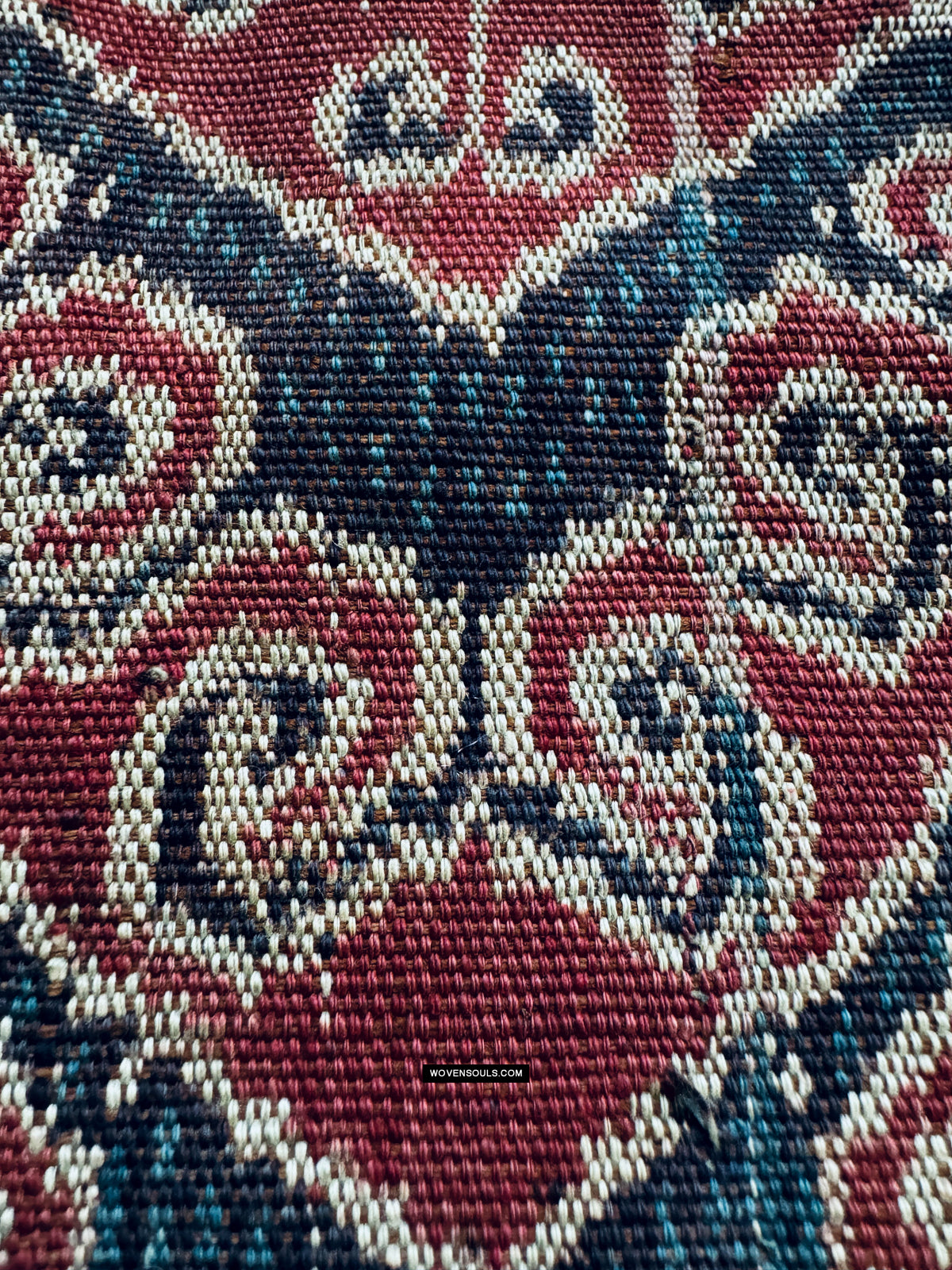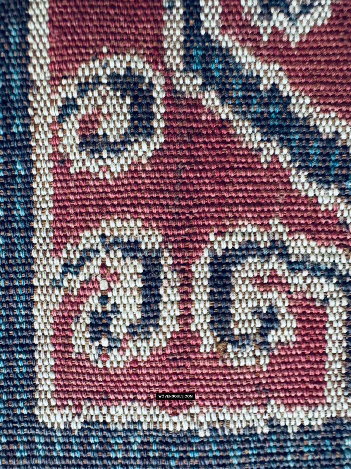 - Nota i piccoli "grani di riso" blu che fungono da elementi di riempimento all'interno dei spessi bordi neri di ogni esagono. Rendering queste minuscole linee verticali con precisione è il lavoro pf un master weaver