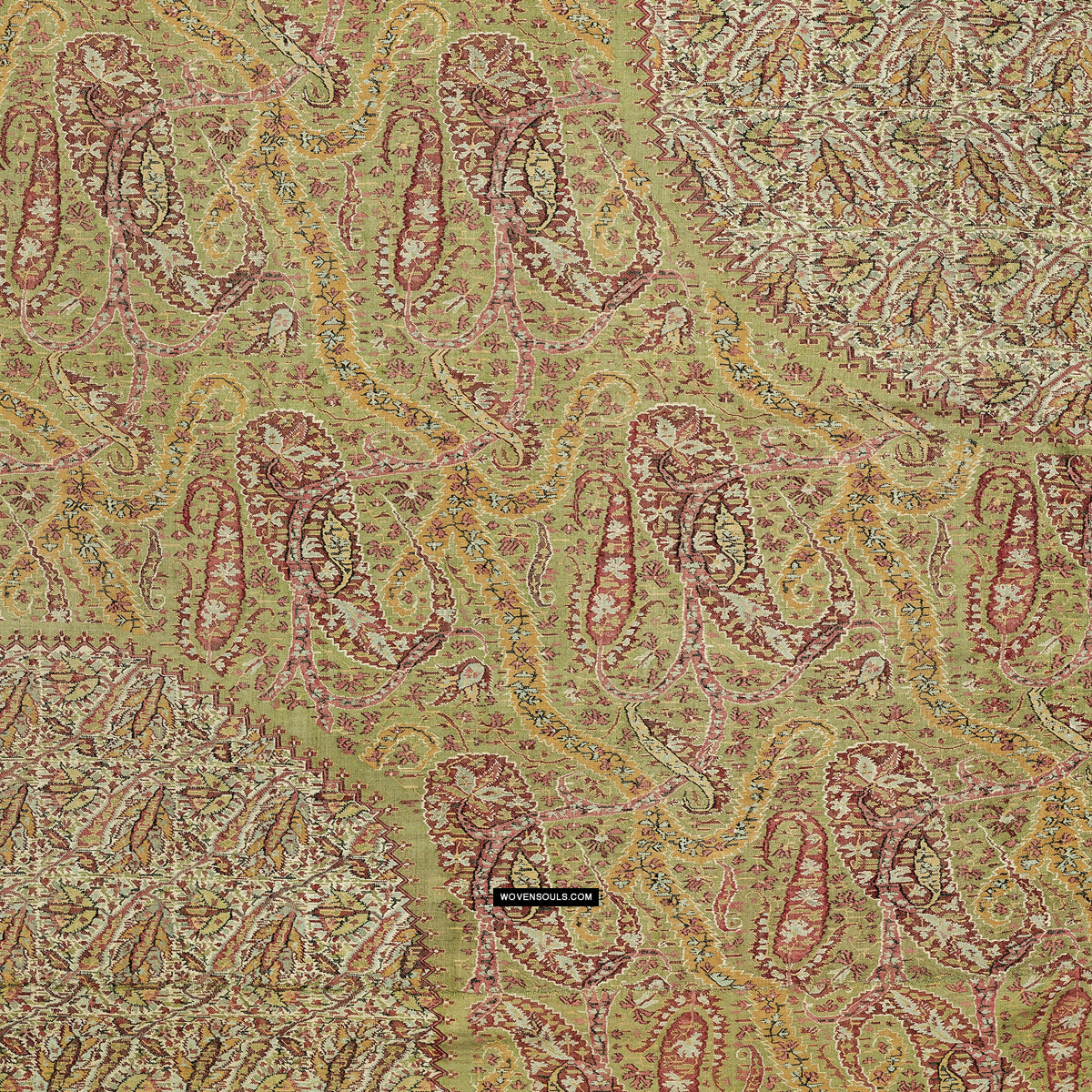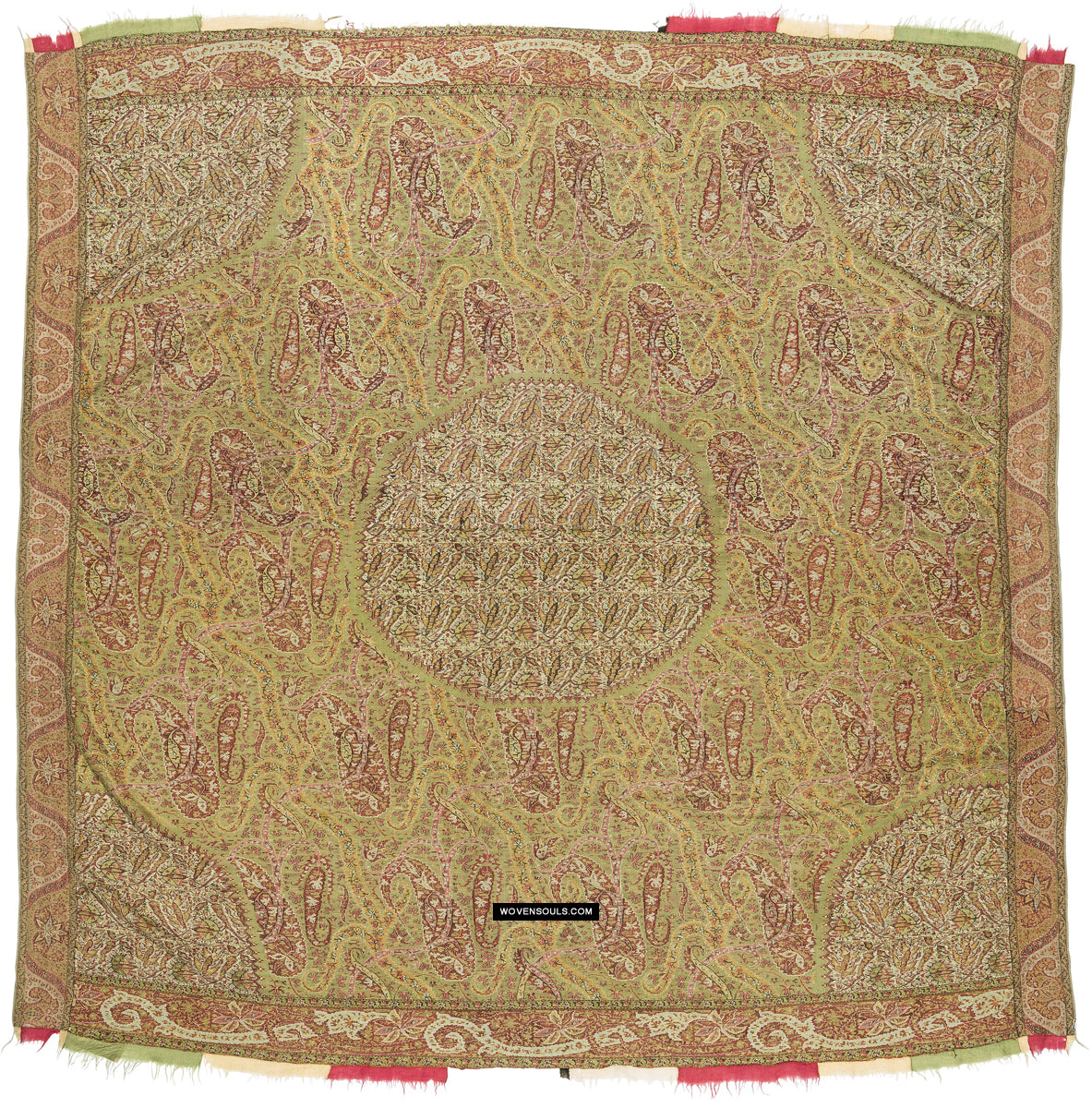 Pashmina lana con motivi di butas allungati in diversi colori. La complessità della tessitura aumenta con il numero di colori impiegati e potrei contare otto. Di questi verdi era e rimane un colore preferito nella regione di origine.