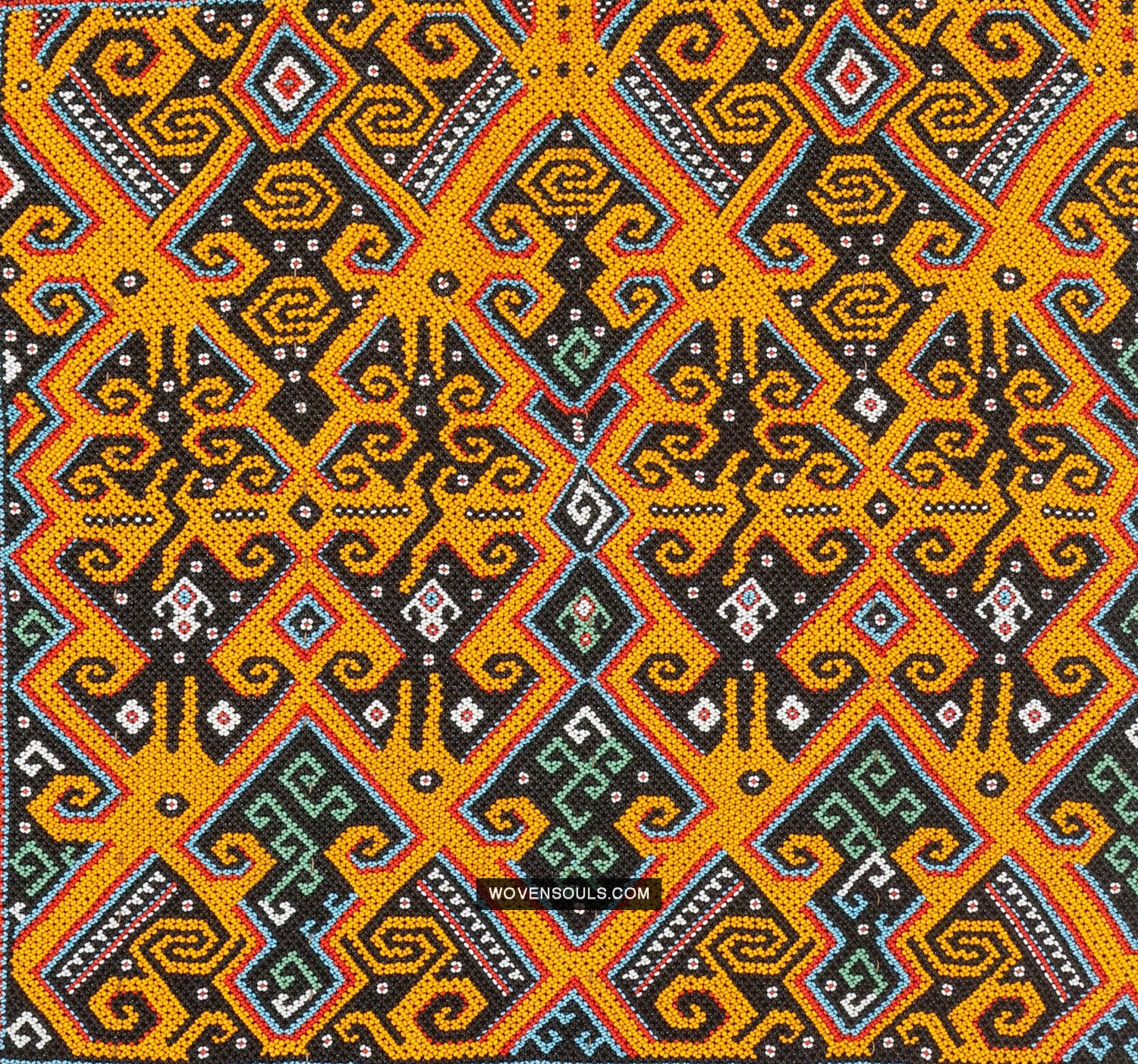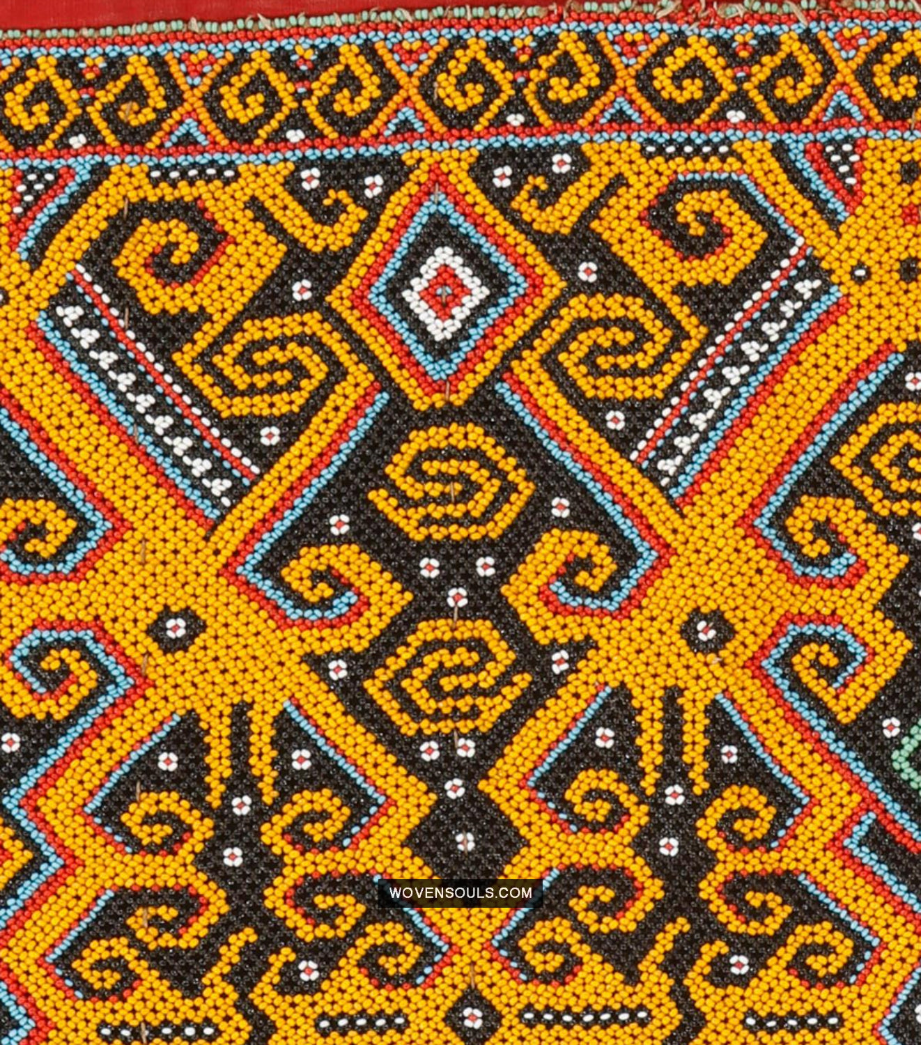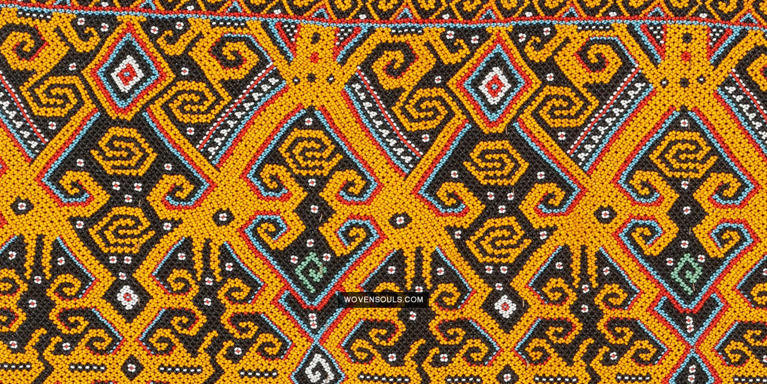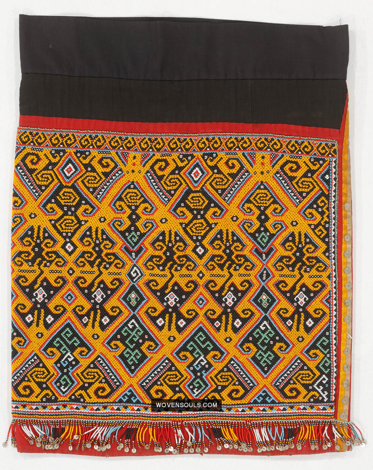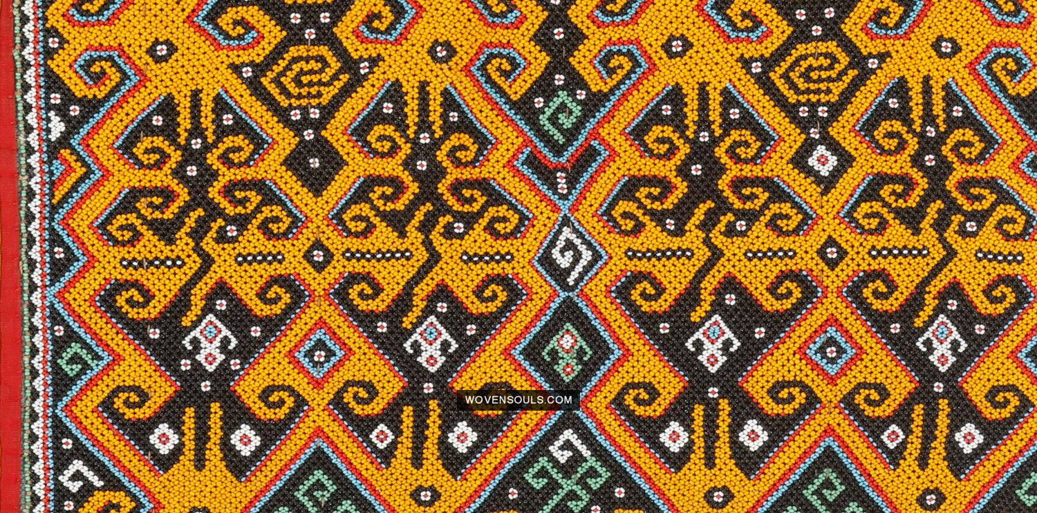 Maloh People, West Kalimantan, gonna di perline di Borneo - potente motivo spirituale. Perline, paillettes e conchiglie abbellimenti sul cotone commerciale. I Maloh indossavano gonne come questa in occasioni festive e cerimoniali: nascita, matrimonio, morte, raccolti e motivi di spirito forti come questo erano limitati a quelli nei vertici della società.