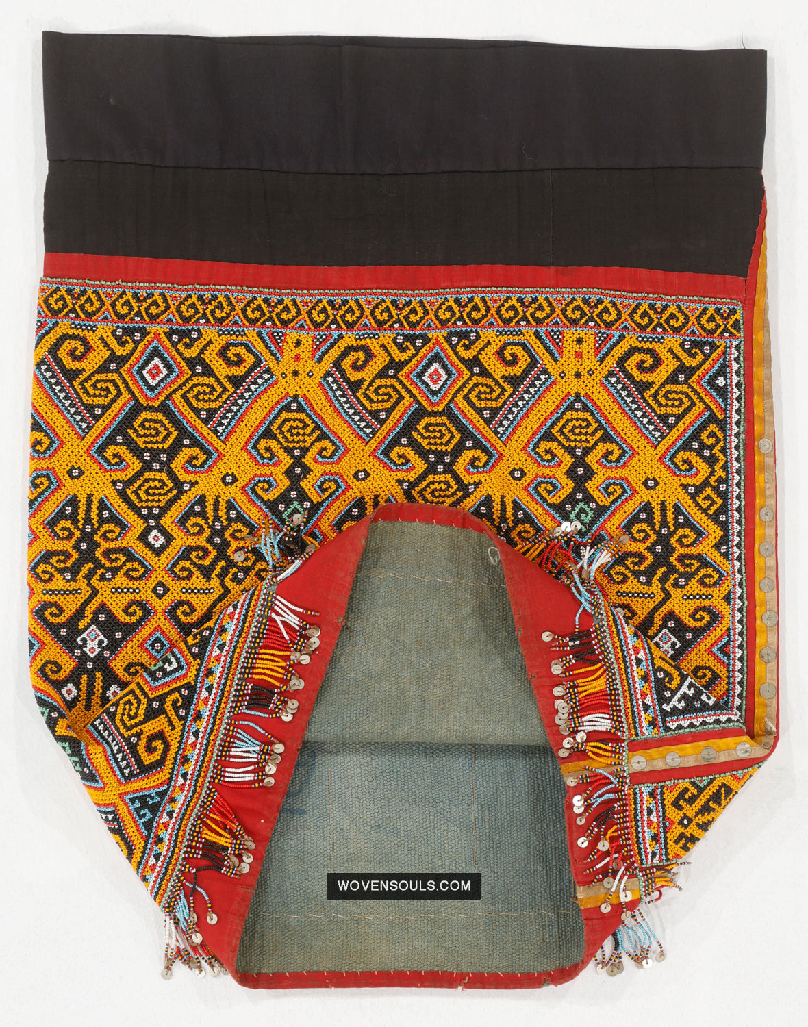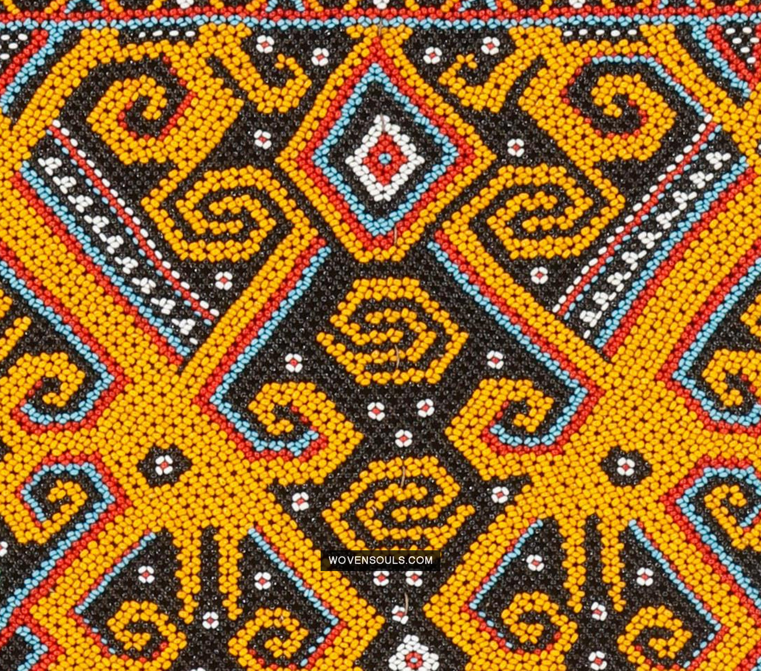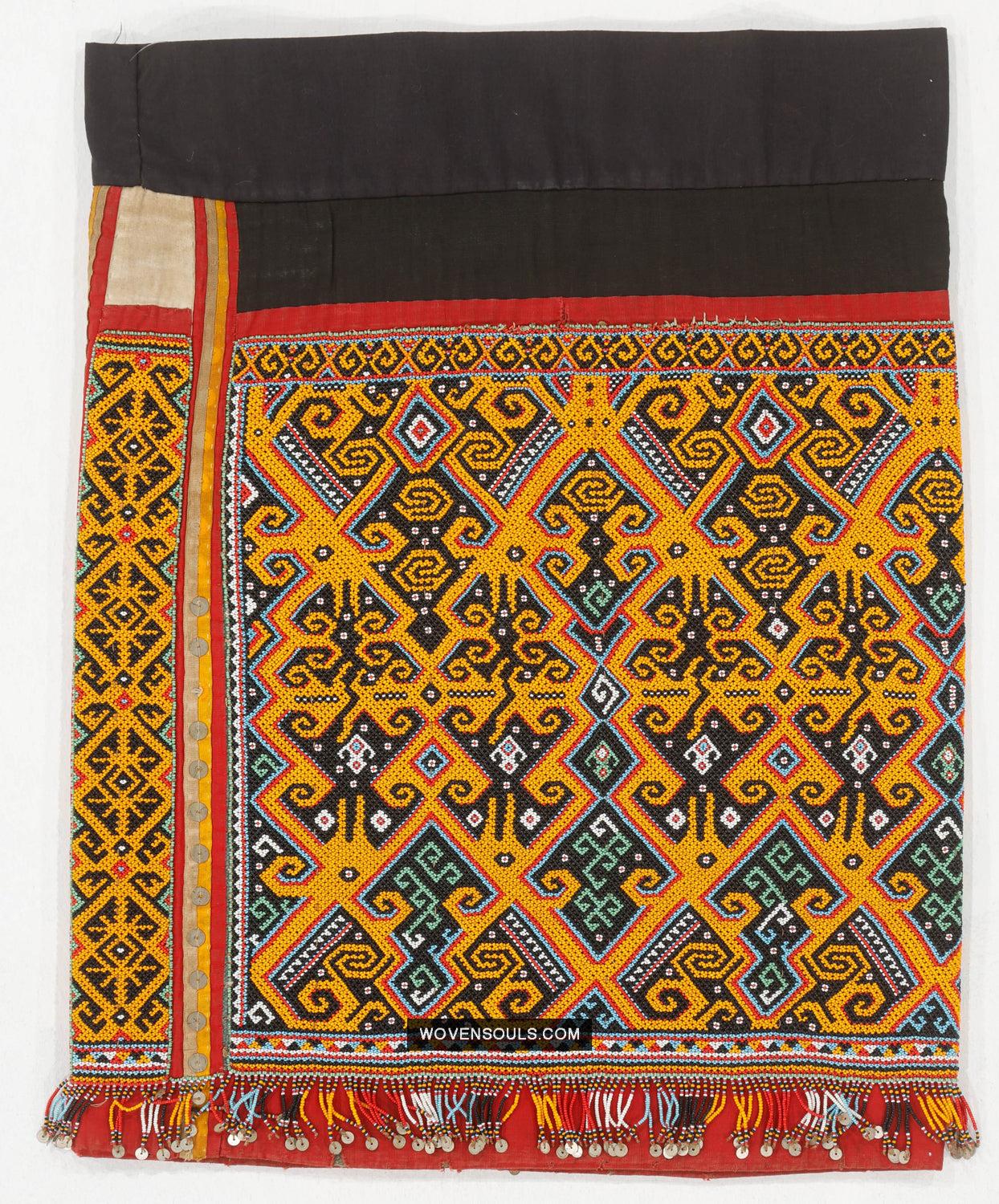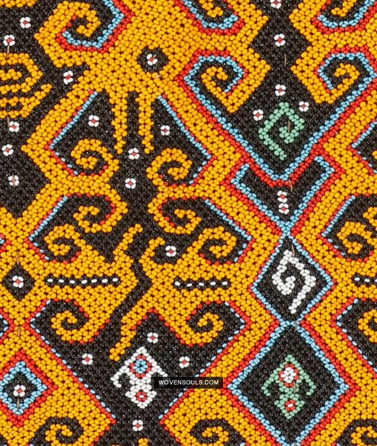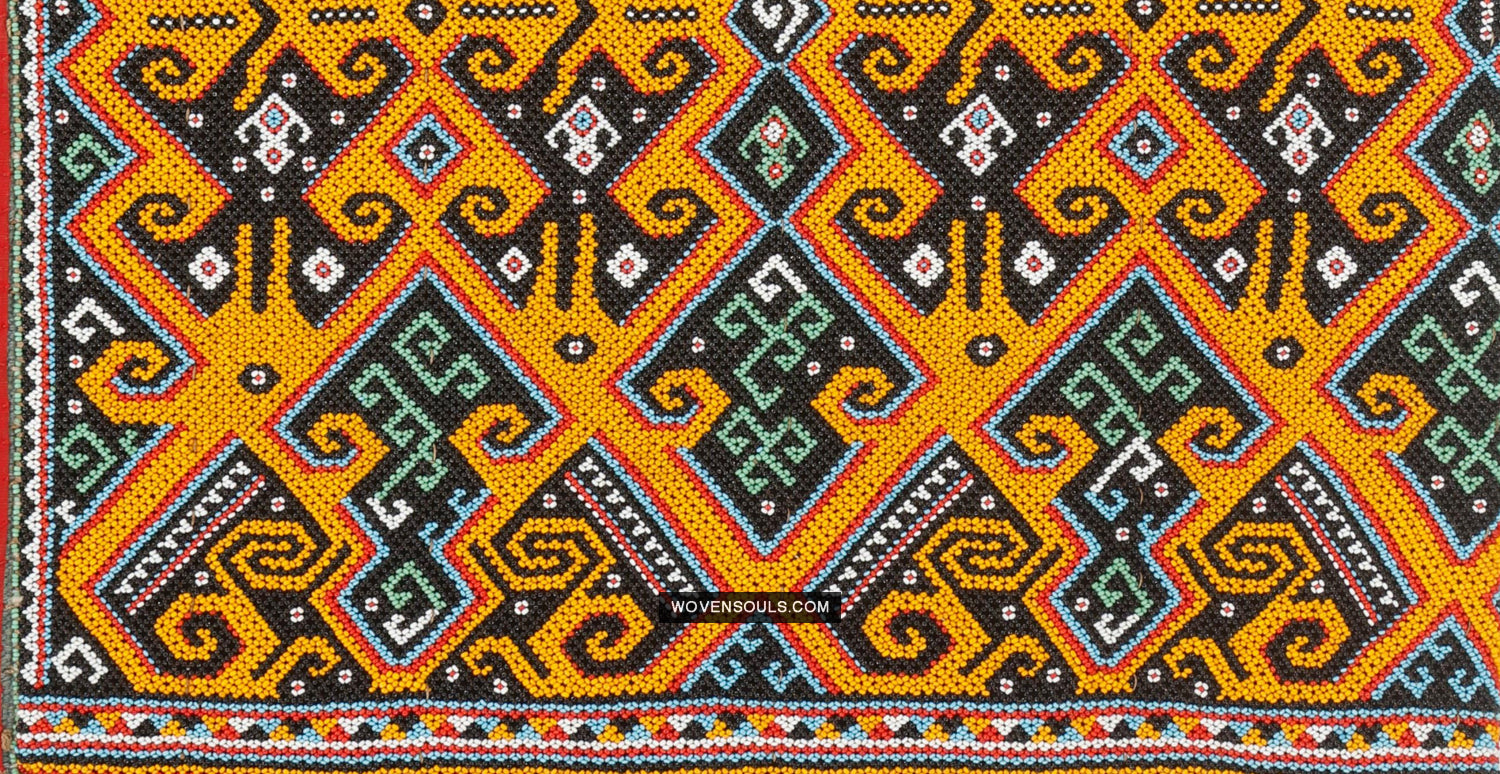 Maloh People, West Kalimantan, gonna di perline di Borneo - potente motivo spirituale. Perline, paillettes e conchiglie abbellimenti sul cotone commerciale. I Maloh indossavano gonne come questa in occasioni festive e cerimoniali: nascita, matrimonio, morte, raccolti e motivi di spirito forti come questo erano limitati a quelli nei vertici della società.