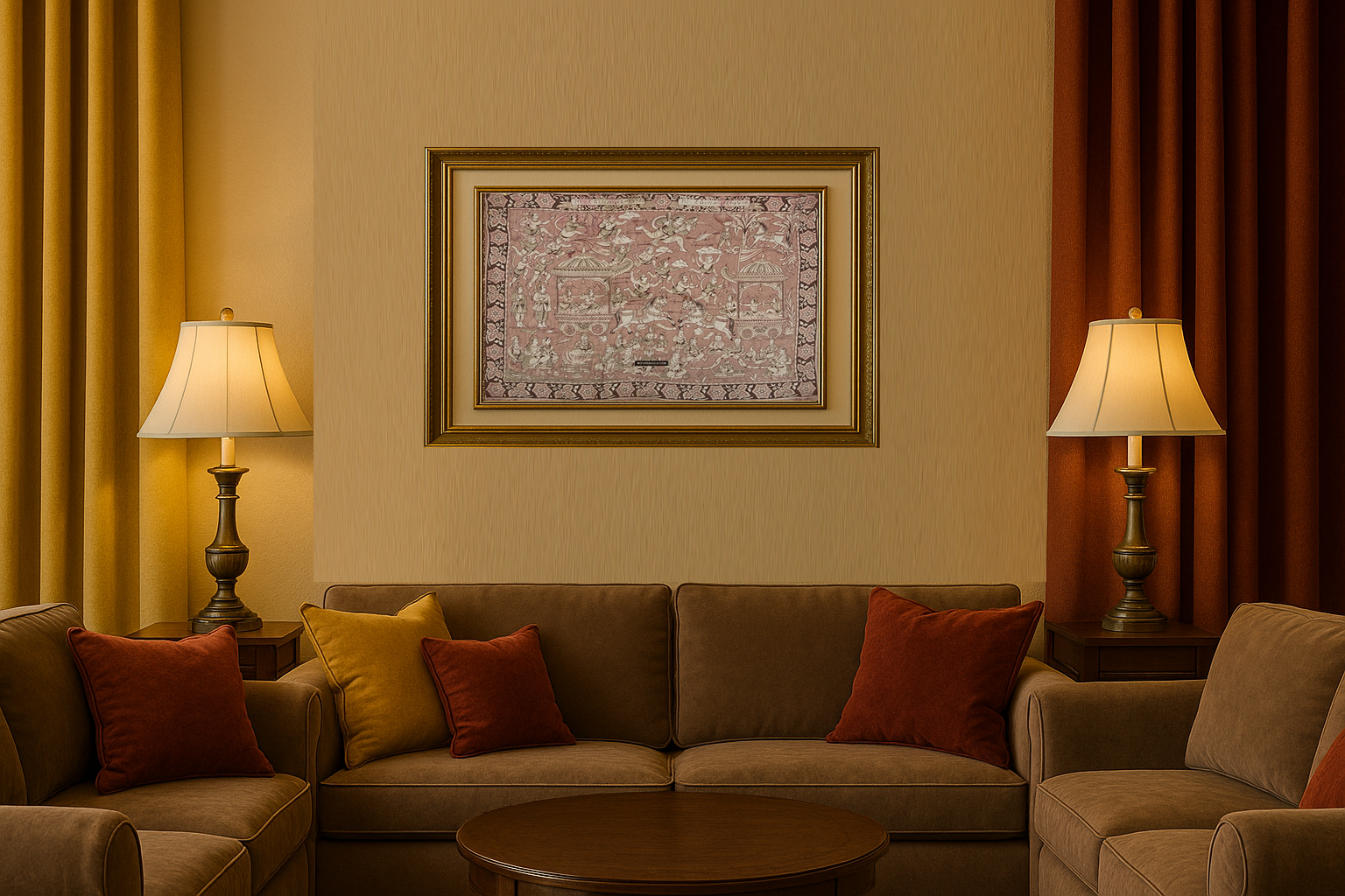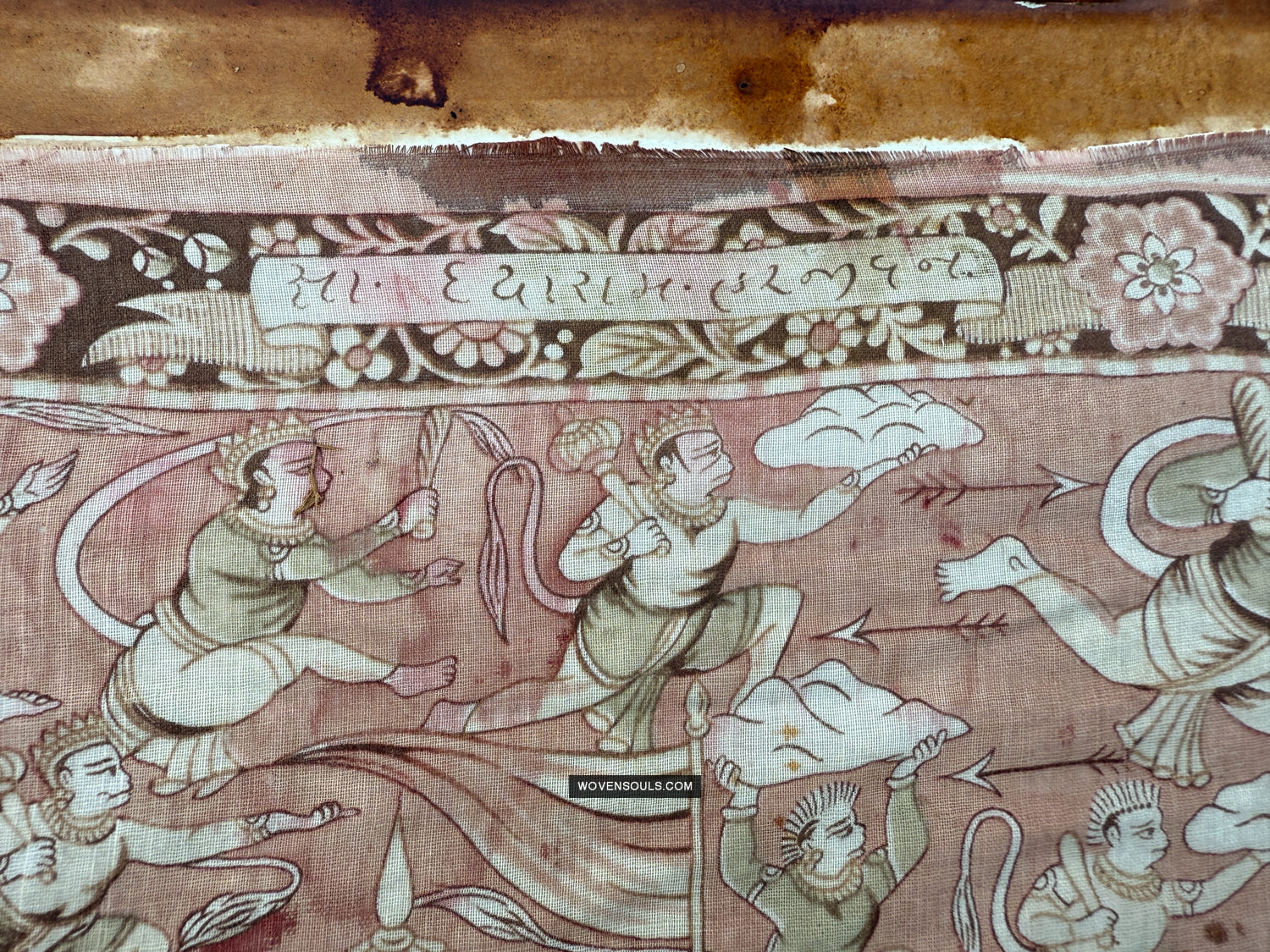È molto probabile che si tratti di un lavoro Kalamkari disegnato a mano. La scrittura nel pannello in alto è nella sceneggiatura di Gujarati, quindi questo è probabilmente un predecessore della bella Kalamkari prodotta lì ancora oggi. [Le opere attuali sono tuttavia realizzate con penne più spesse mentre questa opera d'arte è con una penna molto più fine. [Nei batik indonesiani che la penna ha preso ha un numero associato ad essa che si riferisce ai finesi - quindi una penna Cantik "0" è la migliore disponibile].