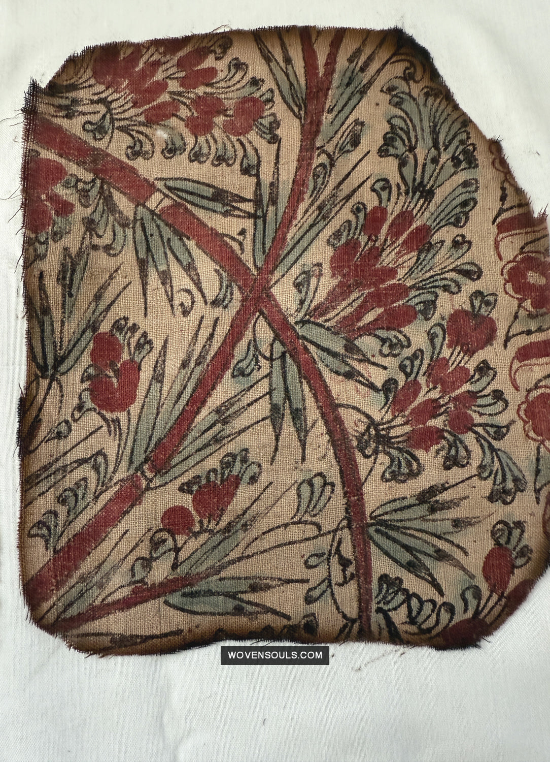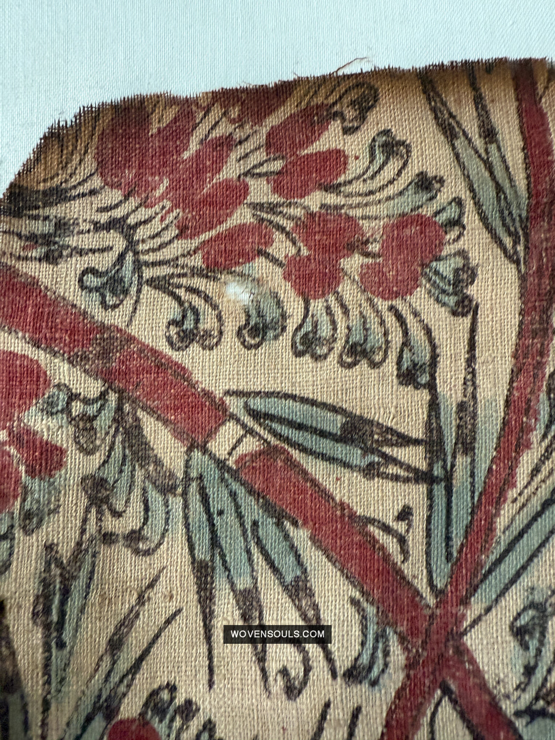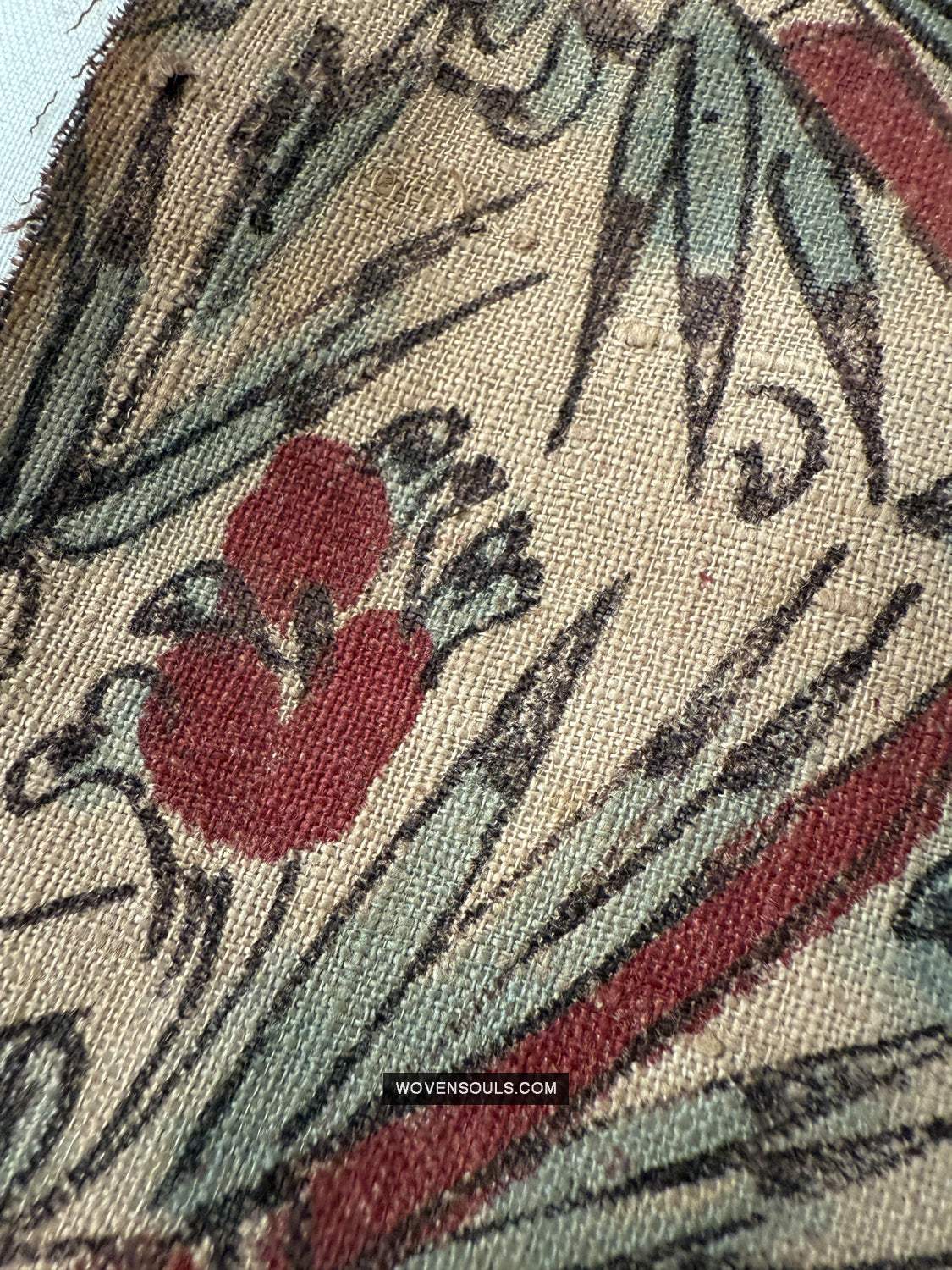 Questo frammento è stato salvato da un incendio, quindi ha segni di ustioni presenti. Buchi e macchie. I bordi nemmeno. Questo frammento è una delle numerose sezioni che sono state salvate dalla stessa stoffa colpita dal fuoco.