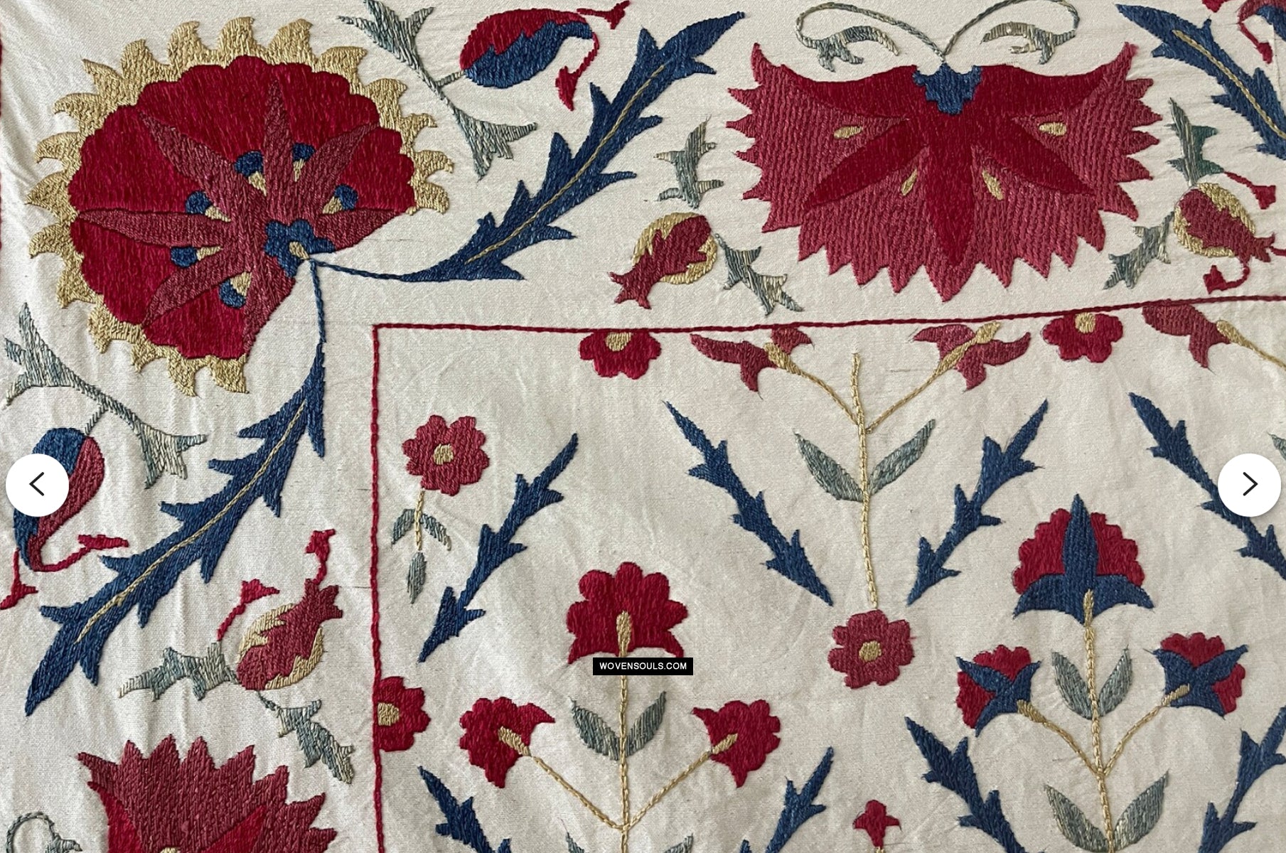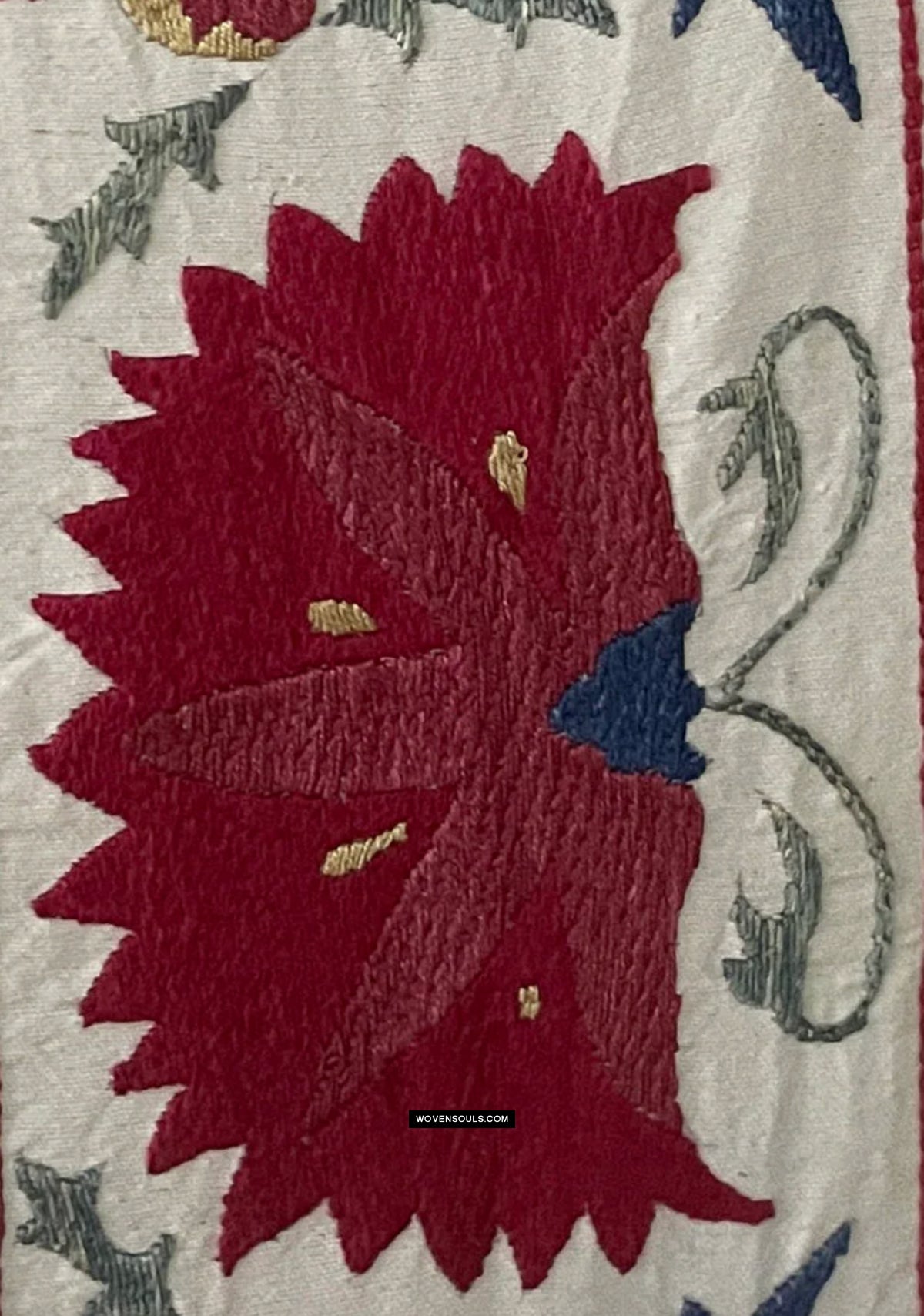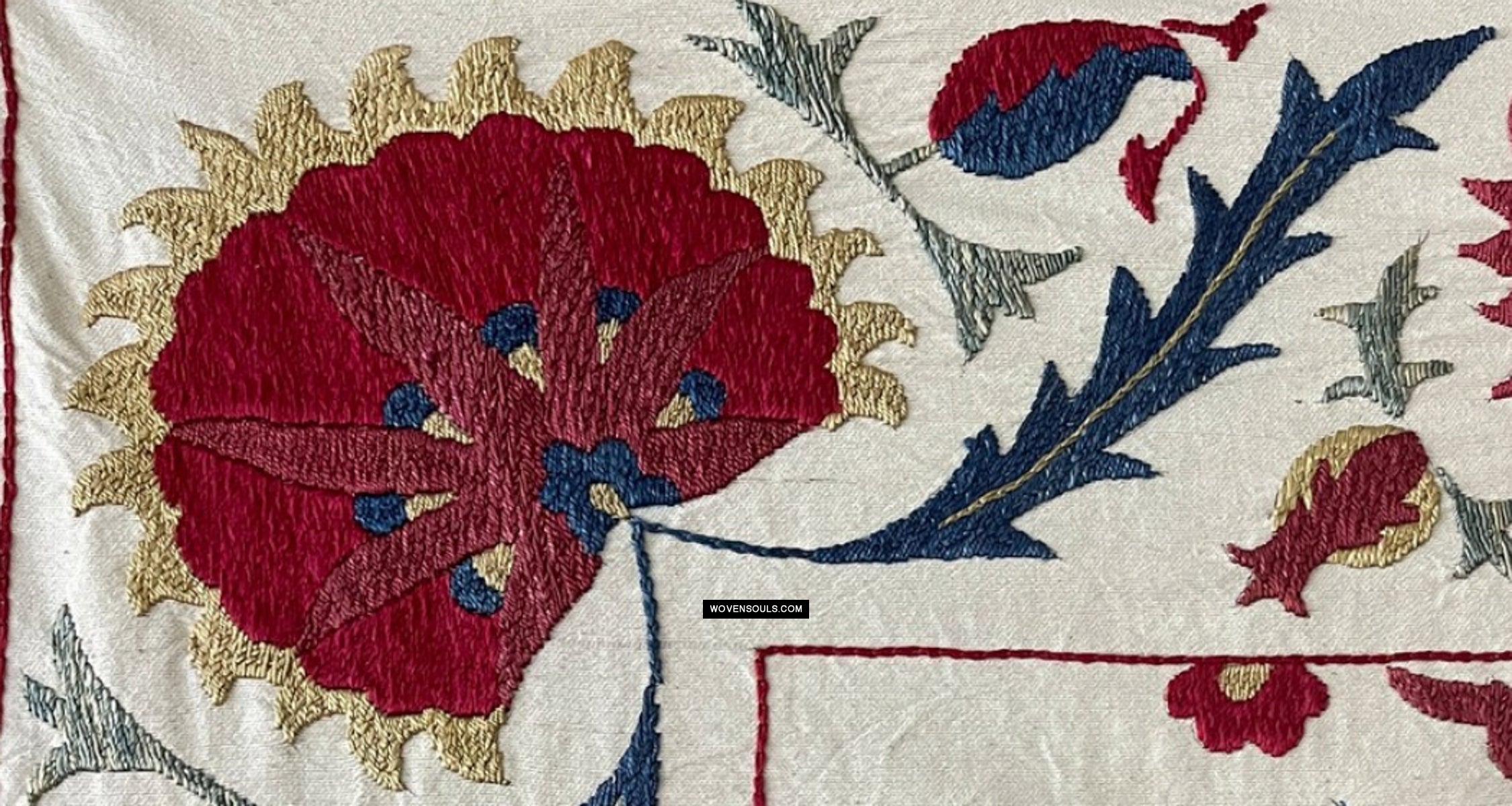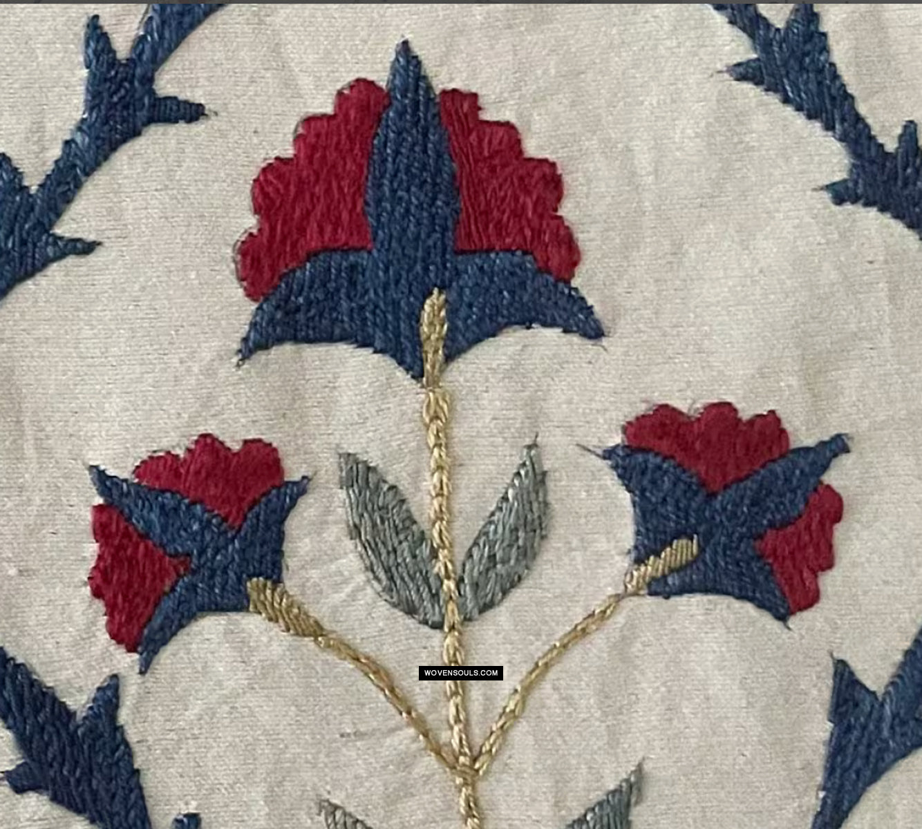 Le opere tessili di "Suzani" sono talvolta viste con ricami a catena - secondo me che Stitch non è così attraente come quello usato in questo pezzo. Il punto usato qui è denso e piatto e sembra un secondo strato bloccato sul panno di base. L'artigianato è piuttosto sorprendente in tali pezzi.