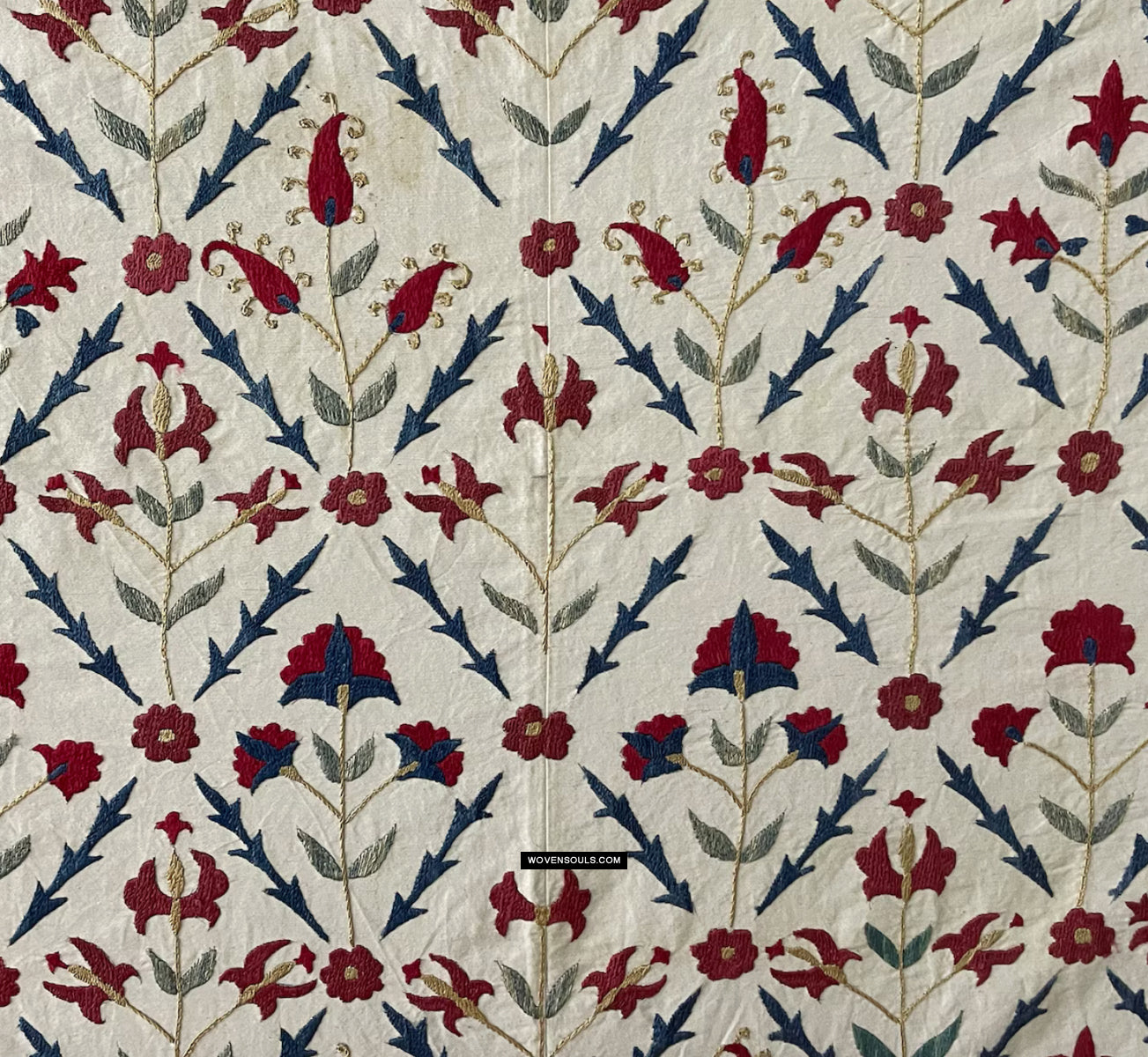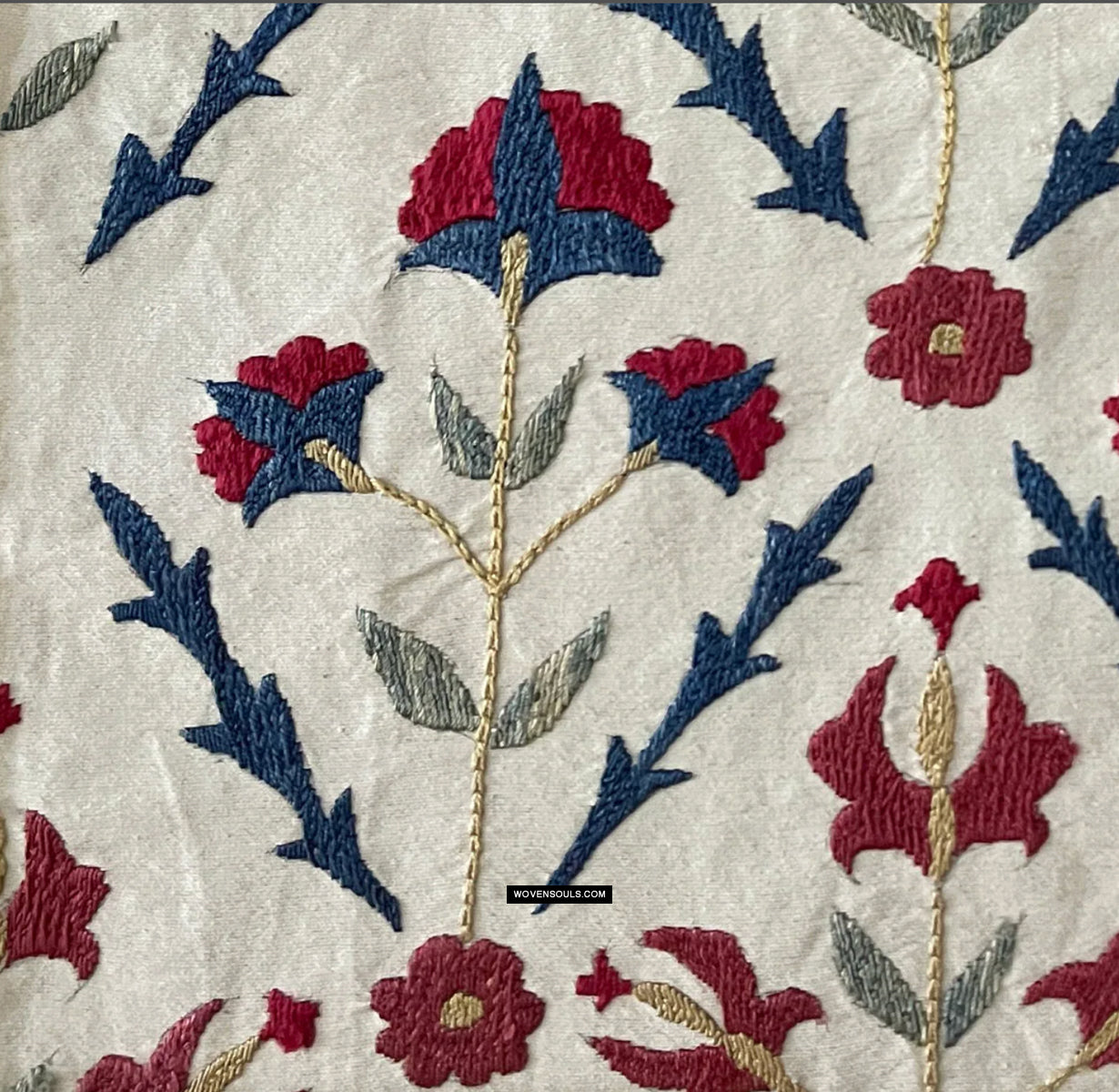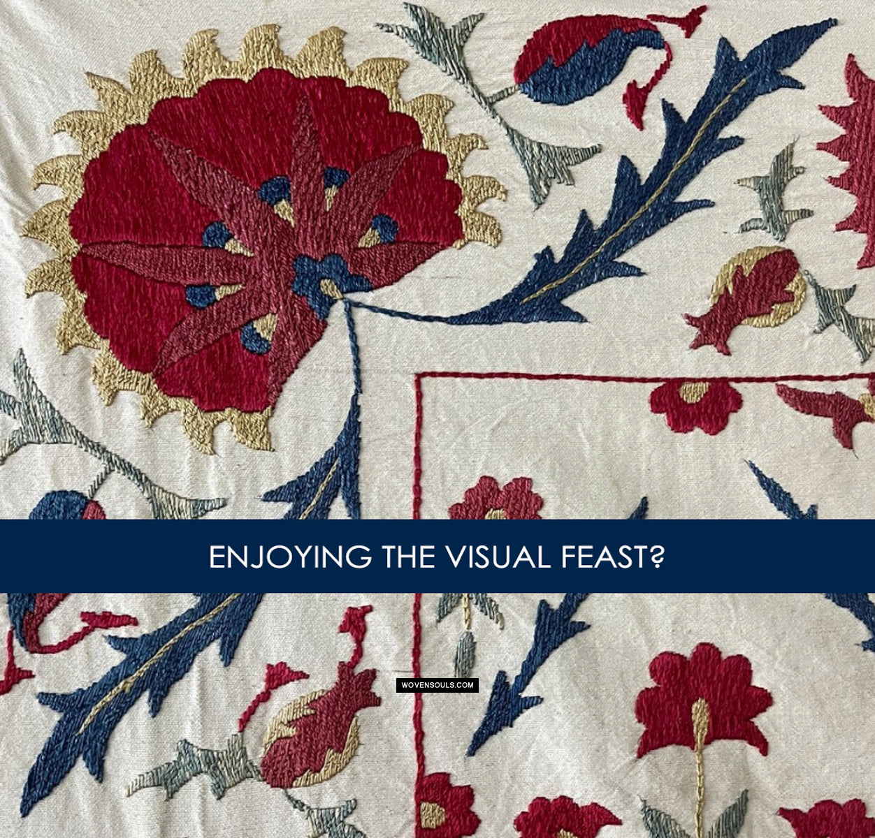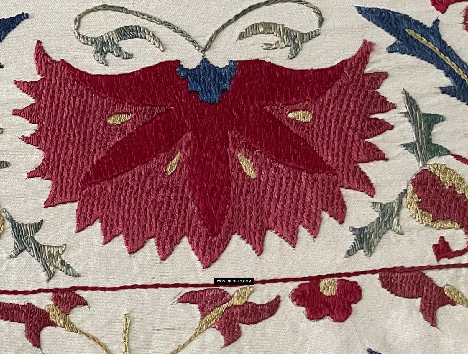 Le opere tessili di "Suzani" sono talvolta viste con ricami a catena - secondo me che Stitch non è così attraente come quello usato in questo pezzo. Il punto usato qui è denso e piatto e sembra un secondo strato bloccato sul panno di base. L'artigianato è piuttosto sorprendente in tali pezzi.