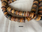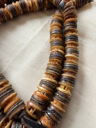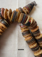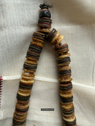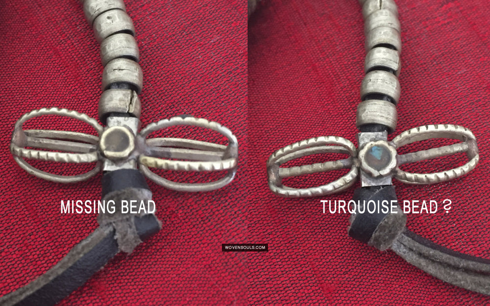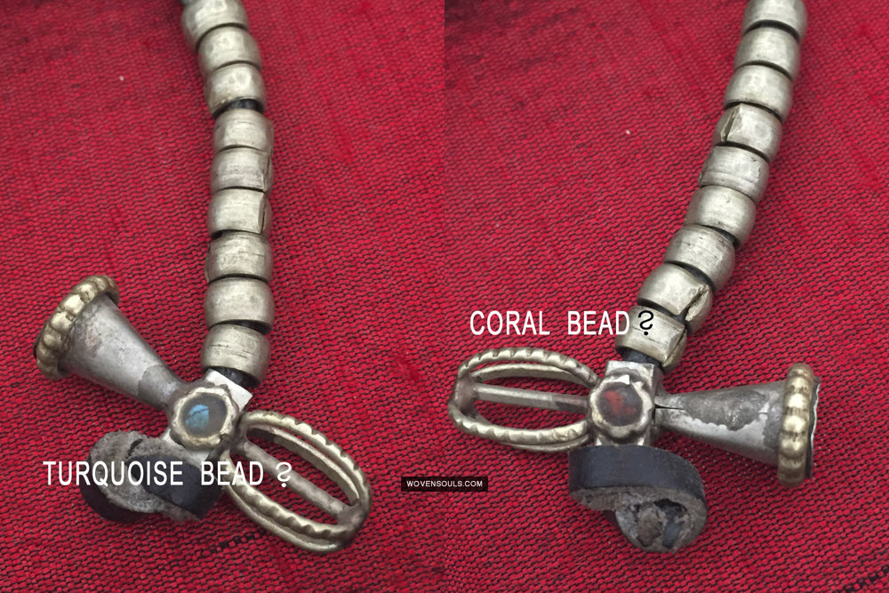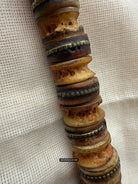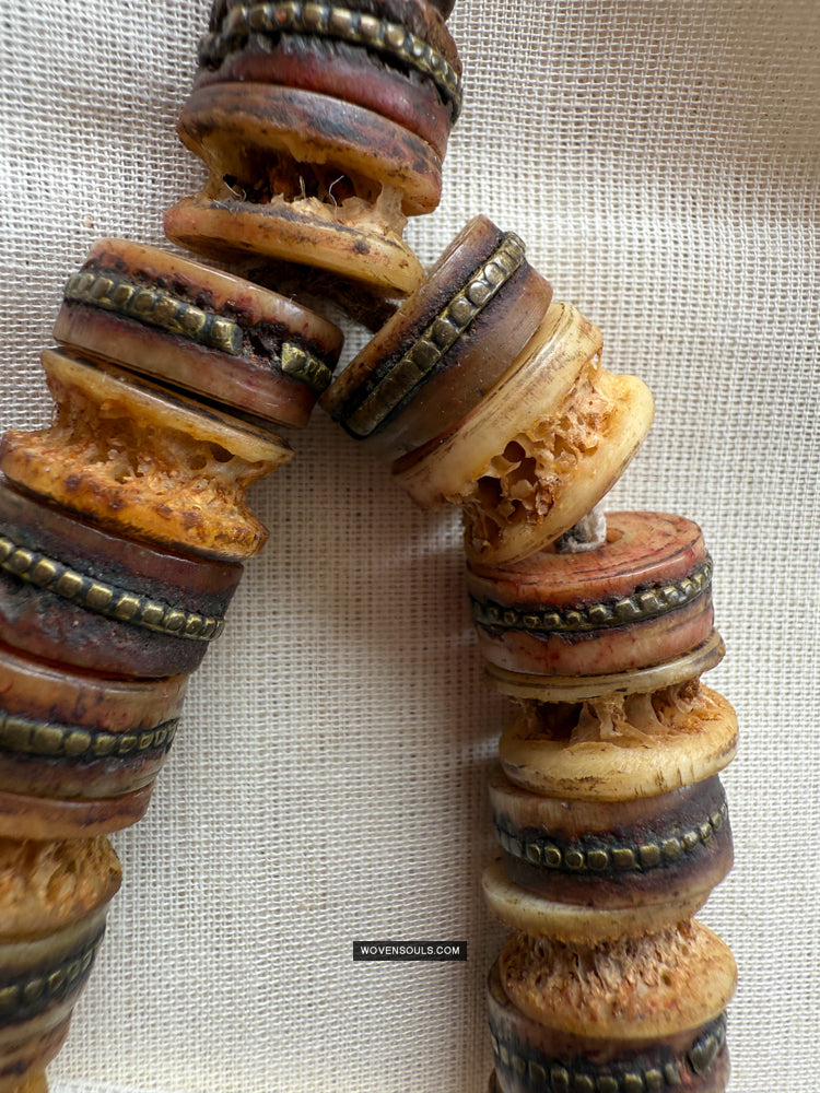 Many beads have been decorated with a metal ring. It appears that many of the beads were decorated with some red / blue clay paste that has now fallen off over decades of usage. Remnants remain in a few beads. .