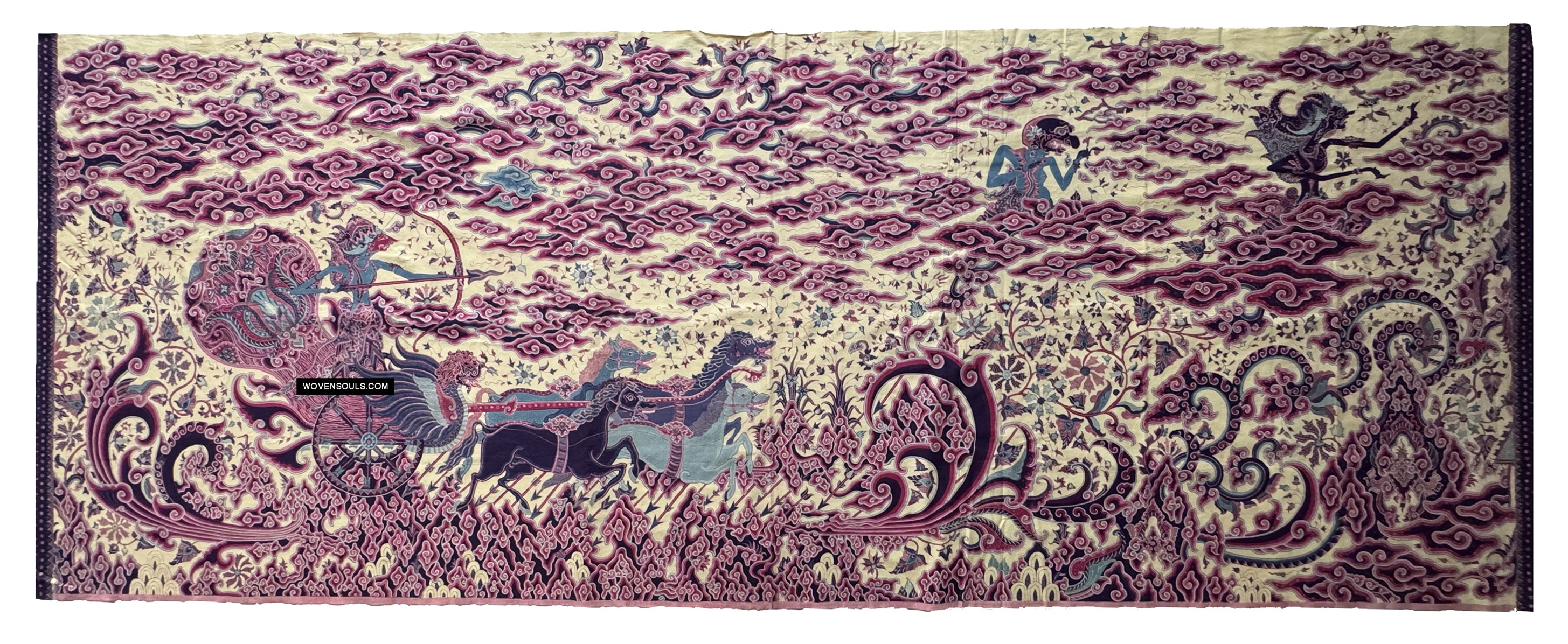 The depiction of the clouds (mega mendung) is typical of the batiks of Cirebon in Java, Indonesia. Also seen in the bottom right corner is the 'wadasan' motif - representing a broken coral rock - an ornamental architecttural feature seen only in Sunyaragi Cirebon in Indonesia.